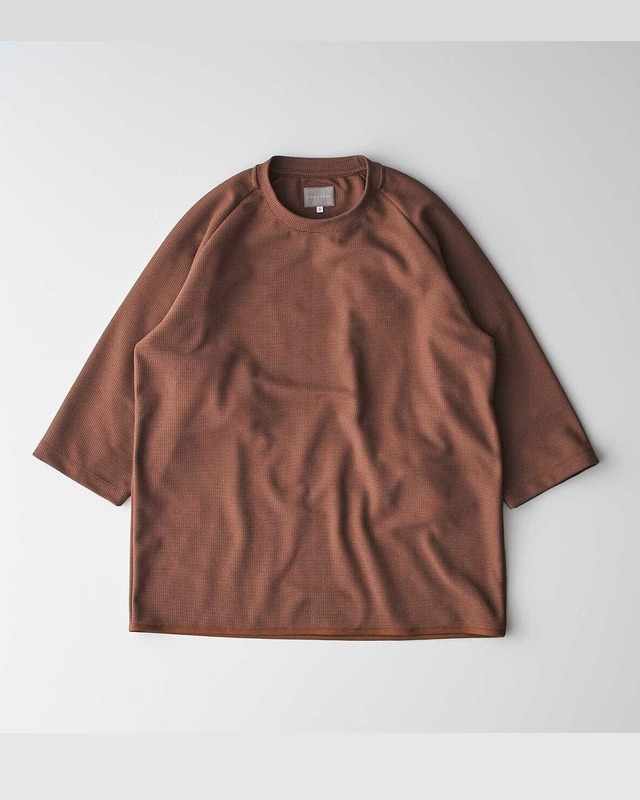 カノコ編みのように凹凸に編まれたポリエステルブレンドのコットンニットを用いた七分袖のTシャツ。スーピマコットンの中でももっとも繊維長が長く強度に優れているAlbini社の超長綿CORCORANに、ポリエステルをブレンドすることで吸水速乾性を持たせました。軽量で肌離れも良く少し細めの七分丈の袖は、一枚着用は勿論のこと、上に羽織を着用しても袖のゴワツキも無く、長引く夏の現代の気候にフィットした着用期間の長いアイテムとして重宝します。インナーとしての着用も想定し、裾をストレッチバインダー仕様にすることで、シルエットに締まりが出てスッキリとしたバランスを保っています。 COLOR/BRICK・IVORY SIZE/1・2 1 身幅55.5cm 身丈68.7cm 裄丈62.4cm 2 身幅58.5cm 身丈71.7cm 裄丈64.8cm MATERIAL/COTTON 55% POLYESTER 45%