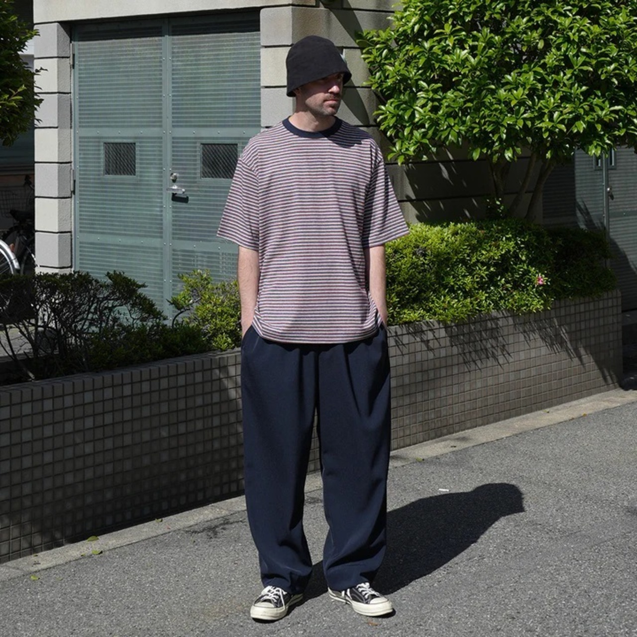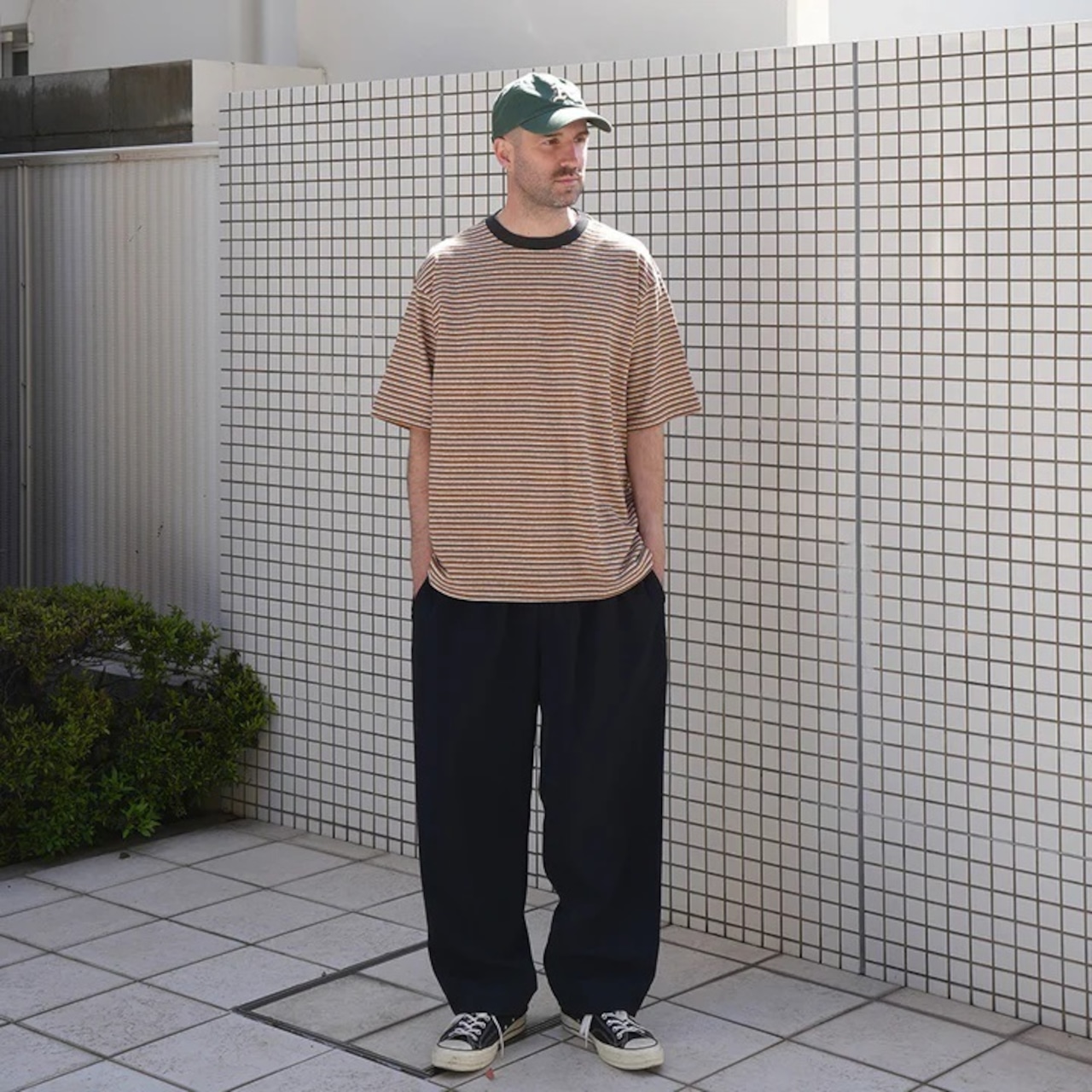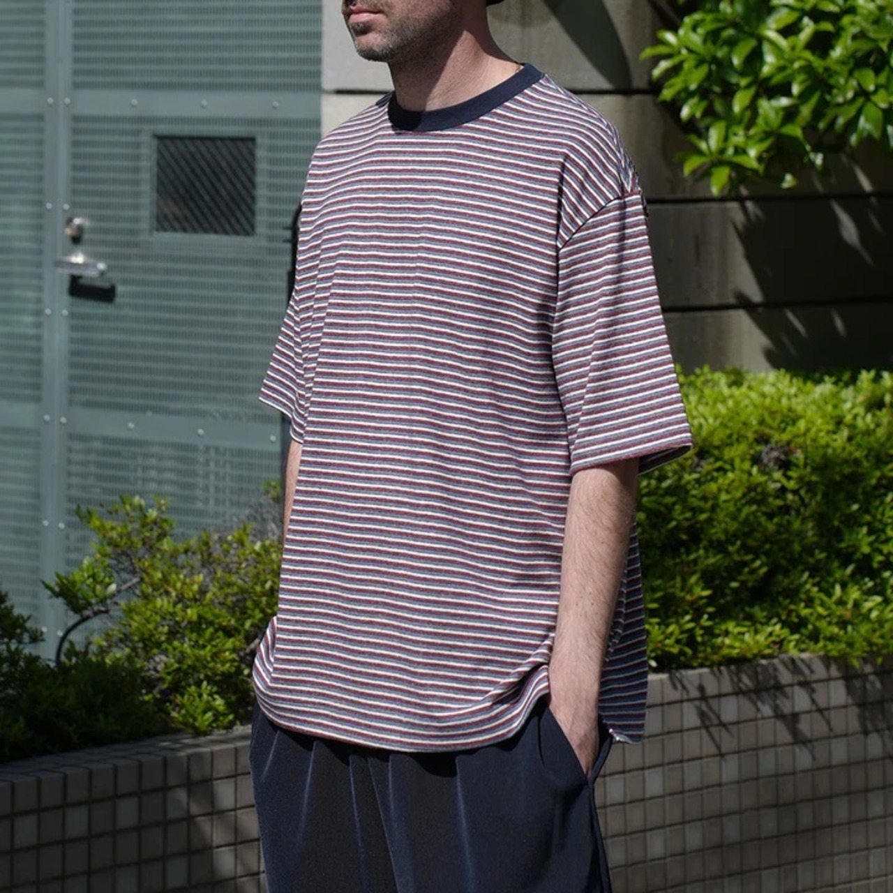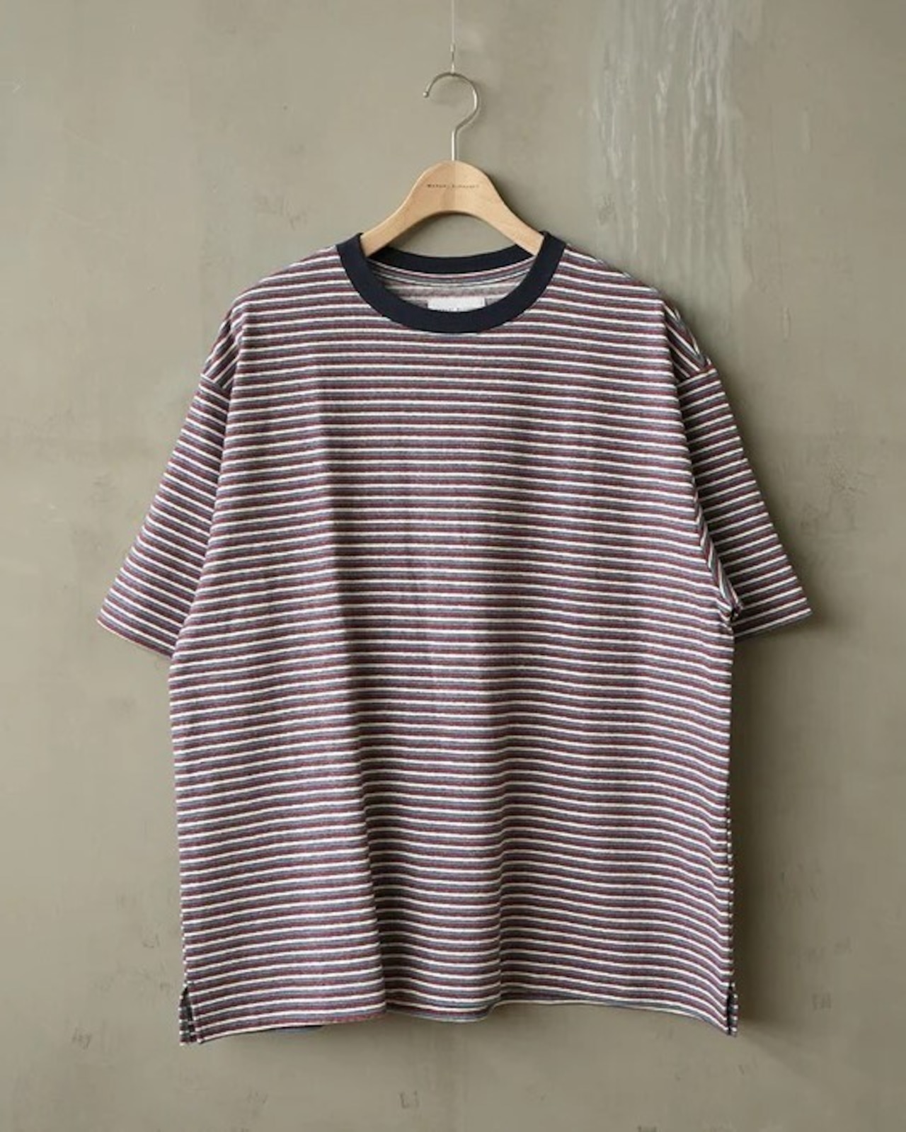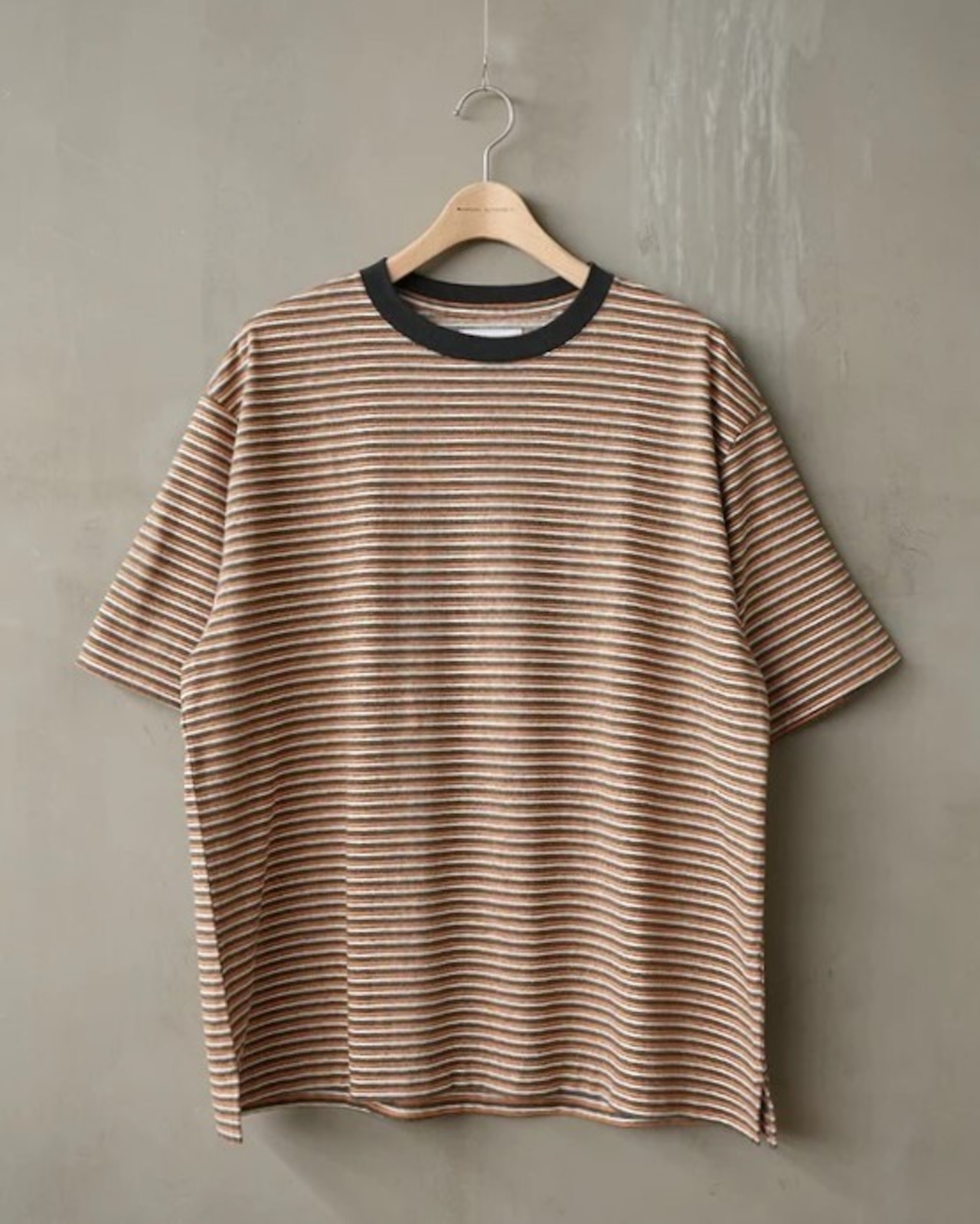 落ち綿を使用したリサイクル糸と2層の生地ならではのムラ感を活かしたヴィンテージ感あふれるマルチボーダーの半袖TEE。紡績工程で取り除かれている短い繊維をリサイクル混紡することにより環境にも優しく、プレーティングすることにより裏の生成の色がランダムに表面に出ることで表情感のあるマルチボーダー天竺を使用。シルエットはゆったりとしつつも首回りをほどよくすっきりさせることで遊び心のあるボーダー柄ながら大人っぽく着用いただけるよう配慮しました。
