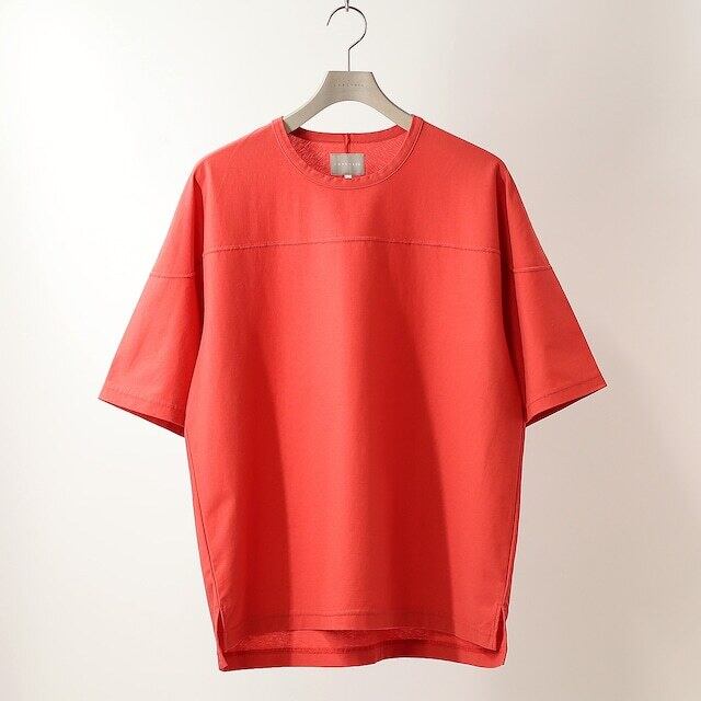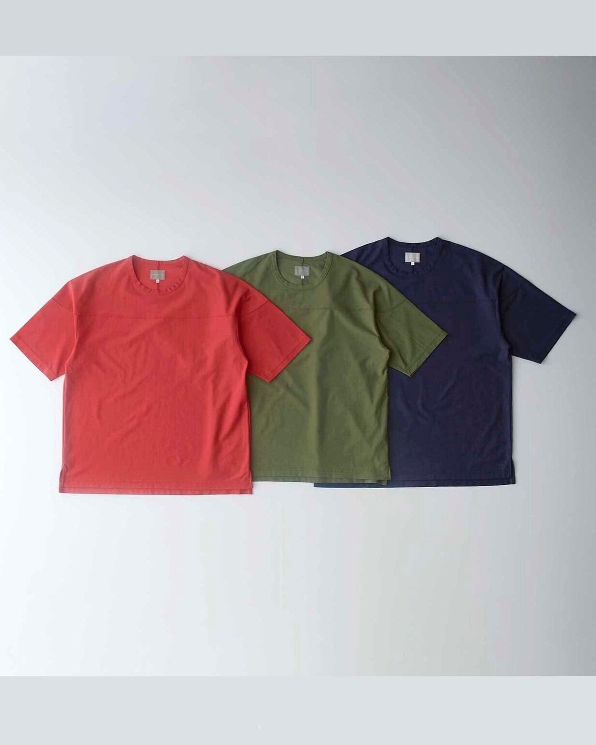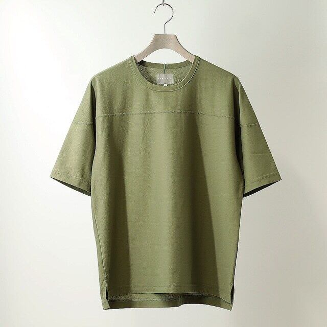 コットンリネンの糸とポリエステルを交編し、適度な軽量感がありながらも織物のようなハリ感を持ち合わせた素材を用いたフットボールT。往年のフットボールTのディテール、カッティングを取り入れながらも、スポーティーになり過ぎない素材であったりカッティングの巾や高さ大きさなどを絶妙に調整しました。程良く詰まったクルーネックに適度なゆとりのあるリラックスしたシルエットと併せて、軽さとドライタッチな質感の素材が涼しさを感じさせます。