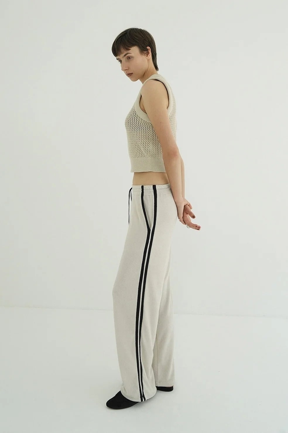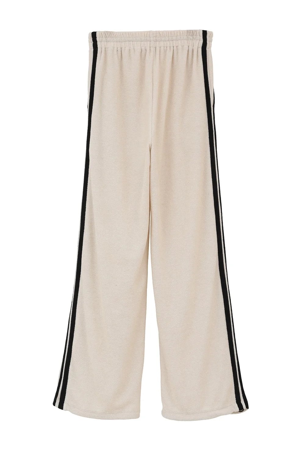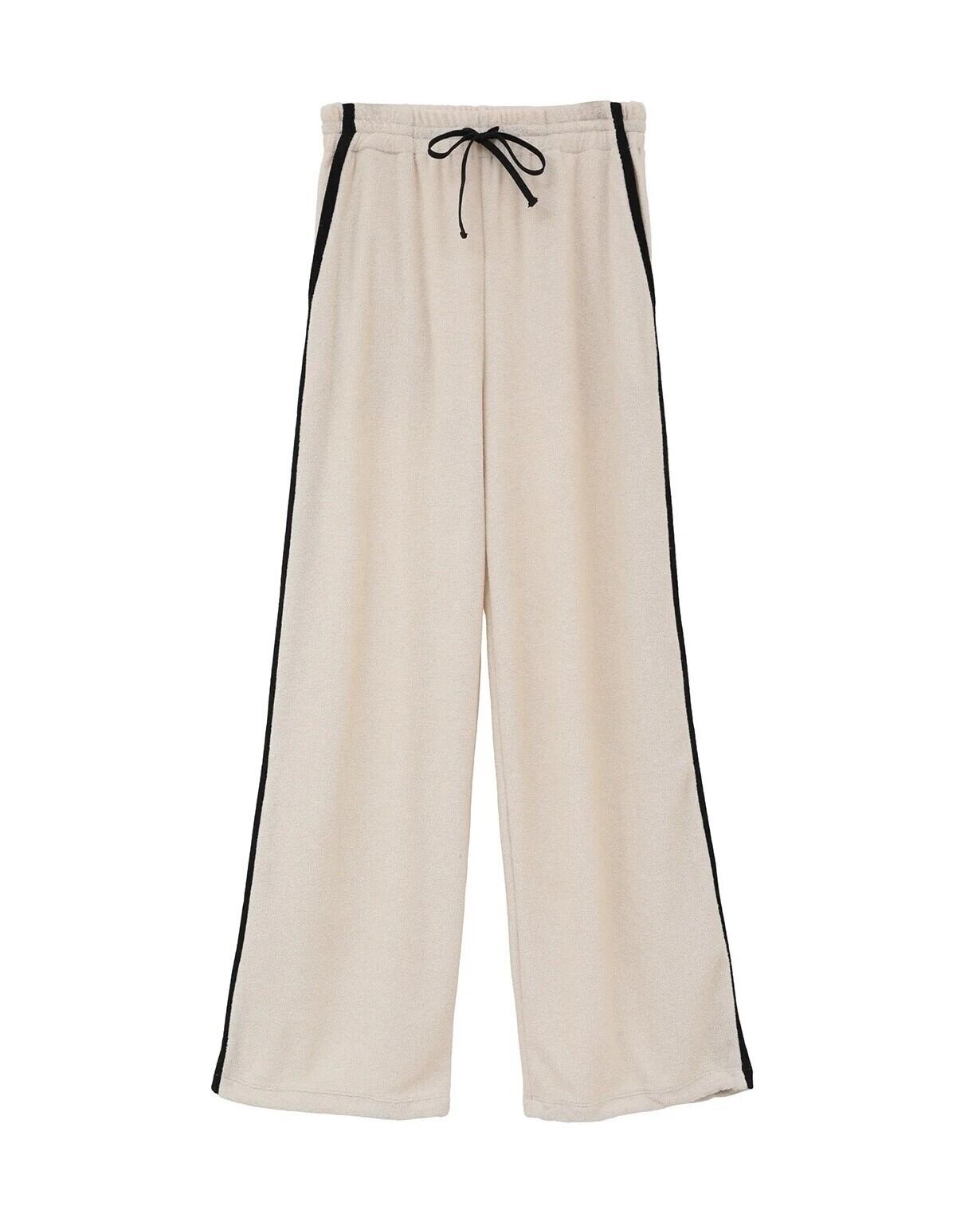 しなやかで肌馴染みの良い、上質な日本製パイル素材を使用したリラックスパイルラインパンツ。コットンとポリエステルの染め分けにより、色に凹凸感を持たせたユニークなデザインが特徴的です。脚のラインをスッキリと長く見せる、ウエスト上辺まで入った切り替えラインと、裾に施したドロストディテールで、ワイドにもバルーンにもシルエットを自在にアレンジ可能。ウエストはゴム仕様で、さらに紐で調整ができるため、リラックス感を持ちながらもスタイルアップを実現します。