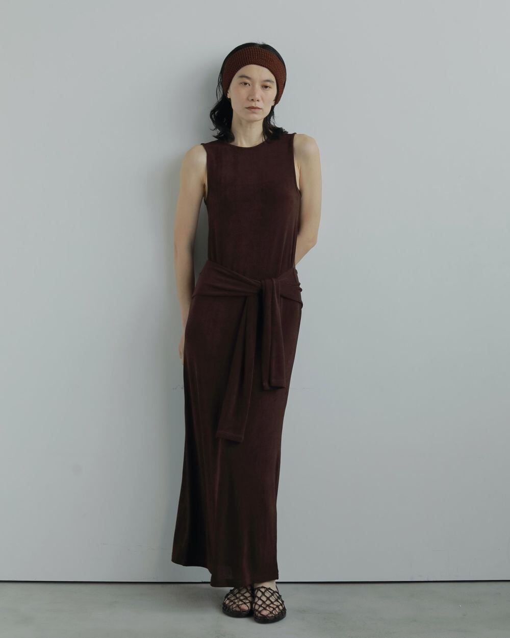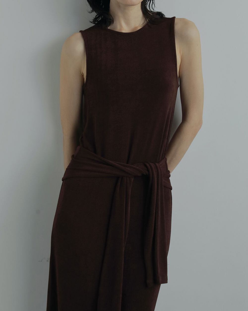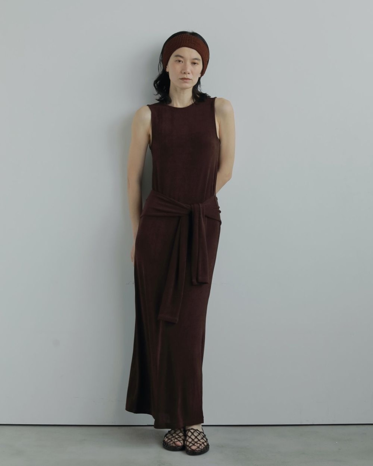 落ち感と光沢のあるジャージー素材を使用したワンピース。カーディガンをレイヤードしたようなウエストデザインがポイント。ぎゅっと絞ることでお好みの丈に調整も出来、1枚でコーディネートが完成します。シワにもなりにくい、サラッとした着心地の素材で、旅行などにもおすすめの一着です。