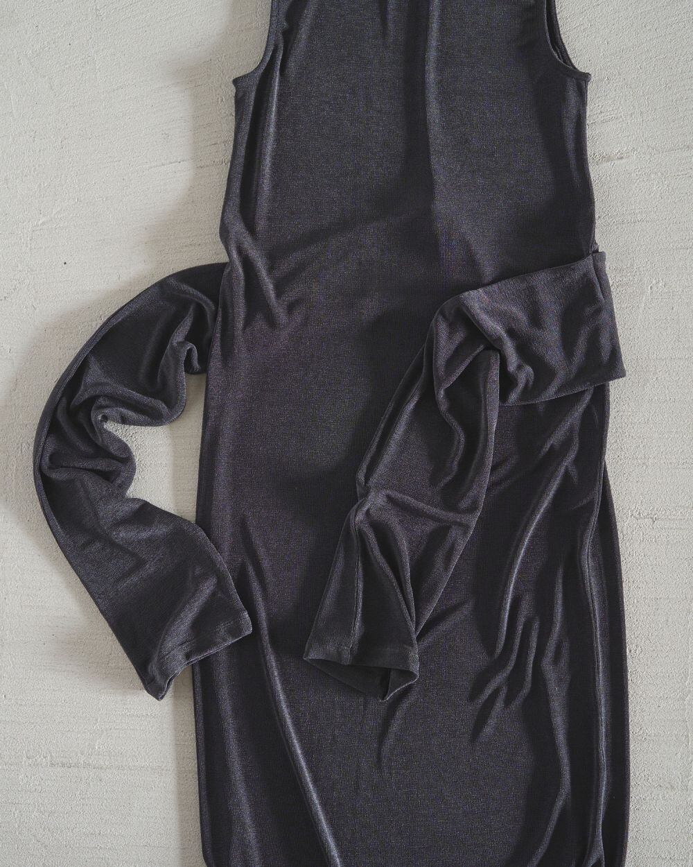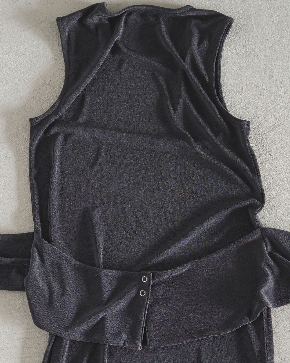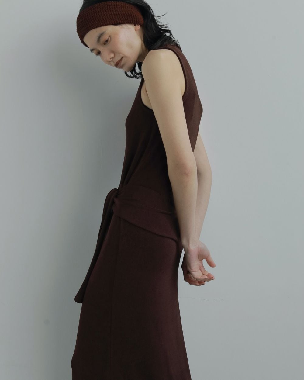 落ち感と光沢のあるジャージー素材を使用したワンピース。カーディガンをレイヤードしたようなウエストデザインがポイント。ぎゅっと絞ることでお好みの丈に調整も出来、1枚でコーディネートが完成します。シワにもなりにくい、サラッとした着心地の素材で、旅行などにもおすすめの一着です。