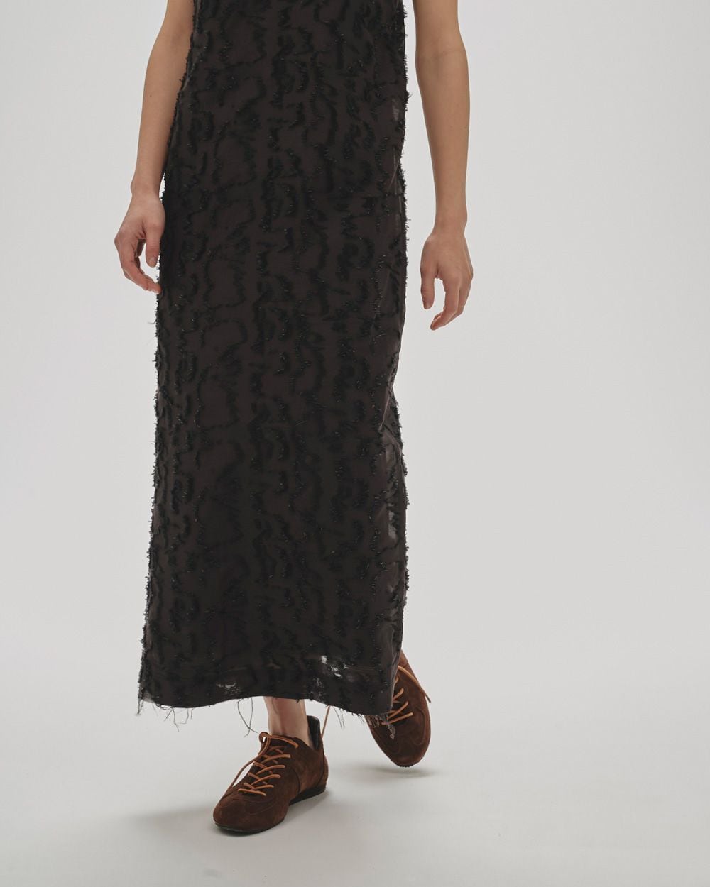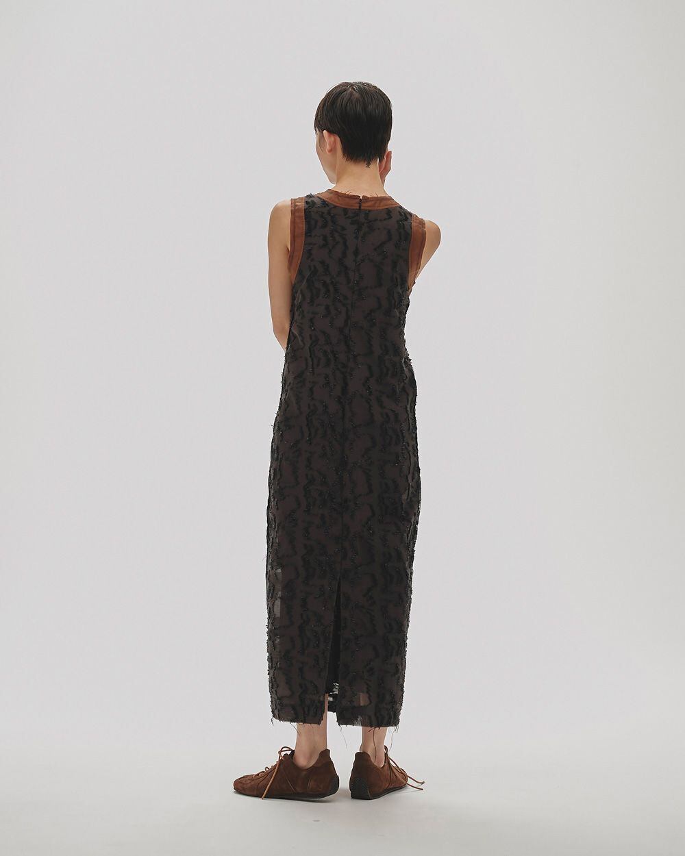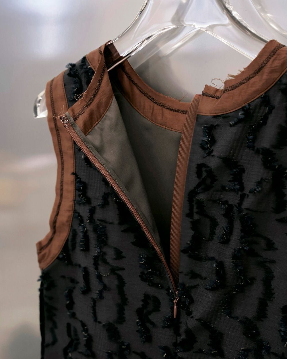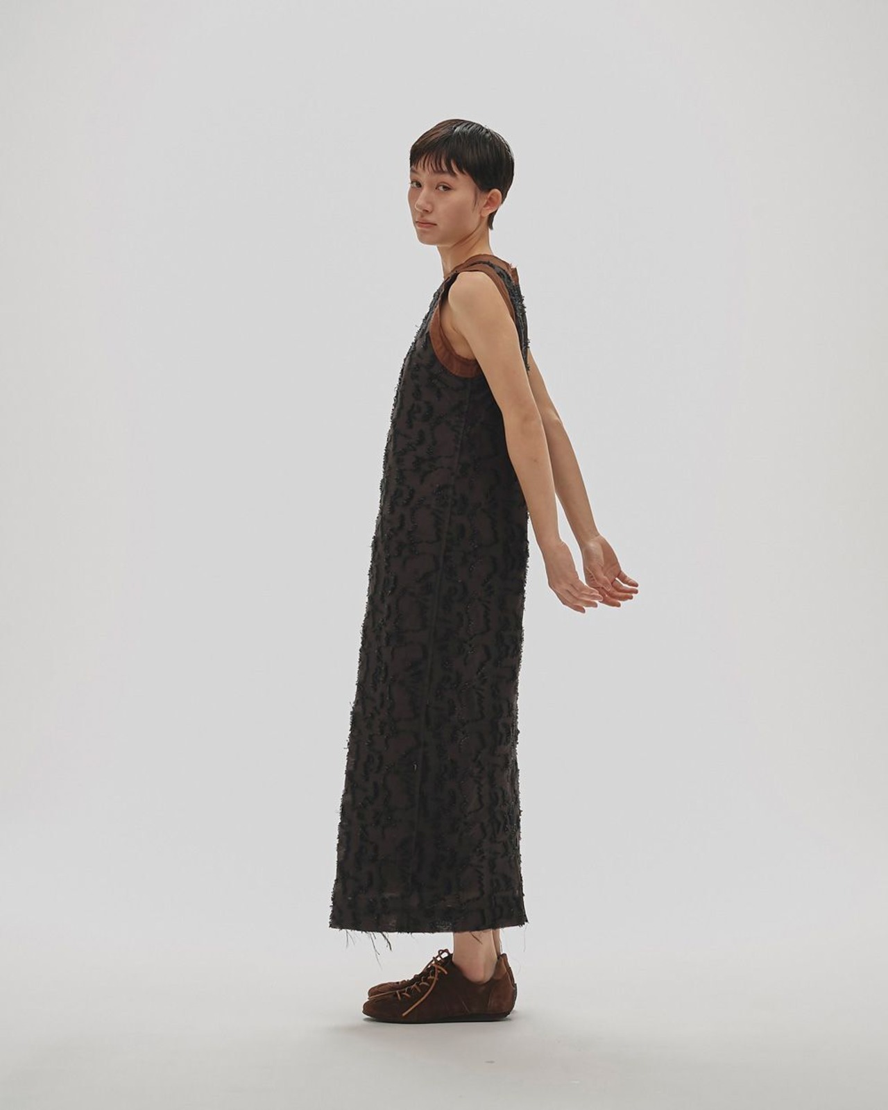 オリジナルのカットジャガード生地を使用したドレス。多色の糸が織りなす奥行きのある色合いとニュアンス柄が魅力です。アームホールや襟まわりには配色の別素材をあしらい、カットオフ仕様で抜け感をプラス。配色ステッチがほどよいアクセントに。一枚でさらっと着るだけこなれた印象に仕上がり、洗練されたムードを演出します。