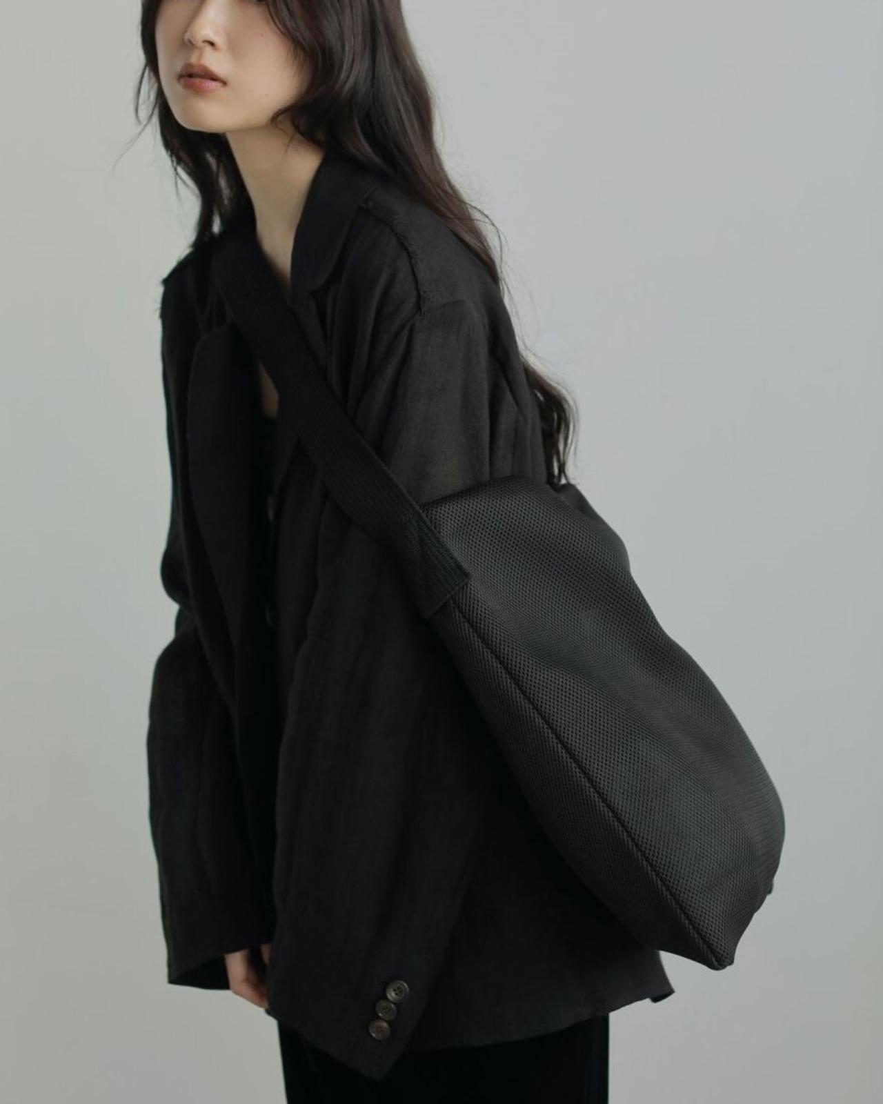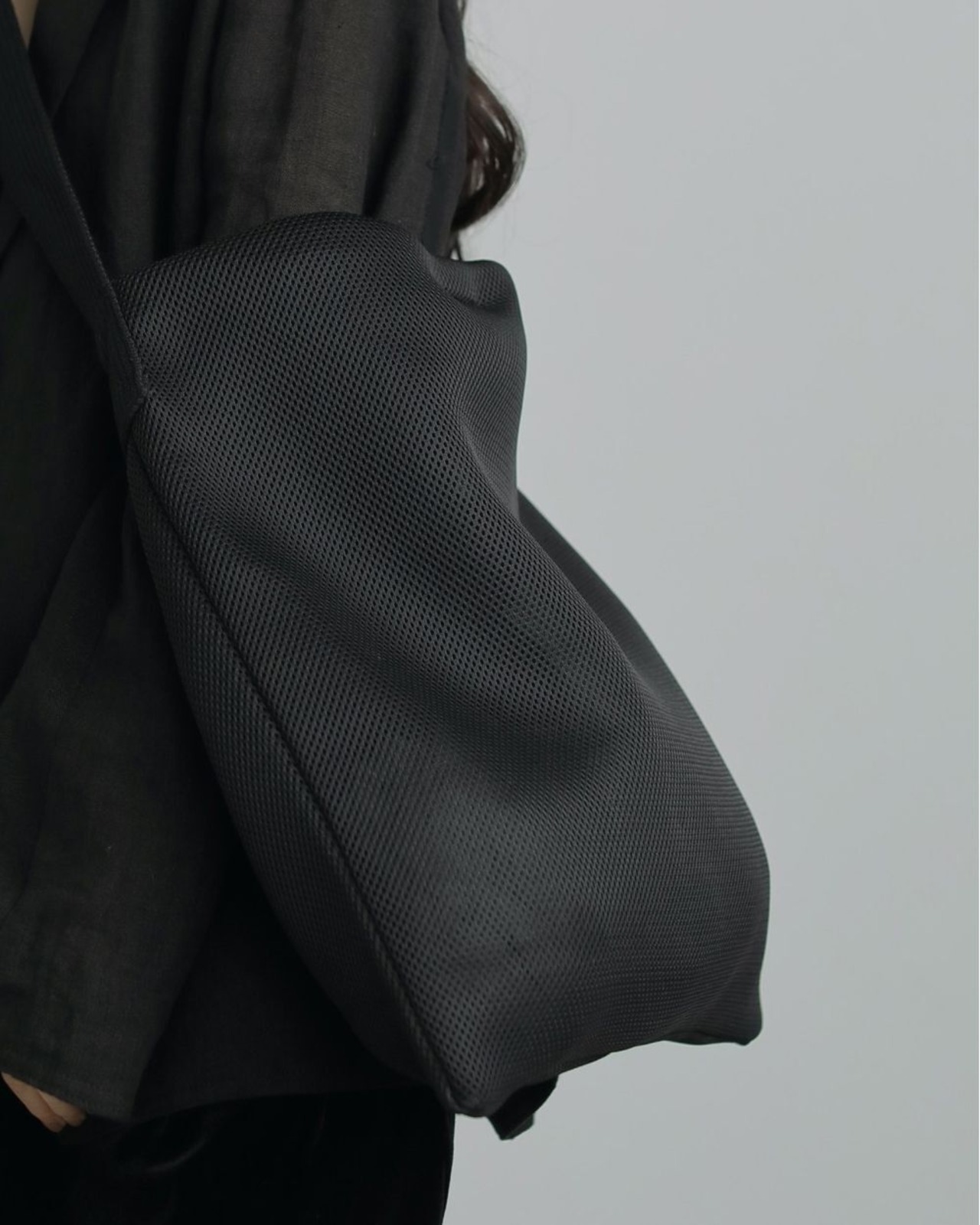 膨らみのあるメッシュ素材を使用したトートバッグ。ショルダー部分はしっかりとした肉厚のテープで、荷物を入れた際も安定感あるようにしています。ショルダートートとしてだけでなく、ラフに二つ折りして、クラッチ風に持つのもおすすめ。メッシュならではの軽さも魅力。内側にはミニポケット付きです。