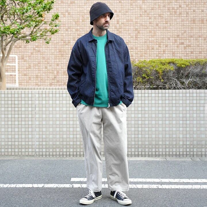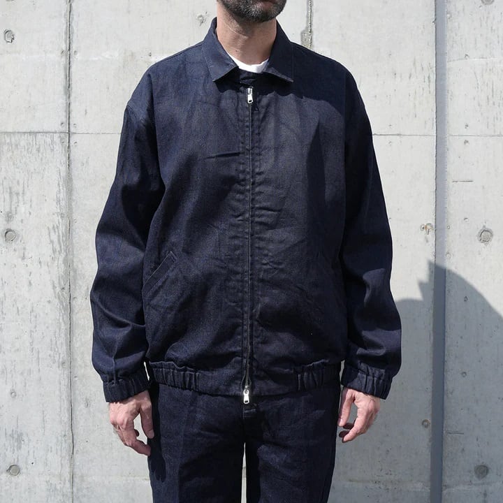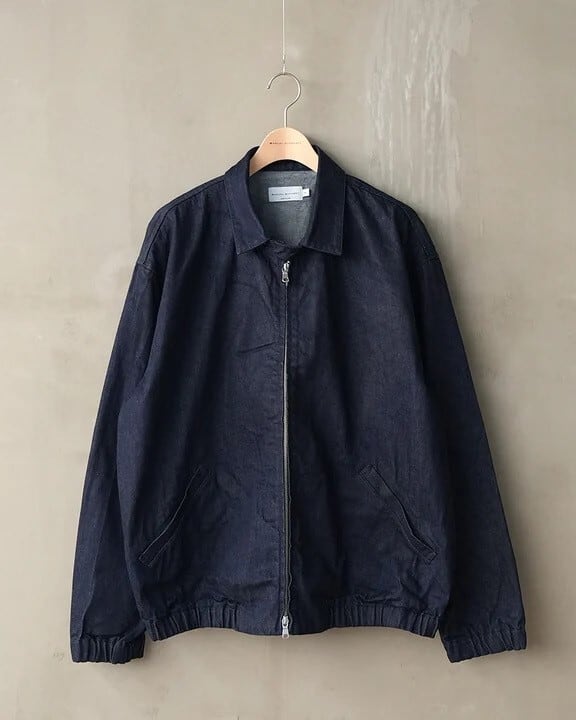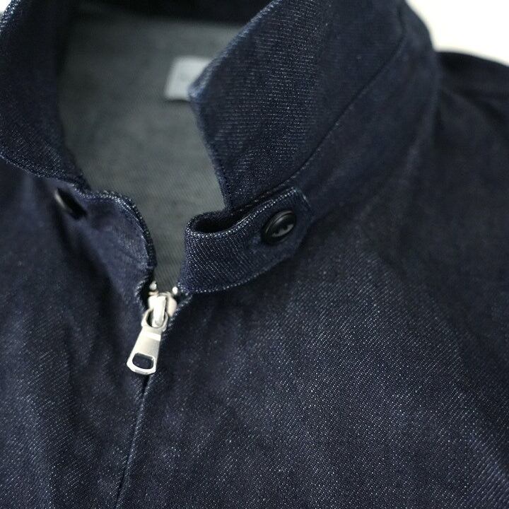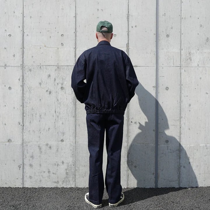 12ozデニムのスイングトップジャケット。ビンテージのスイングトップをモチーフに、仕様やサイズ感、付属を現代風にアレンジしました。ボリュームのあるシルエットはそのままに、ショート丈をややミドルに、また袖幅も膨らませ、野暮ったさを解消したシルエットに仕上げました。素材には12ozの弱ムラ糸のデニムを使用。あえてブリーチは入れず、ワンウォッシュに留め上品な雰囲気に。G-ジャン的な立ち位置で汎用性の高いアイテムです。