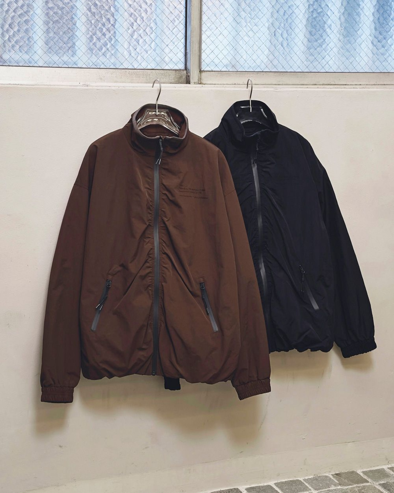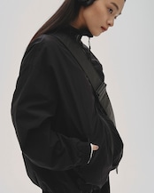 適度なハリのあるナイロン生地を使用したブルゾン。控えめな光沢感が特徴で、胸元のグラフィック刺繍や止水ファスナーがアクセントとなる一枚。裏地には柔らかなフリース生地を使用し、スタンドカラーで首元を暖かく包み込みます。軽やかな着心地とカジュアルなデザインがデイリー使いに最適なアイテムです。