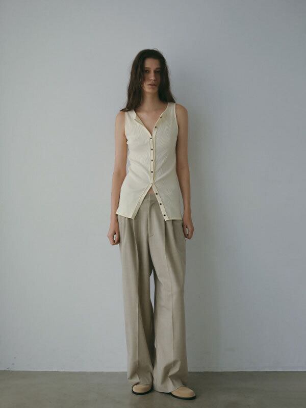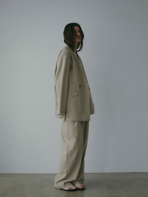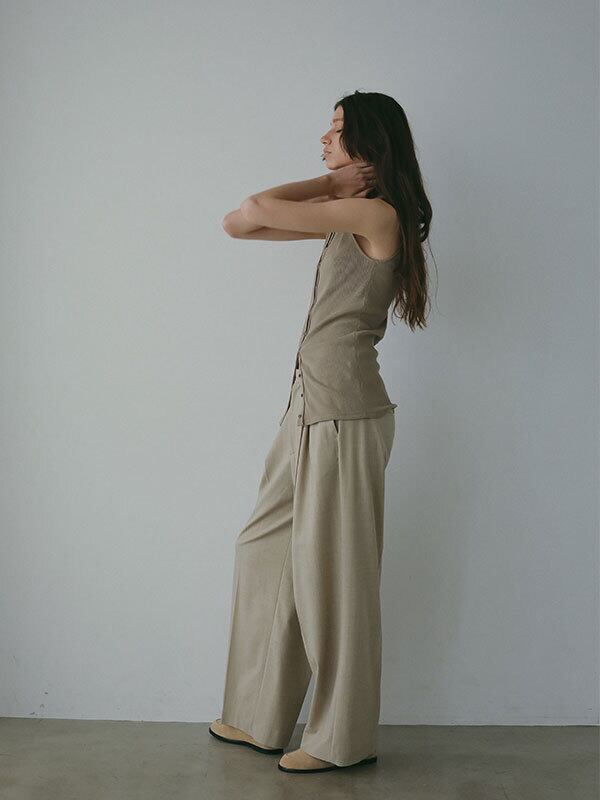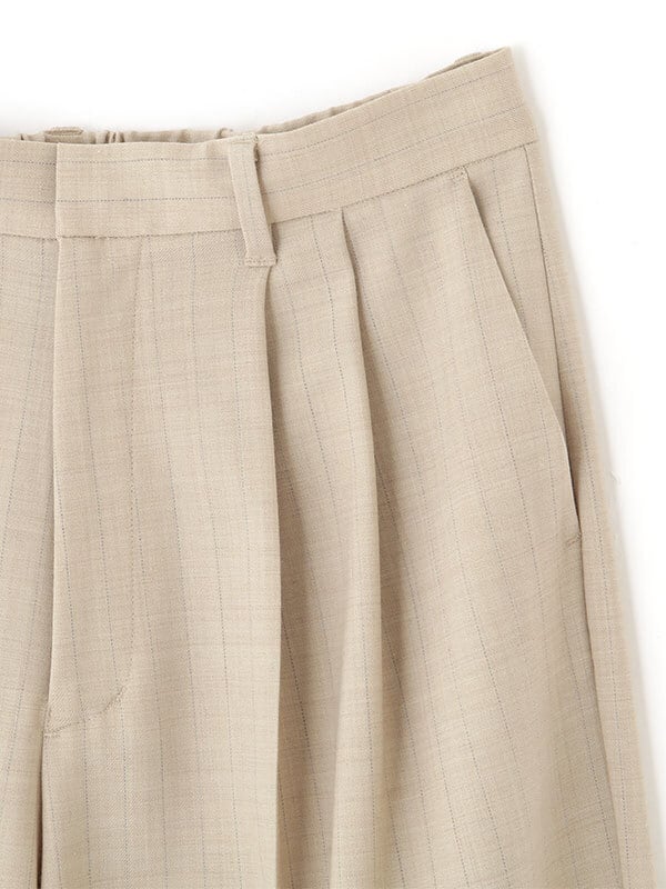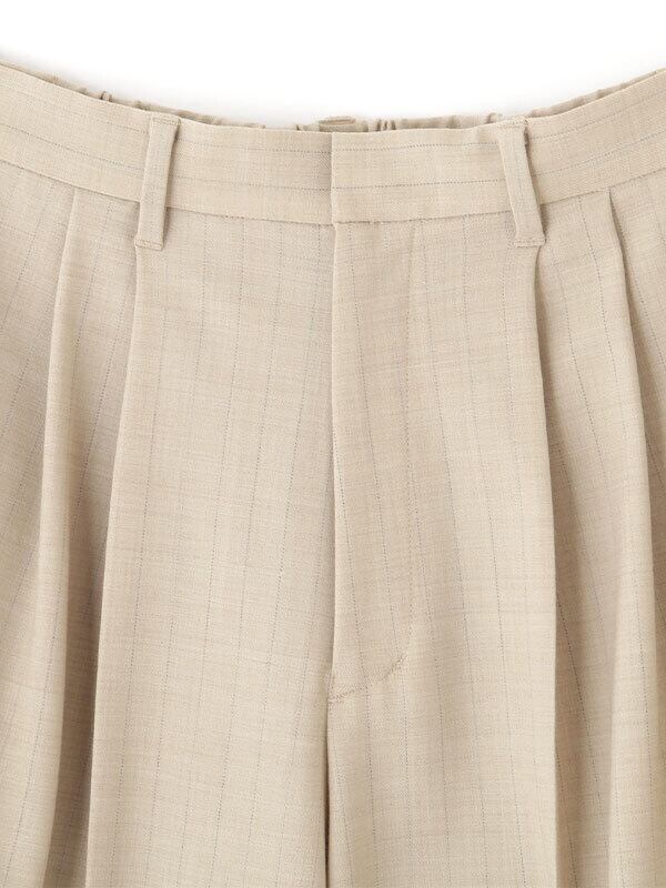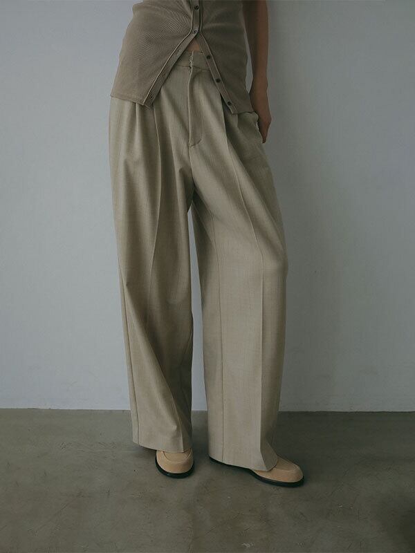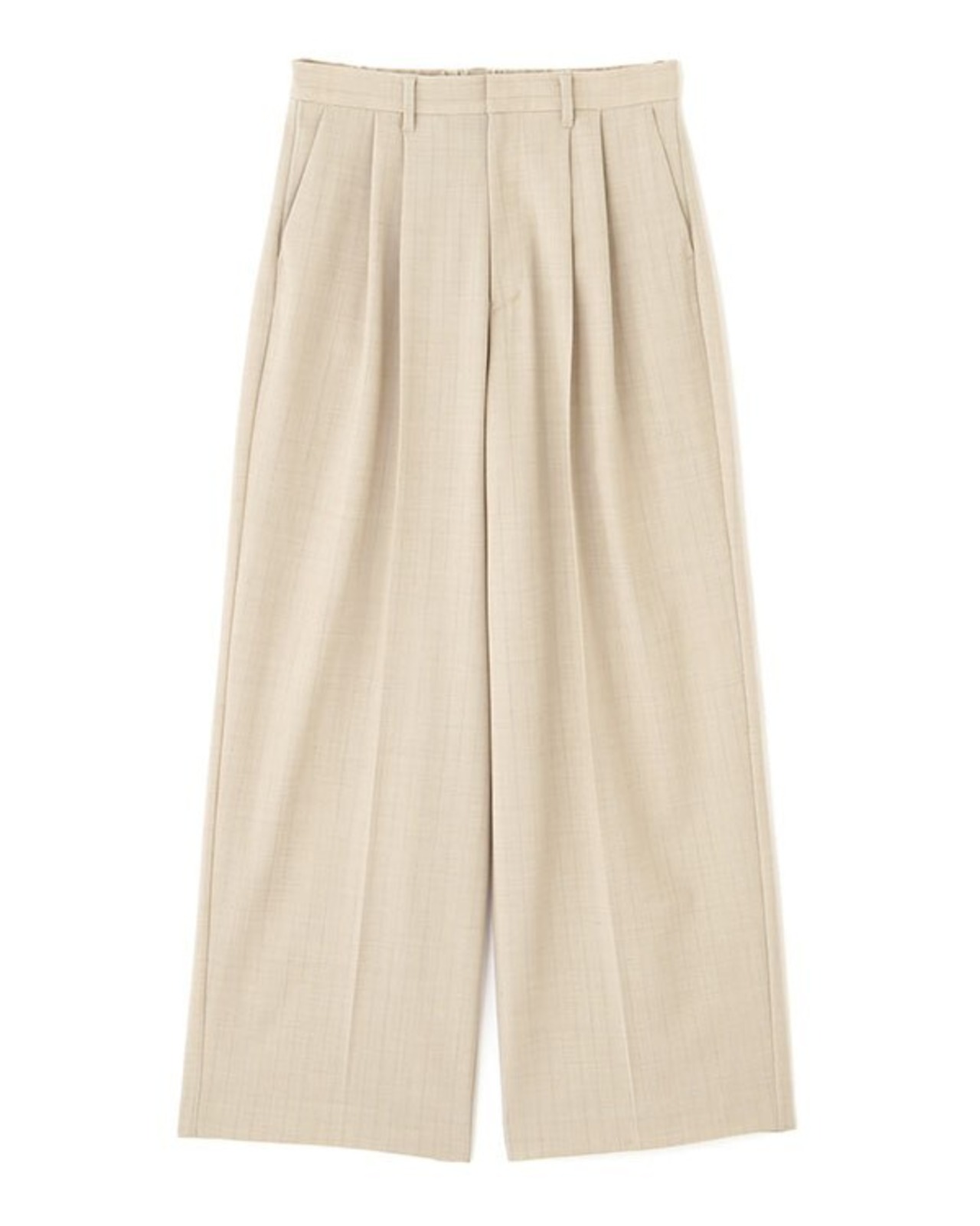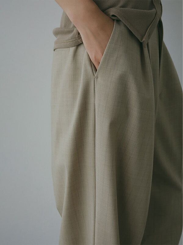 シルエットの美しさが際立つ、タック入りのワイドパンツ。上品な表面感としなやかさを兼ね備えた素材を使用、きちんと感を保ちつつ、ストレスフリーな軽やかさが魅力です。腰まわりにしっかりと入れたタックが、立体感と品の良さを演出。裾にかけてすとんと落ちるワイドストレートシルエットで、脚のラインを拾わずすっきりと見せてくれます。センタープレス入りで、オンオフ問わず活躍する一本です。BEIGEはごく繊細なストライプ柄をのせたチェック風のニュアンス素材でデザイン。優しいトーンながらも立体感があり、ワントーンコーデに奥行きを出してくれます。ジャケットとセットアップとしても、単品使いでも幅広く活躍する、秋のワードローブにおすすめの一本です。