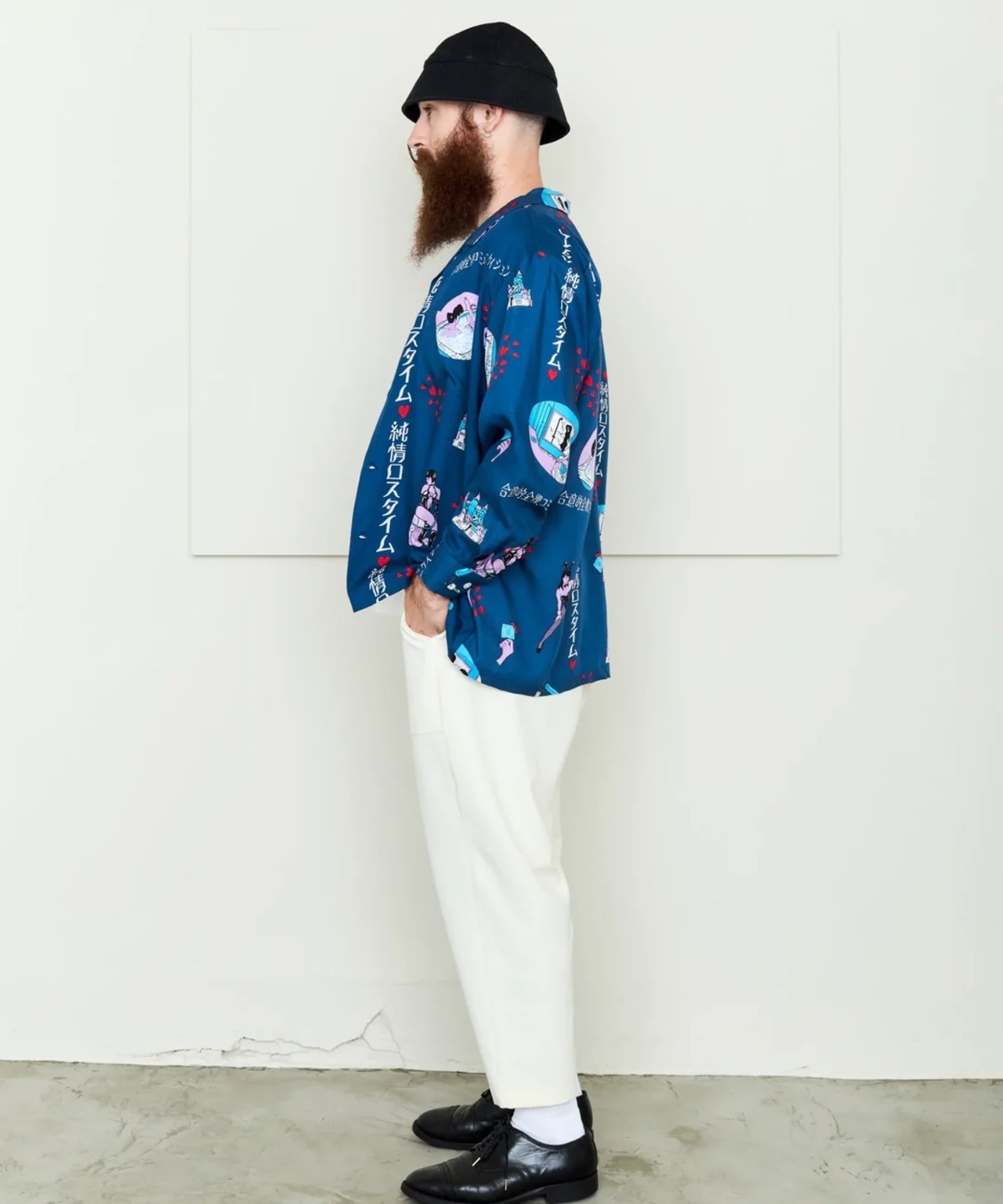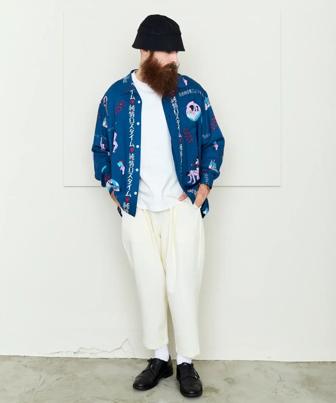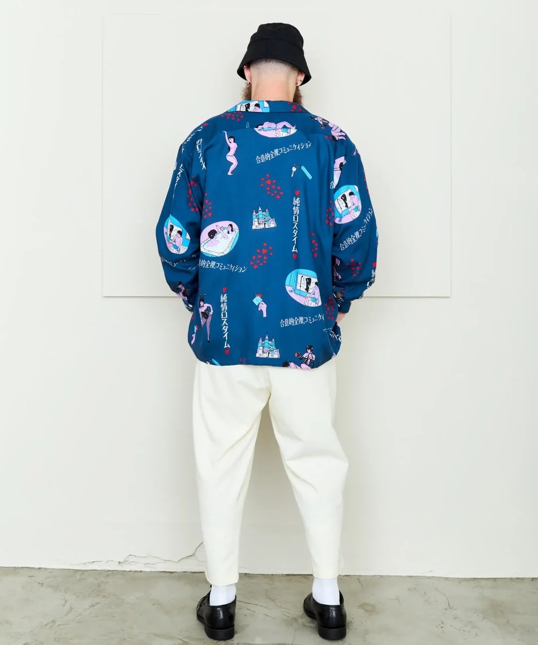 「ラブホテル」をテーマに、インターチェンジ付近にありそうな架空のレトロなラブホ「純情ロスタイム」内でのシーンイラストを散りばめた総柄&ボーダーパターンのアロハシャツ。アートワークはミズタニ タニシ氏が担当。カラーは昼休憩をイメージした爽やかなブルー。日常に刺激を与えてくれる、ちょいエロでいいあんべぇな1着。