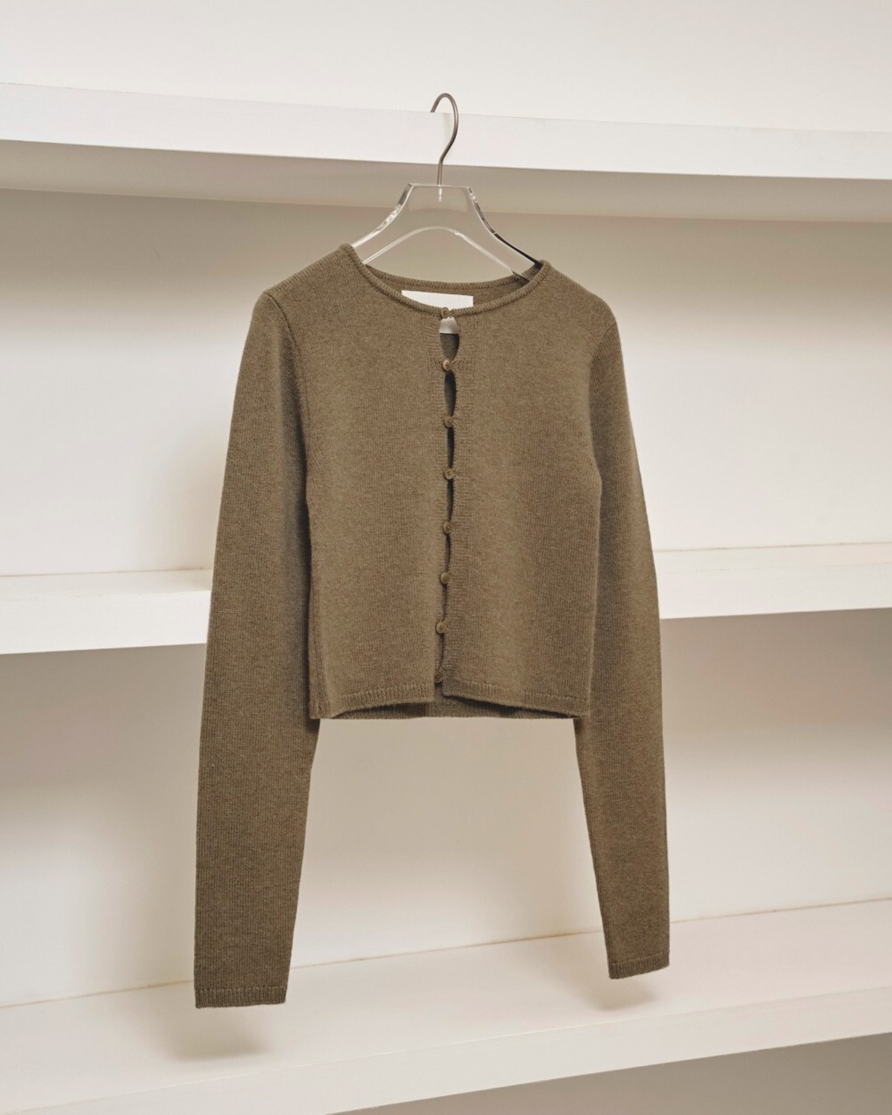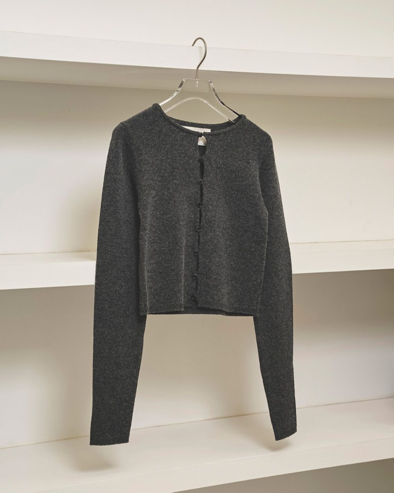 ウールカシミアの糸を使用して編まれたニットカーディガン。柔らかくふんわりとした質感が肌に優しくフィットし、リラックスした着心地を実現。コンパクトなサイズ感と華奢なボタンをふんだんにあしらったフロントディテールとのバランスが絶妙で、シンプルなボトムスに合わせるだけでこなれた印象に。
