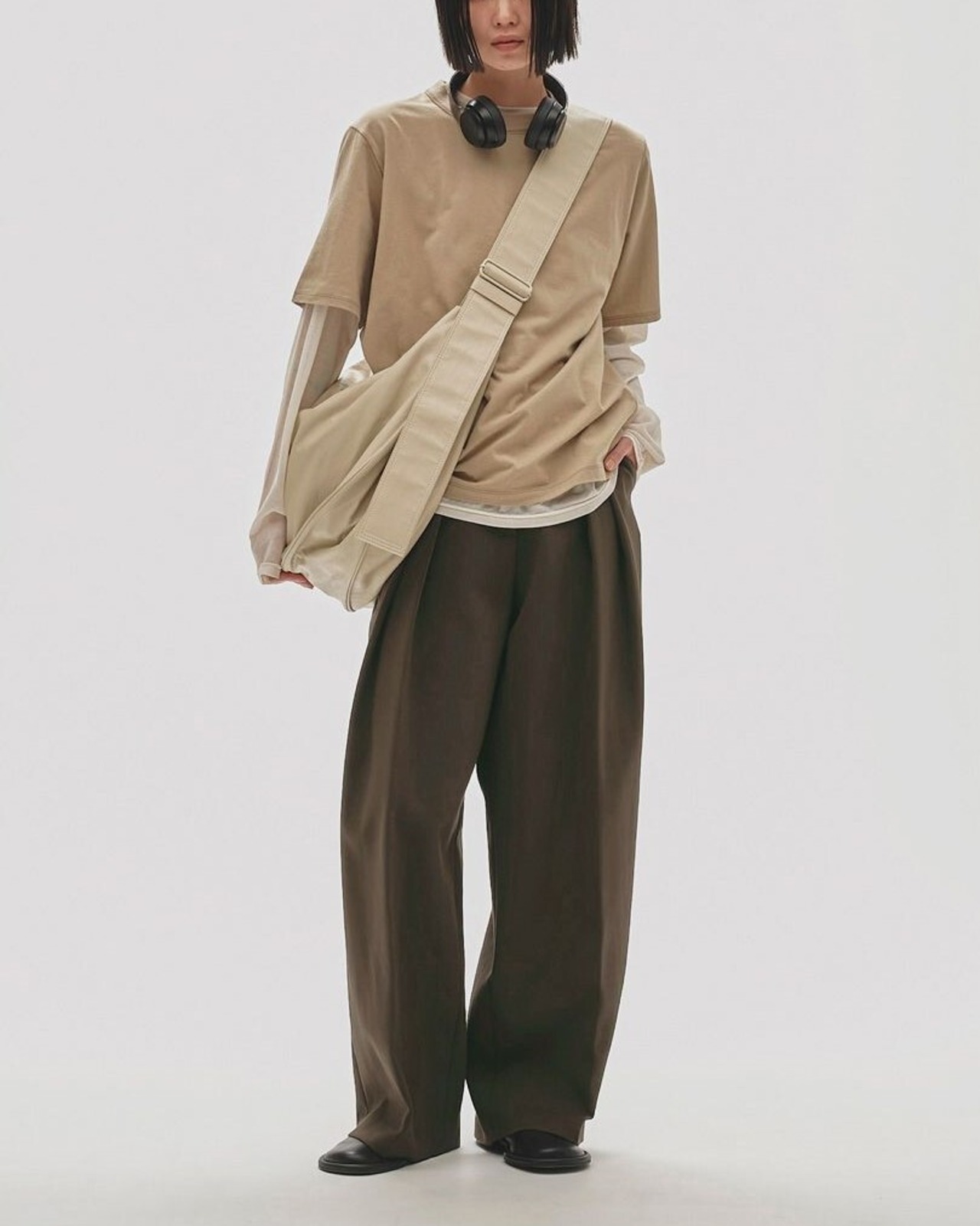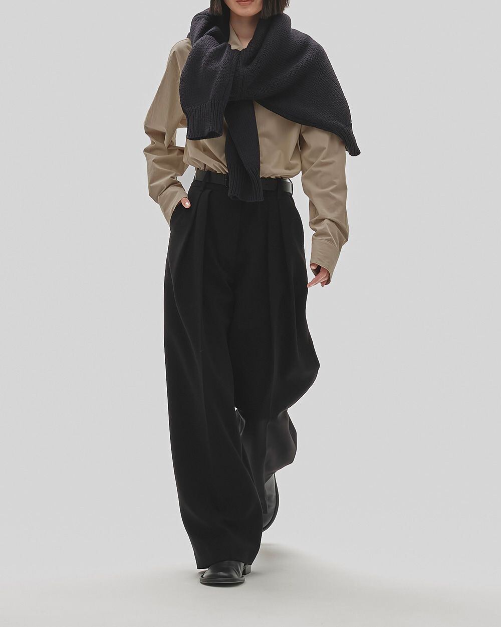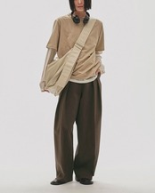 深めのダブルタックとワイドなシルエットが魅力のトラウザーズ。上質なツイル生地を使用し、内側に別生地をボンディング加工することで、シルエットをより立体的に見せてくれます。表地と同色のパイピングを挟んだオリジナルマーベルトとステッチを表に出さない仕立てがマニッシュでありながらも、どこか上品な印象に。