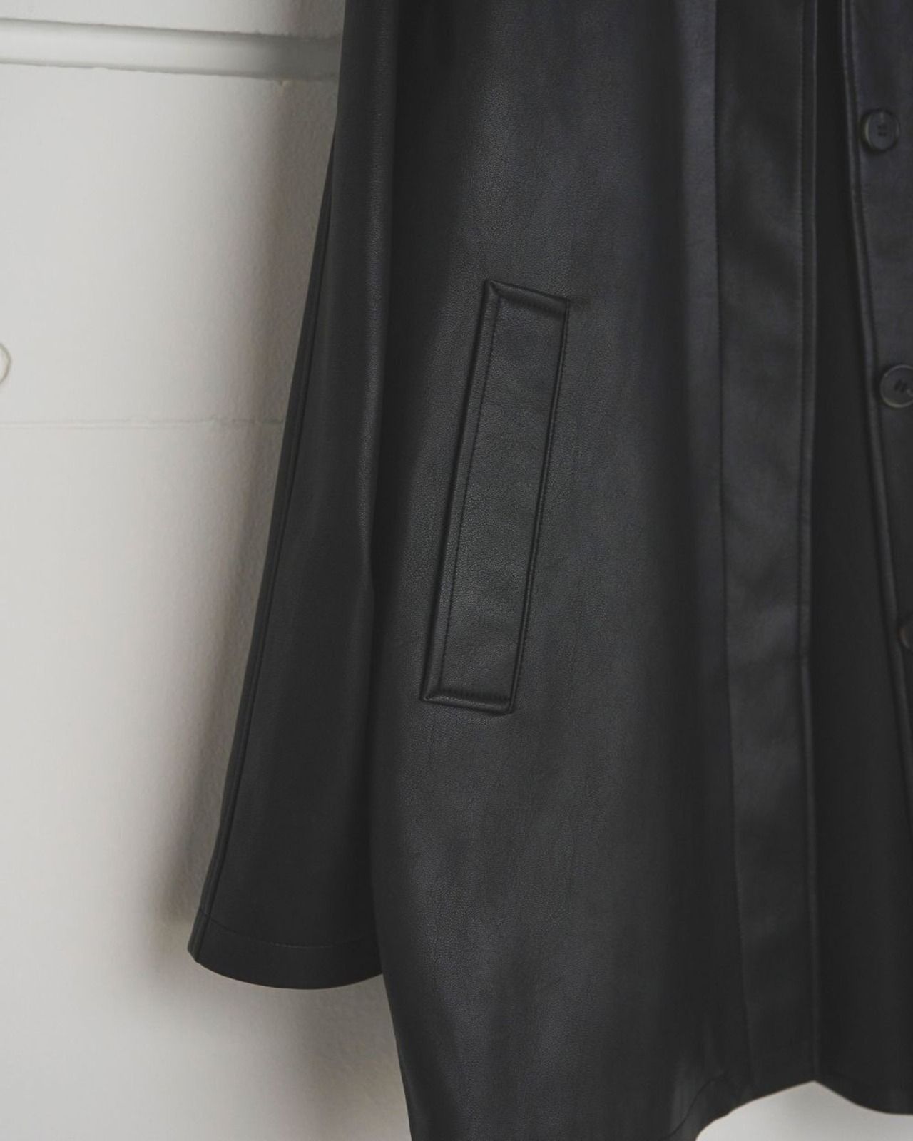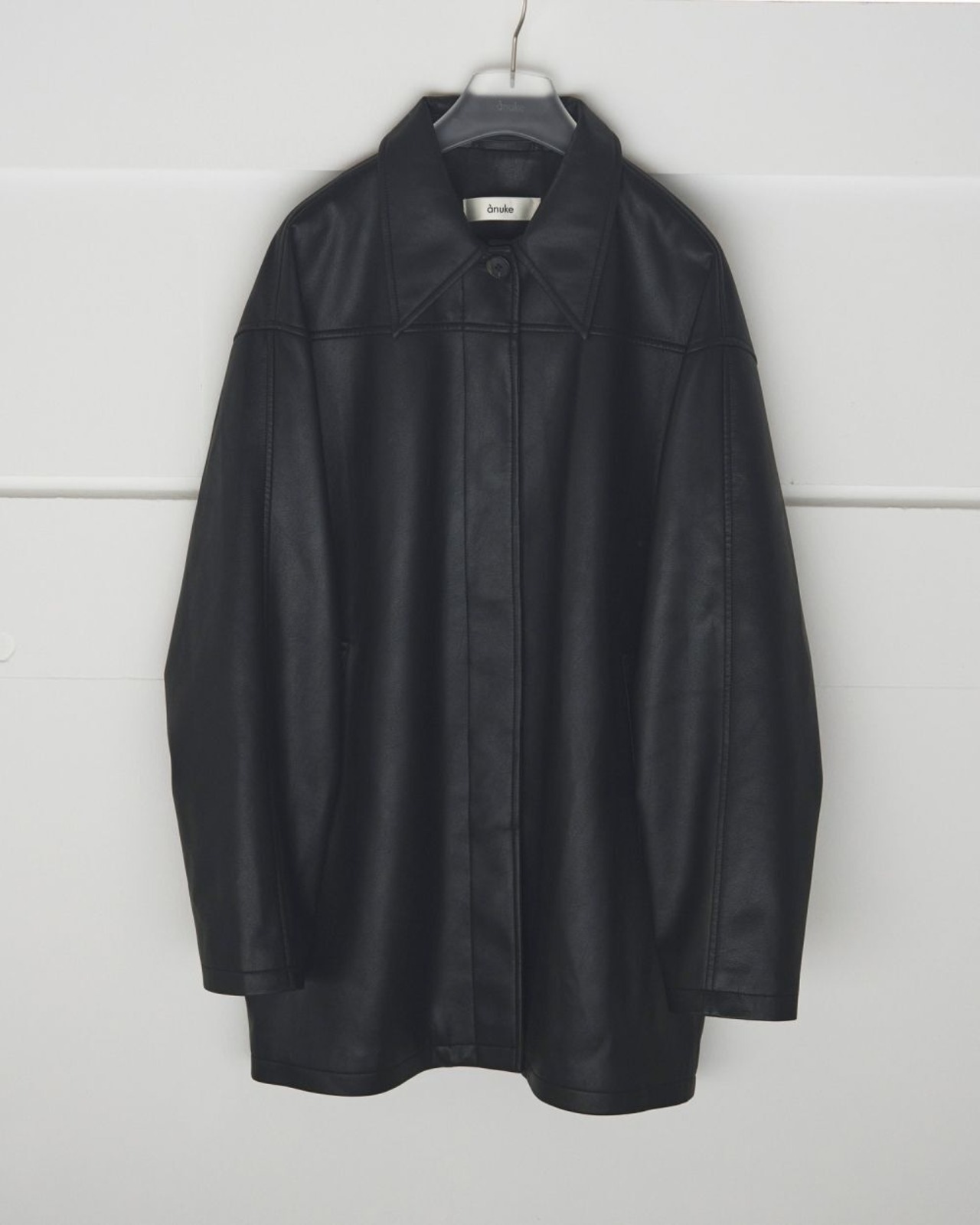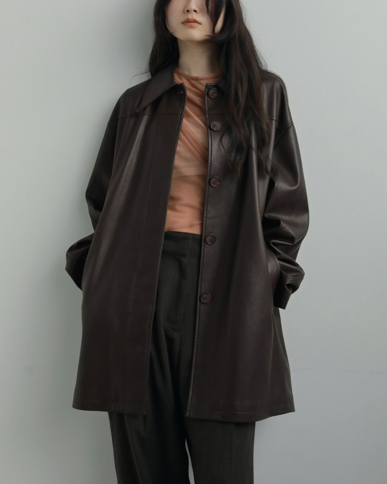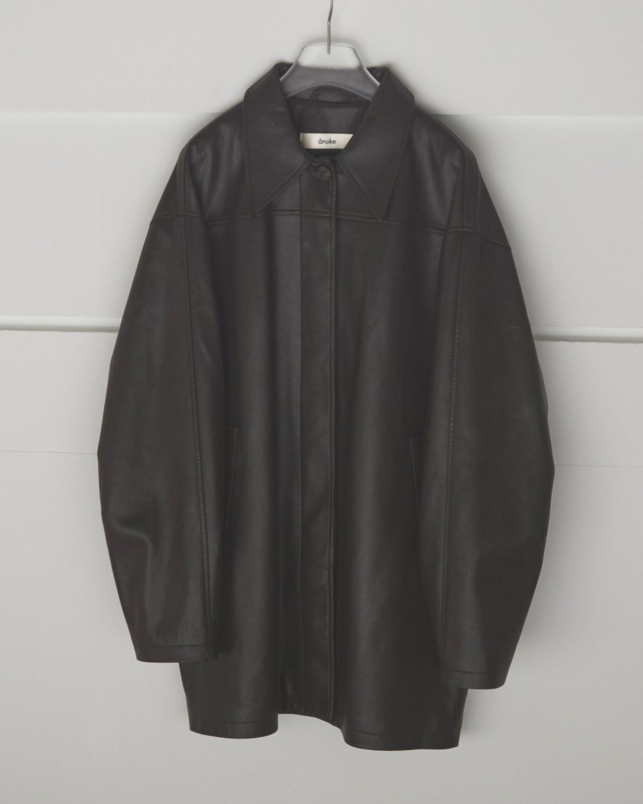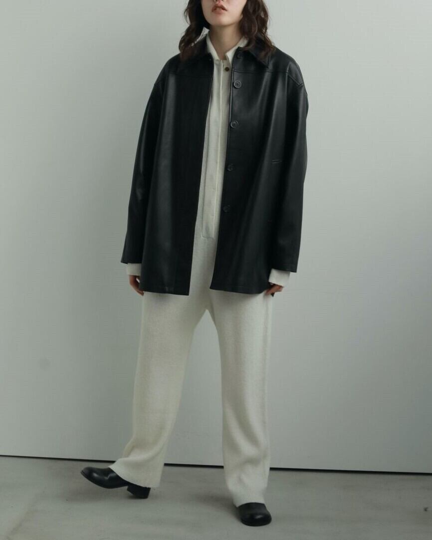 昨年もご好評いただいたエコレザージャケット。上質なエコレザーを使用しました。適度な光沢、細かいシボ、程よいハリ感のある生地で、カジュアルなアイテムですが、上品に見せてくれます。オーバーサイズなので、中に肉厚のニットも着ていただけます。袖にタックを入れて少し丸みを帯びたシルエットに仕上げています。幅広いスタイリングに合わせやすく、秋だけでなく、寒さの残る春先など、長く使っていただける一枚です。