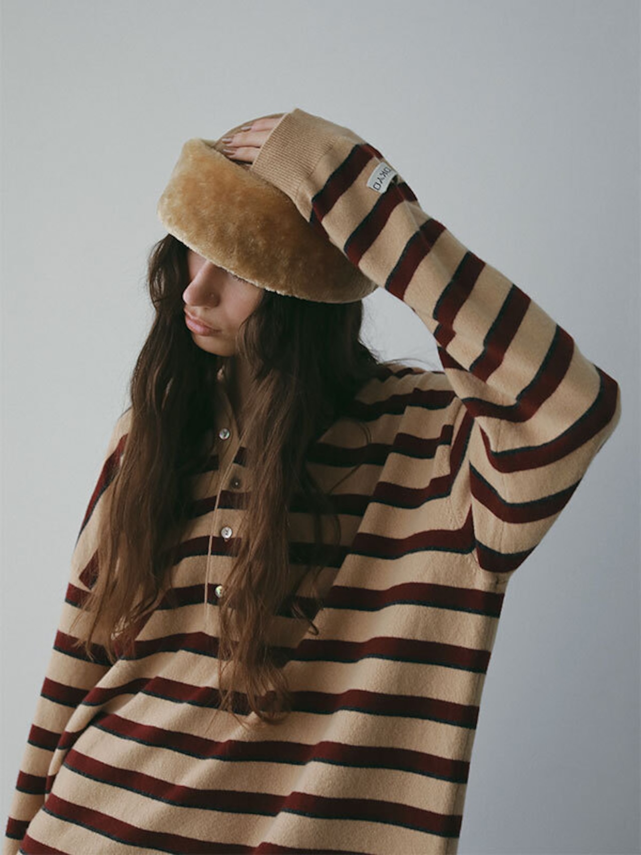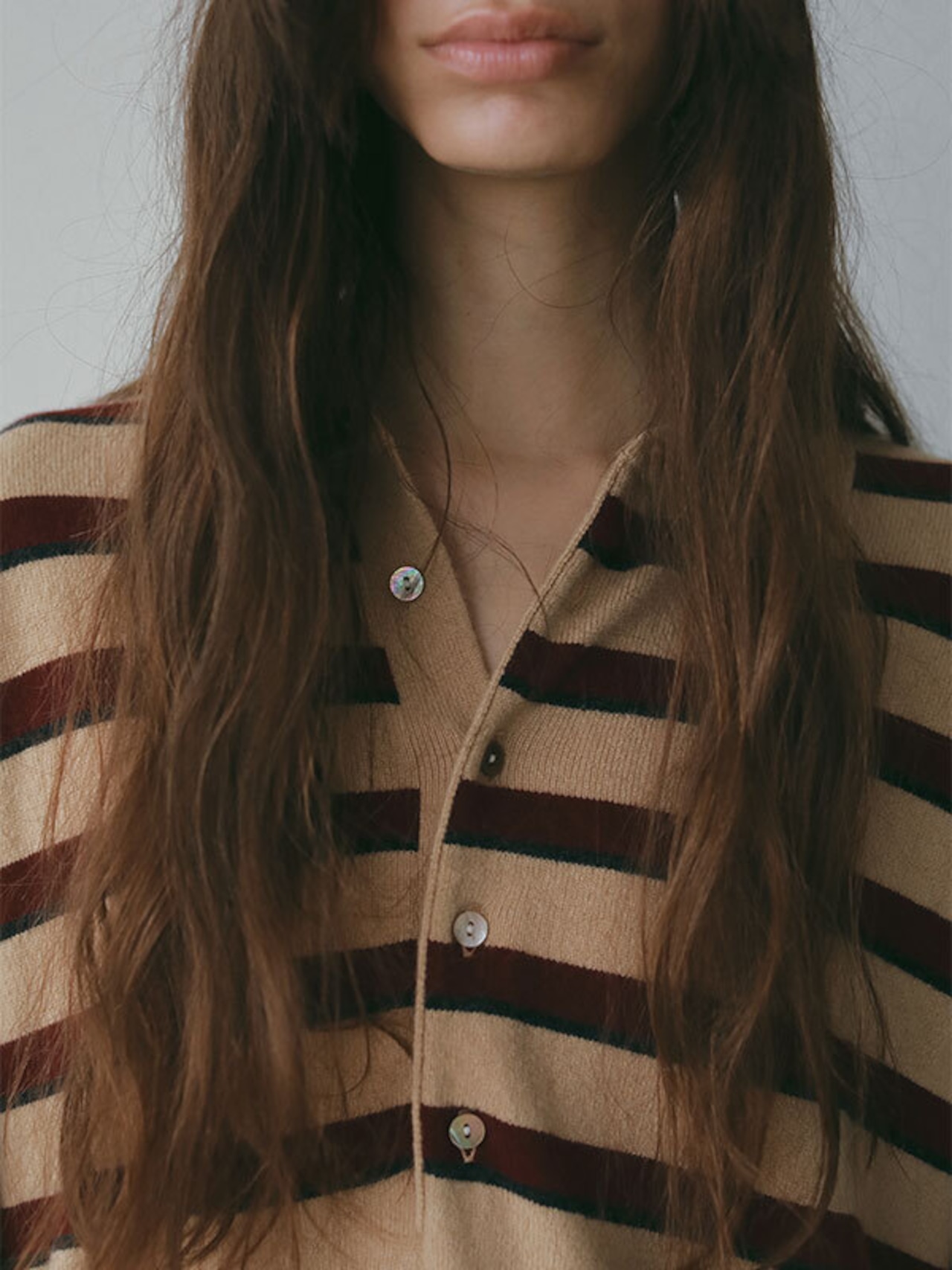 目を引くマルチボーダー柄が、装いにほんのりと遊び心を添えてくれるニットポロ。柔らかく、しなやかな肌触りが魅力のメリノウールを100%使用。ラガーシャツを思わせるカジュアルな雰囲気に、上質な素材感が絶妙なバランスで抜け感を演出します。ややゆとりのあるサイジングと、身体のラインを拾いすぎないシルエットは、着る人を選ばず大人の女性のライフスタイルにもフィット。袖先にはニットのジャガードネームを施し、さりげないアクセントをプラスします。ボトムスを選ばず合わせやすく、デニムやチノはもちろん、タイトスカート等と合わせたミックス感のある着こなしもおすすめ。季節の変わり目から寒さ深まる季節まで長く活躍する一枚は、ワードローブに加えておきたい頼れる存在。ほどよい存在感と実用性を兼ね備えた、今の気分に寄り添う主役級ニットです。