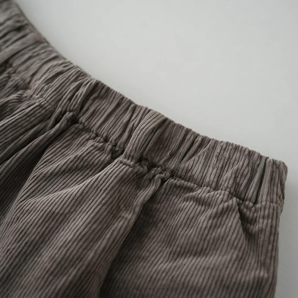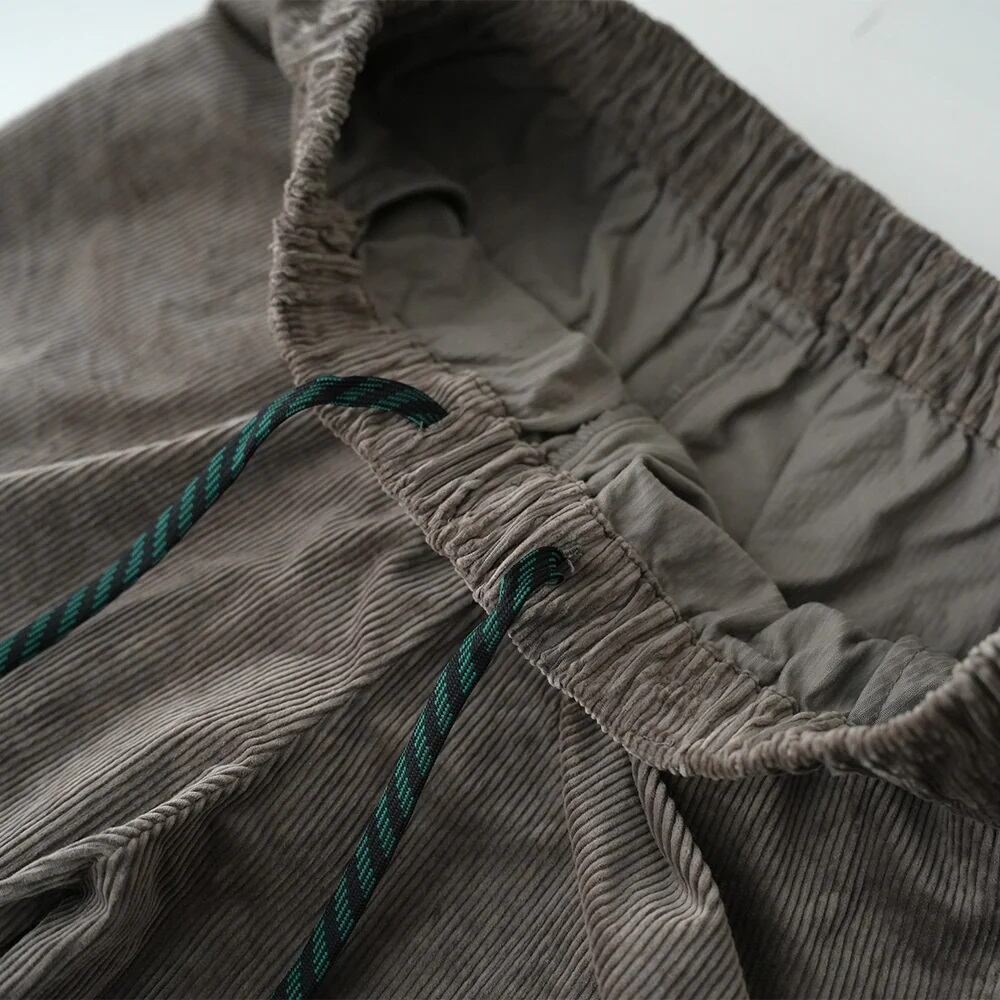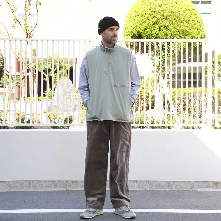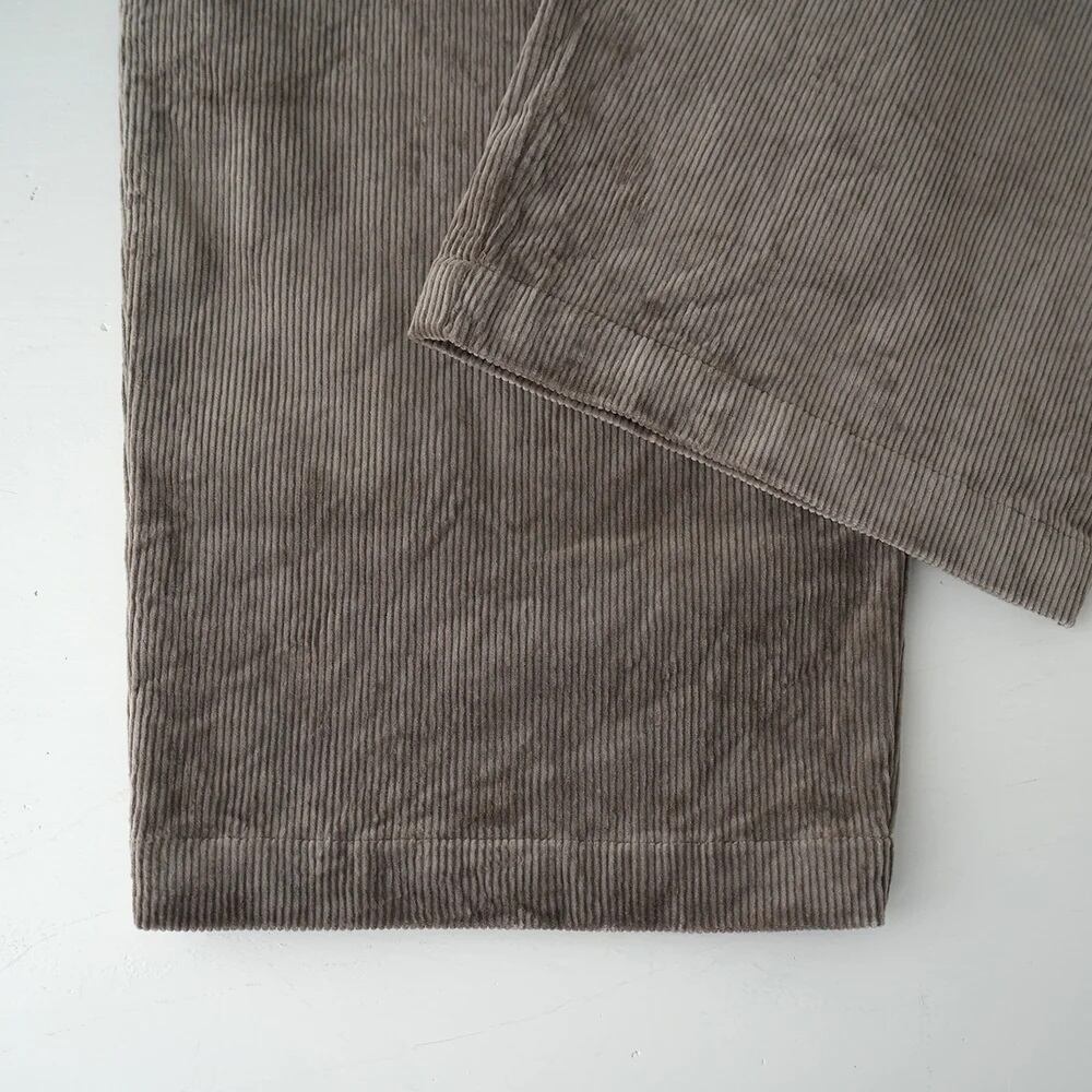 太畝のストレッチコーデュロイのイージーパンツ。シルエットは腰回りからゆとりを持たせ、裾までストンと落としたワイドパンツです。ただ裾上げいらずのレングスに設定しているので、太目ですがスッキリしており、幅広いスタイルに対応してくれます。素材には10ウェルの太畝のコーデュロイを仕様。適度な光沢感とハリがポイントで、カジュアル過ぎずキレイ目な印象が特徴です。上品な雰囲気のコーデュロイはキレイ目なアイテムにもビンテージ感のある古着のようなアイテムとも相性が良く、幅広いコーディネイトで活躍してくれます。