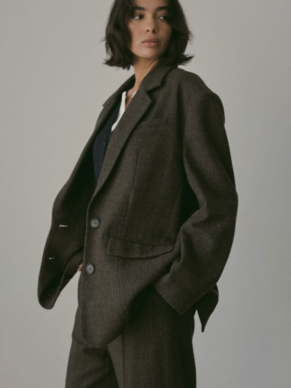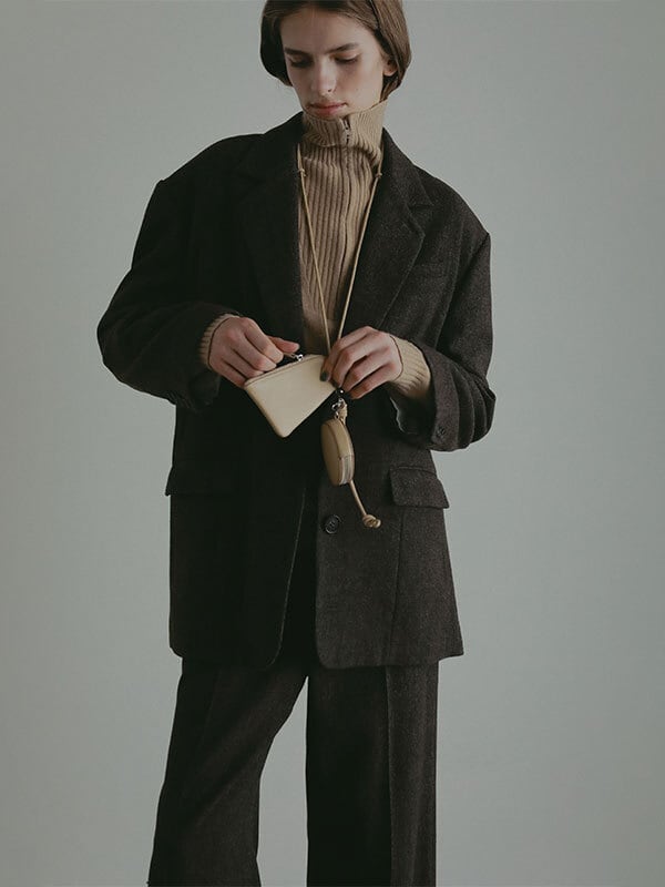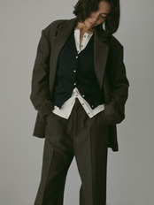 素材感や低めに設定したボタン位置はヴィンテージライクな印象を演出。同素材のチェックツィードセンタークリースパンツとセットアップでの着用はもちろん、デニムなどとラフに合わせるのもおすすめです。