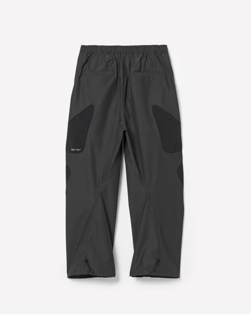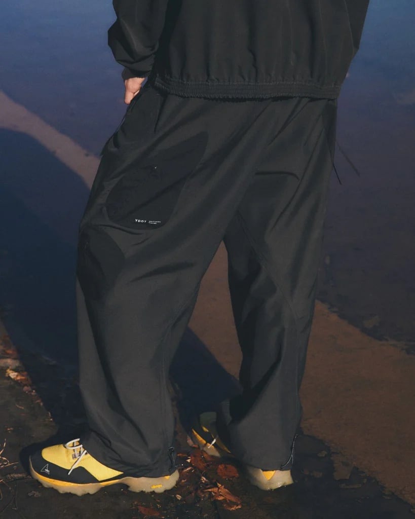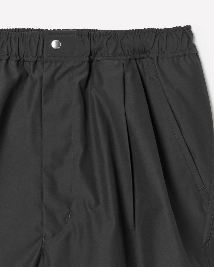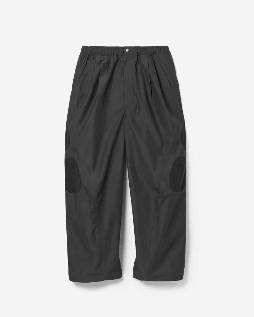 北欧のアーキテクチャーから着想したデザインが特徴的なワイドパンツ。脇のシームにひねりを利かせ膝に向かって湾曲した独特のシルエットを形成します。ウエストと裾はドローコードによって調節可能です。