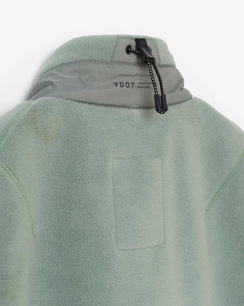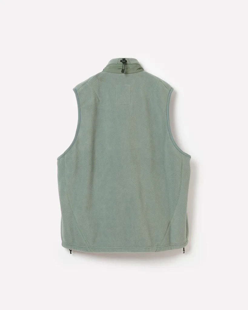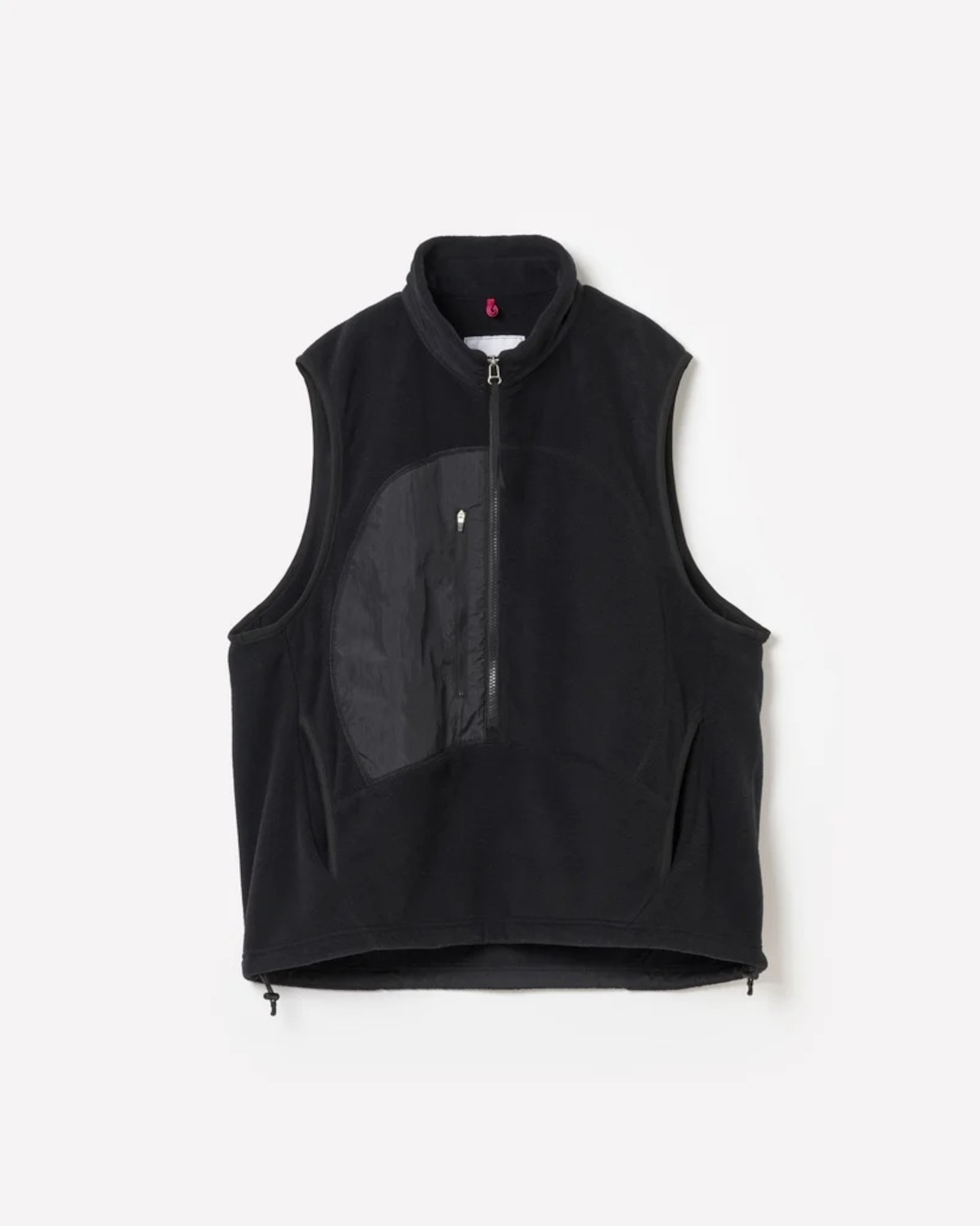 サークル状のポケットが特徴のフリースベスト。両面起毛の肌触りの良いフリースとシワ加工を施したナイロンタフタの切り替えがアクセントになっています。ネックと裾はスピンドルによって調節できる仕様です。インナーとしてだけでなく、アウターとしても羽織れるサイズ感です。