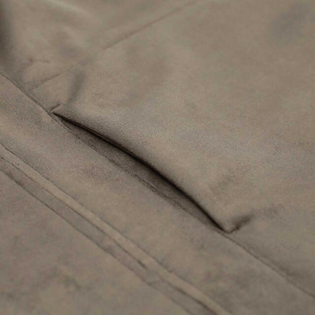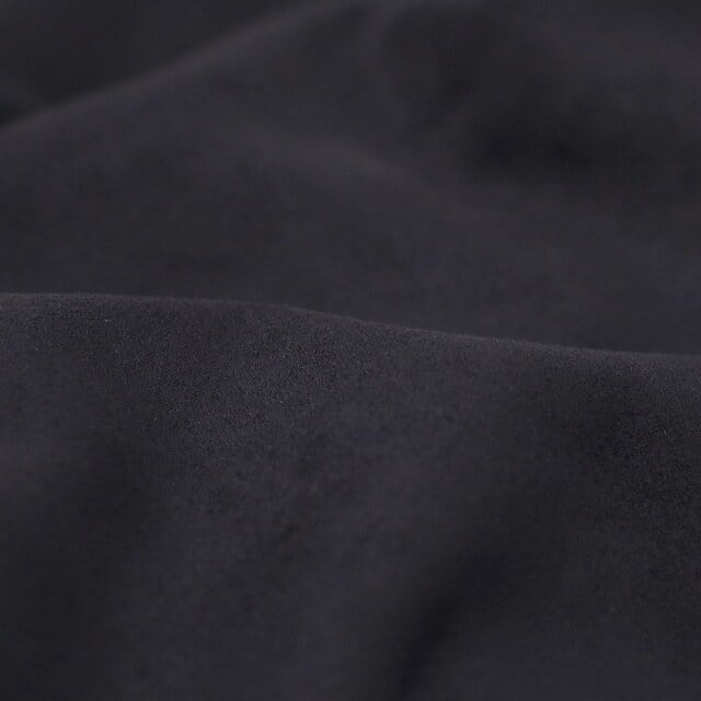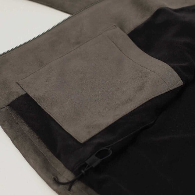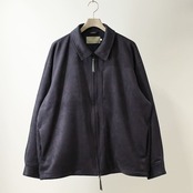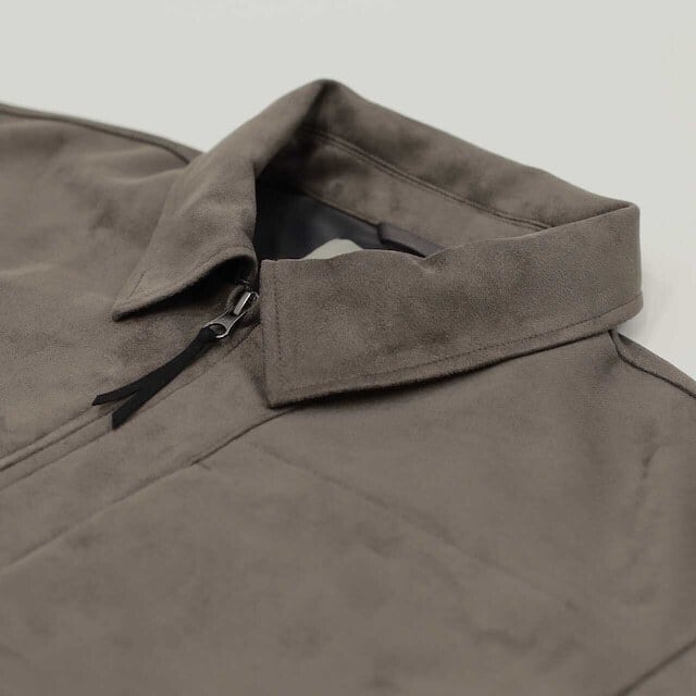 リサイクルポリエステル原料のダンボールスエードを用いたジップアップブルゾン。リラックス感のあるゆったりとしたシルエットなので程よいドレープが生まれ、スエード生地特有の陰影が綺麗に出ます。身頃には薄手のフリースを、袖には滑りの良いトリコット裏地を用いています。裾にはドローコードがあるので、ブラウジングしてシルエット変化を楽しめます。前袖はシャツ袖で後ろ袖がヨークスリーブのスプリットスリーブ仕様。左身頃の胸にはシームポケット、右身頃の裾内側にはパッチポケット有り。