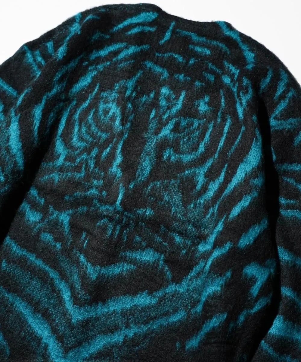 ヴィンテージライクなタイガー柄のシャギーニッとカーディガン。フロントはタイガー柄、バックにはタイガー柄に紛れて顔もあるユーモアのあるデザイン。モヘア調アクリル糸で古着の様な風合いを再現。ざっくり着こなせる落ち感のあるオーバーサイズフィットで、1枚での着用はもちろん、インナーとしても使いまわしやすい一着。