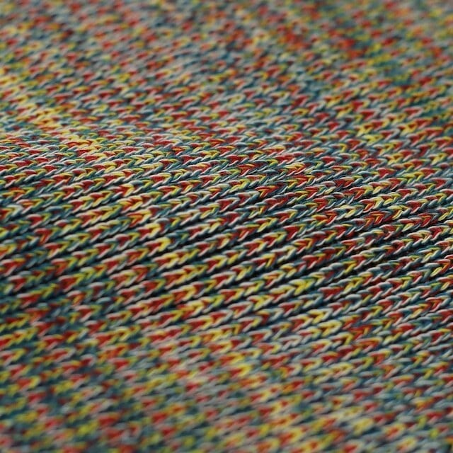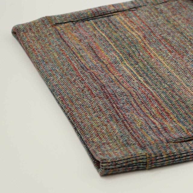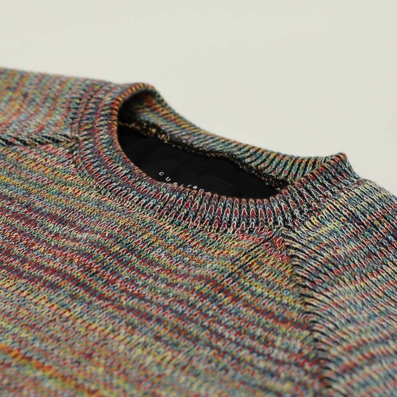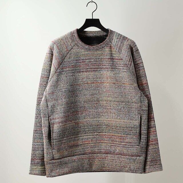 表はコットン、裏はポリエステルで異なるゲージで編まれたクォーターゲージニットを用いたクルーネックプルオーバー。一般的なローゲージニットの様に見えながらも裏面はポリエステルハイゲージニットなので、キックバックを保つことができ、型崩れしません。丸編みとニットの長所をハイブリッドさせた新しい素材です。素材自体がバルキーな印象なので、裾や袖口はストレートな折り返し始末でスッキリと見せ、ボディは適度なゆとりを持たせたオーセンティックなシルエットを採用。ウエスト部分にはシームポケット有り。