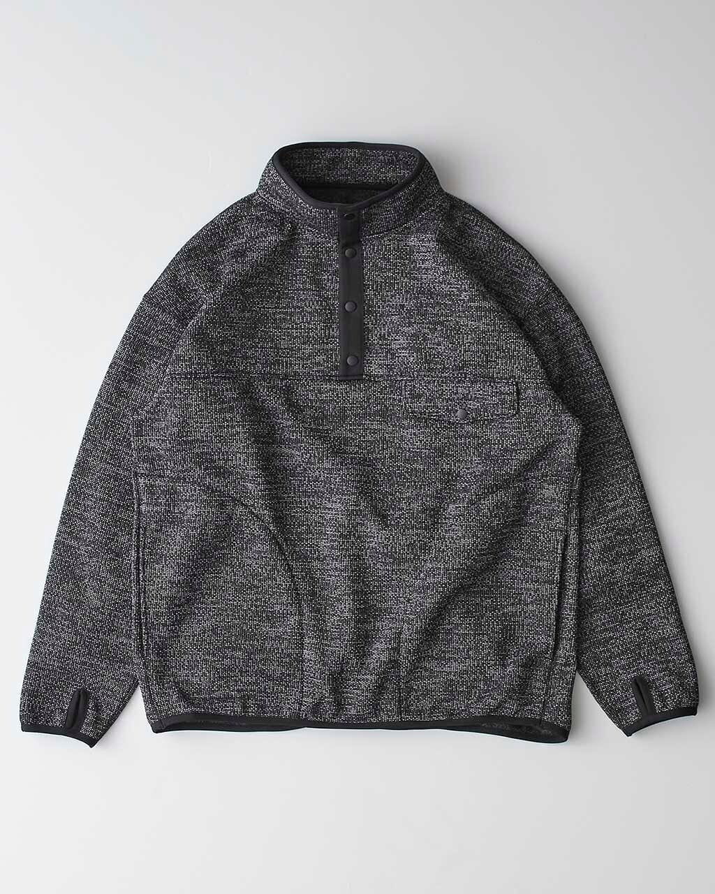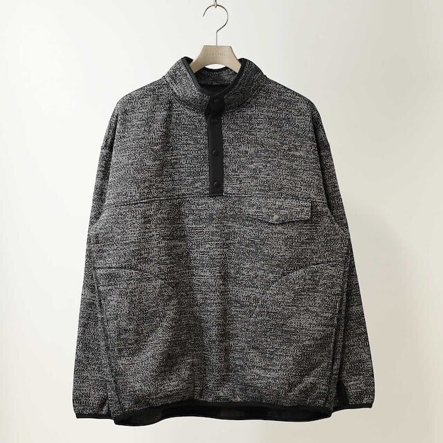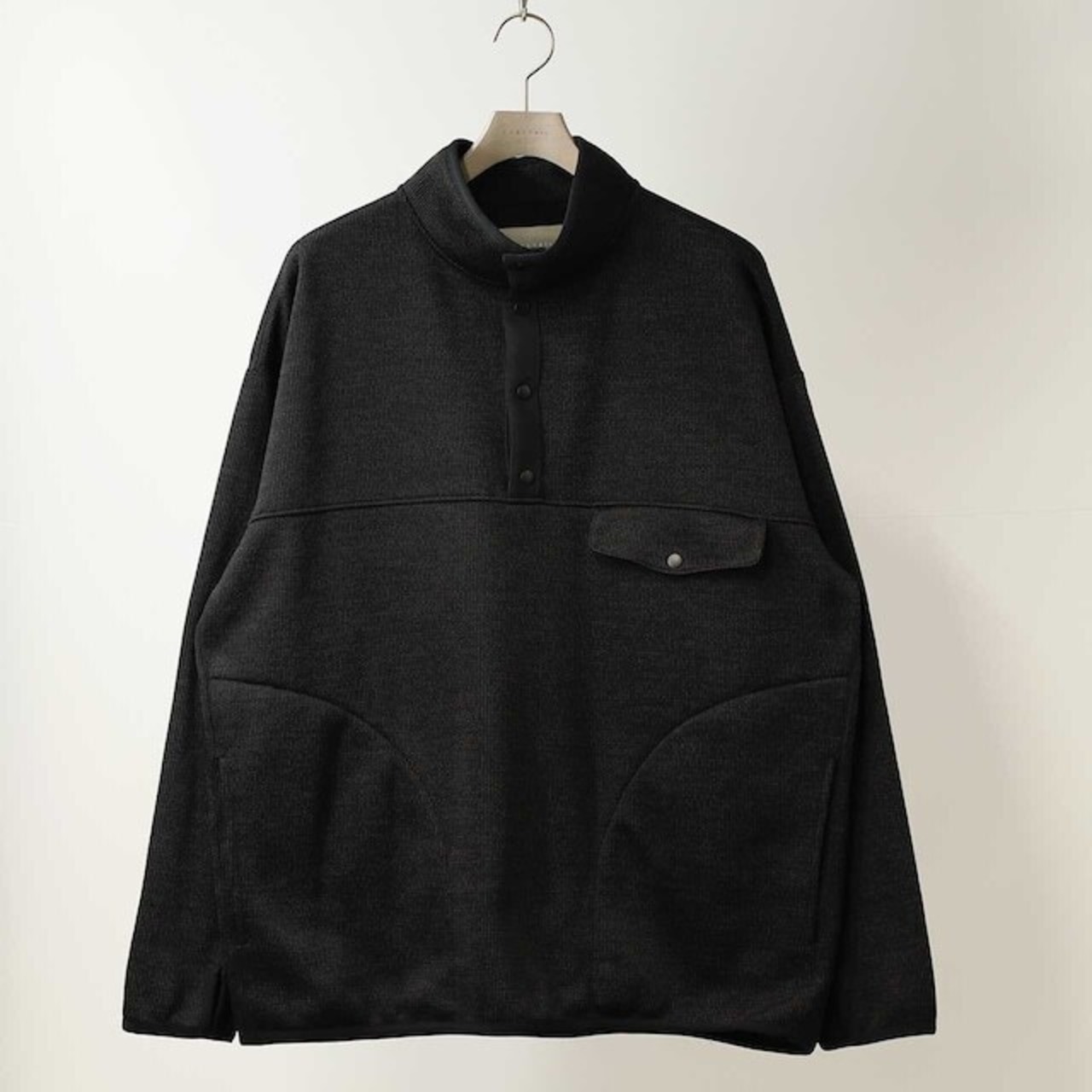 裏起毛が施されたポリエステルニットを用いたチムニーカラーのアノラック。表面は縦畝のざっくりとしたニットで裏面は起毛加工された暖かいフリース。2枚をボンディングするのではなく編み方や加工を工夫し布1枚で表現しているので、圧倒的な軽さを実現。アノラックのエッセンスを取り入れながらもフードではなくスタンドカラーを採用。広めの天幅と浅めの前下がりが特徴の平面的でレトロな雰囲気に仕上げています。フラップ付きの胸ポケットとウエスト部分にはシームポケット有り。