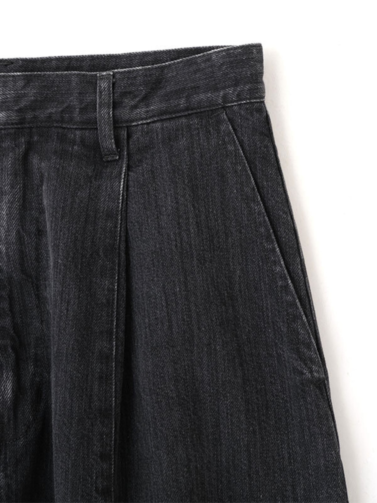 立体的なバレルシルエットと、フロントに施された深めのタックが目を惹くデニムパンツ。