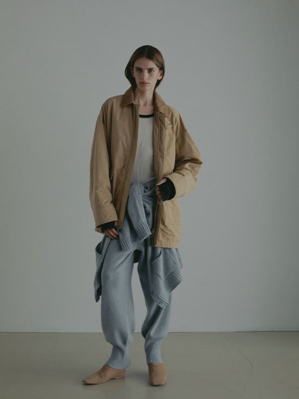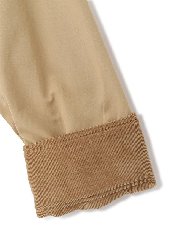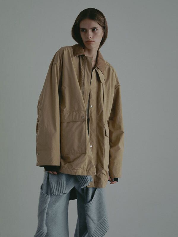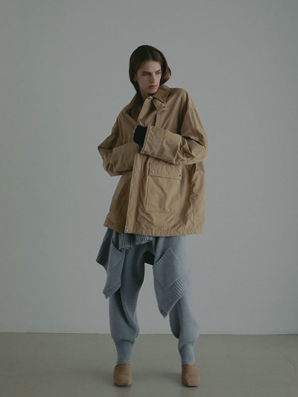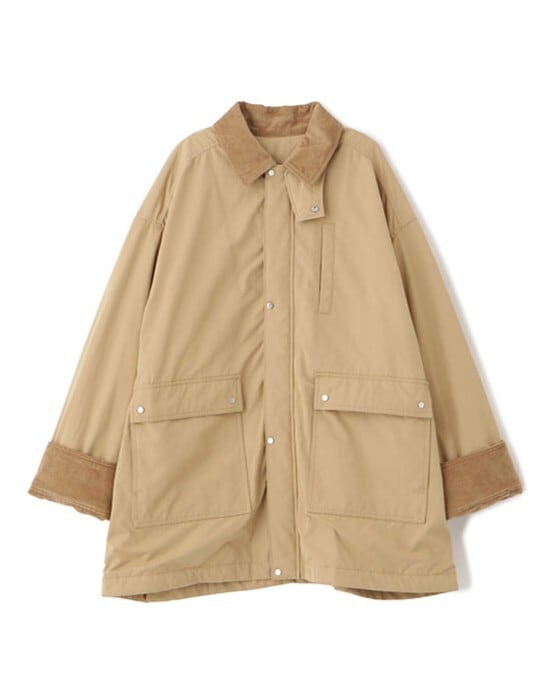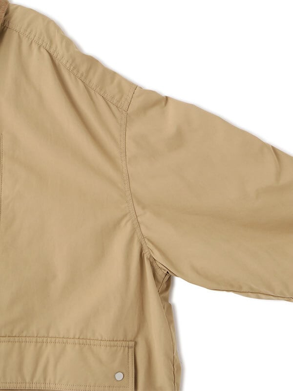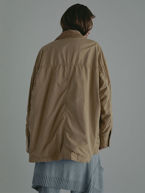ワークウェア由来のディティールを活かしつつ、現代的なムードに昇華したミドル丈のブルゾン。表地にはコットン×ポリエステルの混紡ツイル素材を採用。しっかりとしたハリ感と自然な光沢を併せ持ち、カジュアルながらもどこか上品な佇まいに。さらに、裏地は軽やかなフリース仕様で、見た目以上の保温性と快適さを両立しています。ほどよくゆとりのあるボックスシルエットは、重ね着してももたつかず、ラフすぎない都会的な印象を演出。襟と袖口裏にはコーデュロイ素材を切り替えで配し、ワントーンの中にさりげないコントラストをプラス。スナップボタンやパッチポケットなど、機能性を備えたデザインも実用的でデイリーに活躍します。フロントの比翼仕立ては風を防ぐ効果もあり、インナーを選ばず合わせられるのも嬉しいポイント。ダブルジップ仕様でボトムスや気分に合わせてアレンジも可能です。デニムやチノパンといったベーシックなカジュアルスタイルにはもちろん、 ウールパンツやリブニットパンツなどと合わせた、素材感で遊ぶ大人のミックススタイルもおすすめ。季節の変わり目から本格的な寒さの季節まで頼れる一着。アウターに迷う日こそ手に取りたくなる、スタイリング自在の万能アイテムです。