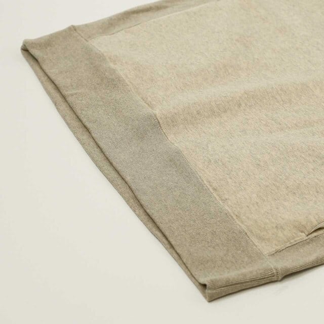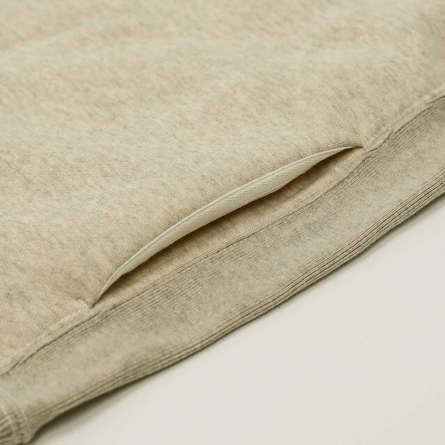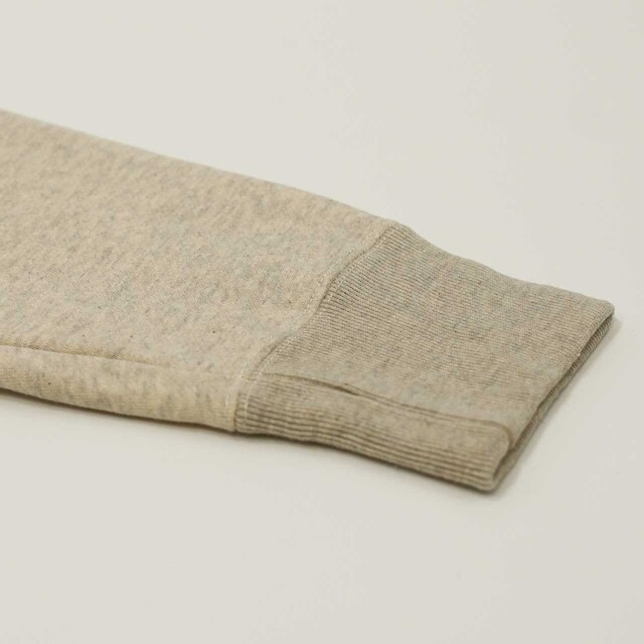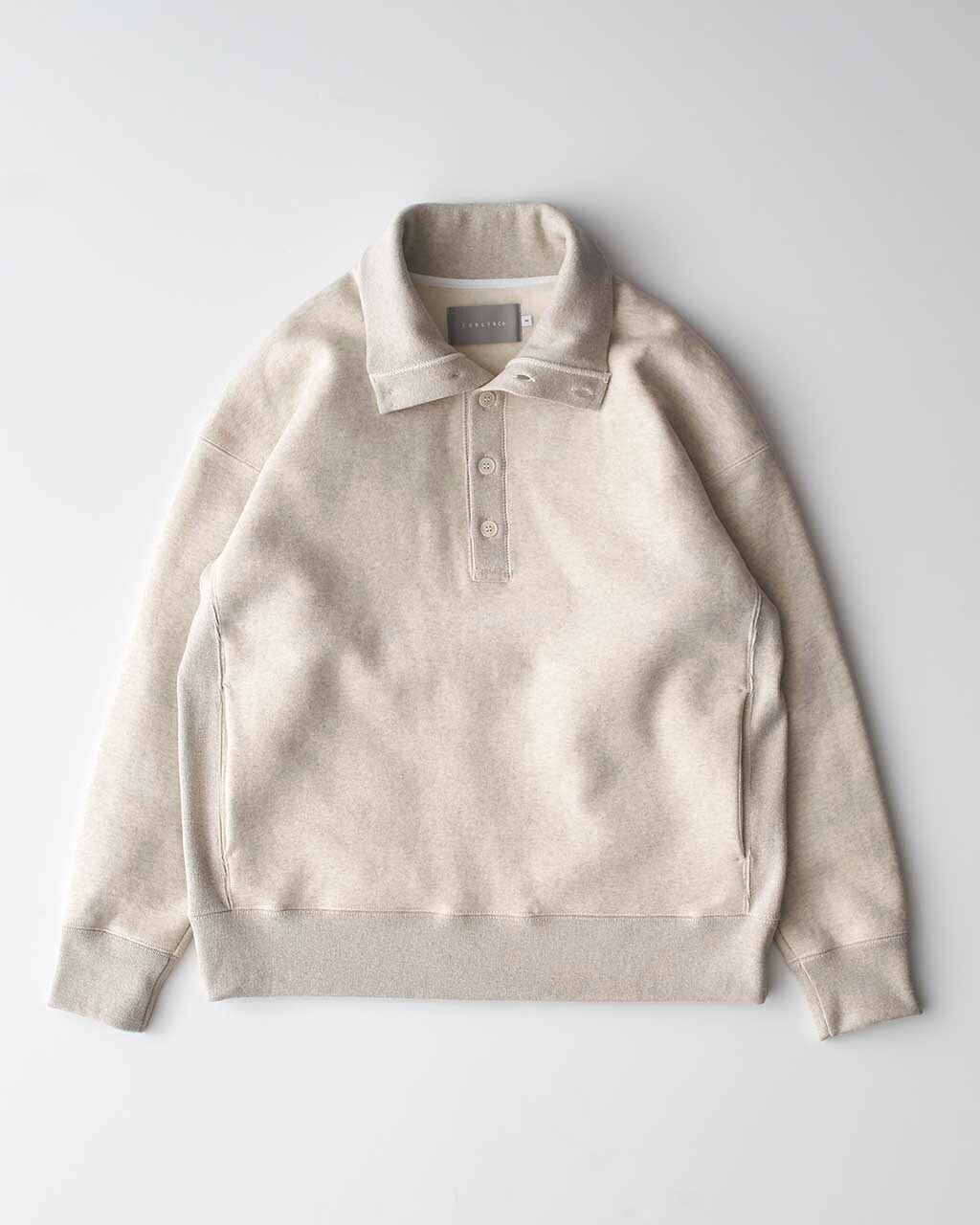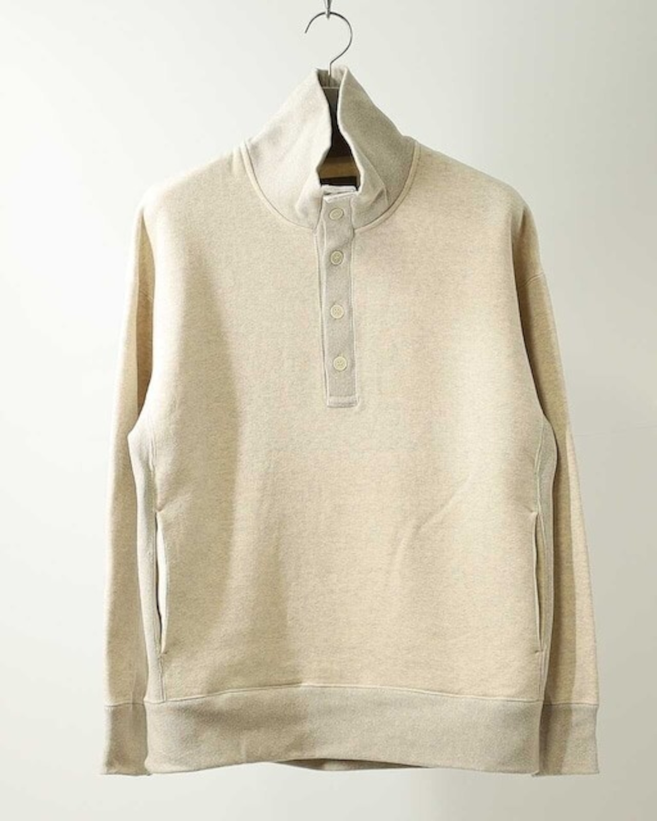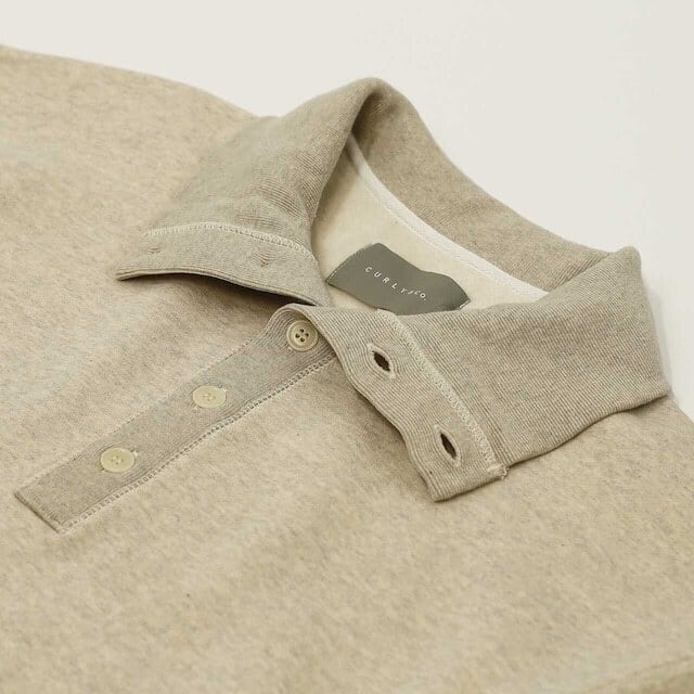トルファン、ギザ、スーピマなどの超長綿の落ち綿をリサイクル混紡した、環境に優しいラフィ糸で編み立てた起毛裏毛を用いたプルオーバー。糸の持つ自然なムラ感を活かした表面感があり、かつ裏毛を起毛した後に更にタンブラー乾燥をすることで、高密度でありながらも柔らかくボリュームのある素材に仕上がっています。毎シーズンCURLY&Co.のアイコニック生地として色々なアイテムを展開していますが、今シーズンはボタン仕様のタートルネックのデザインを採用。ボタンを開閉することでタートルにも通常の襟にもなり、2通りの着こなしを楽しめます。ウエスト部分にはシームポケット有り。
