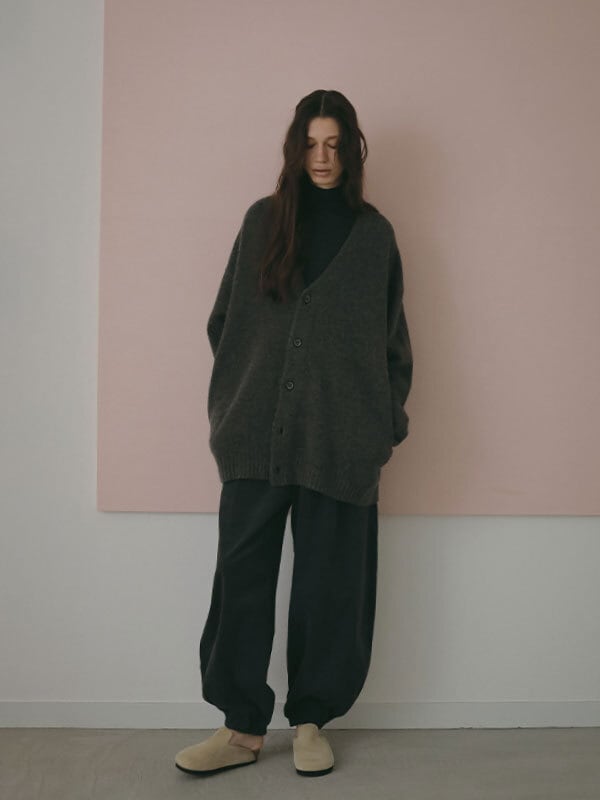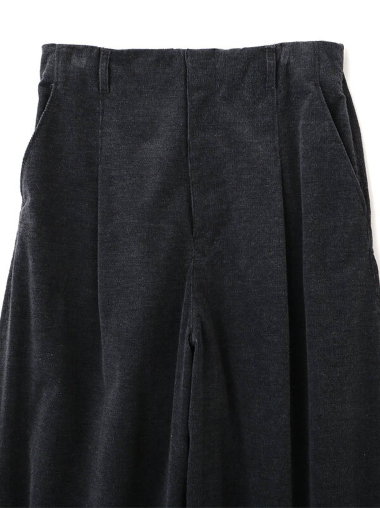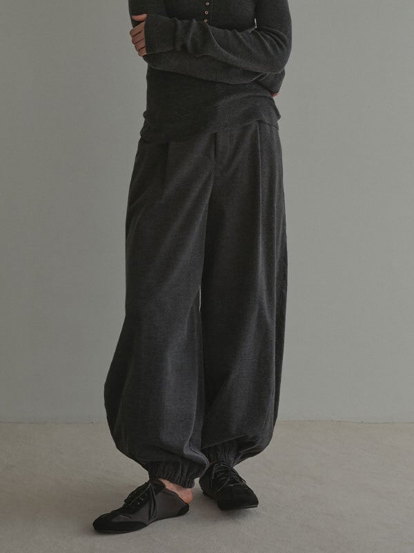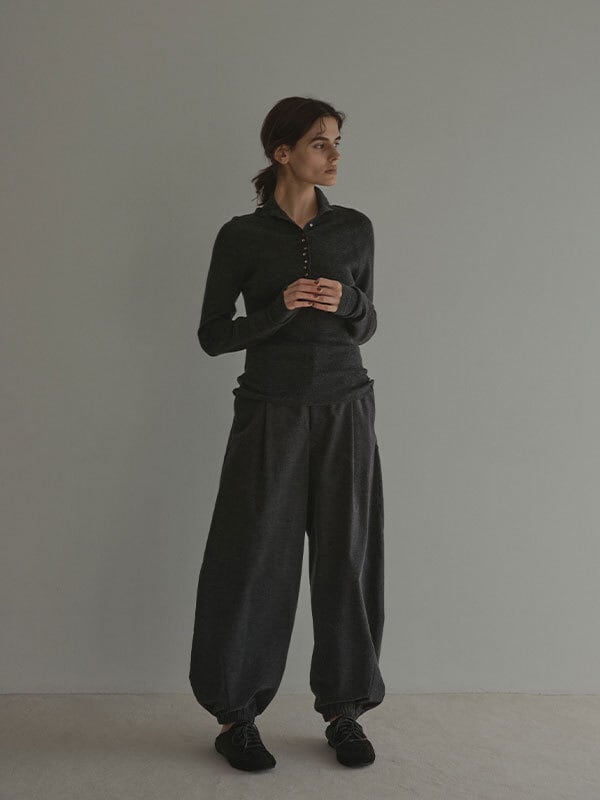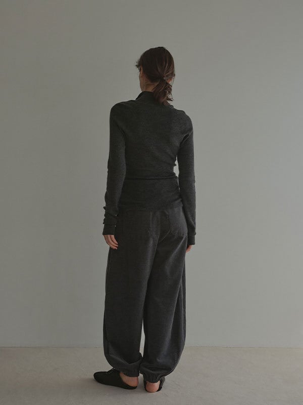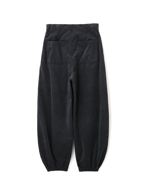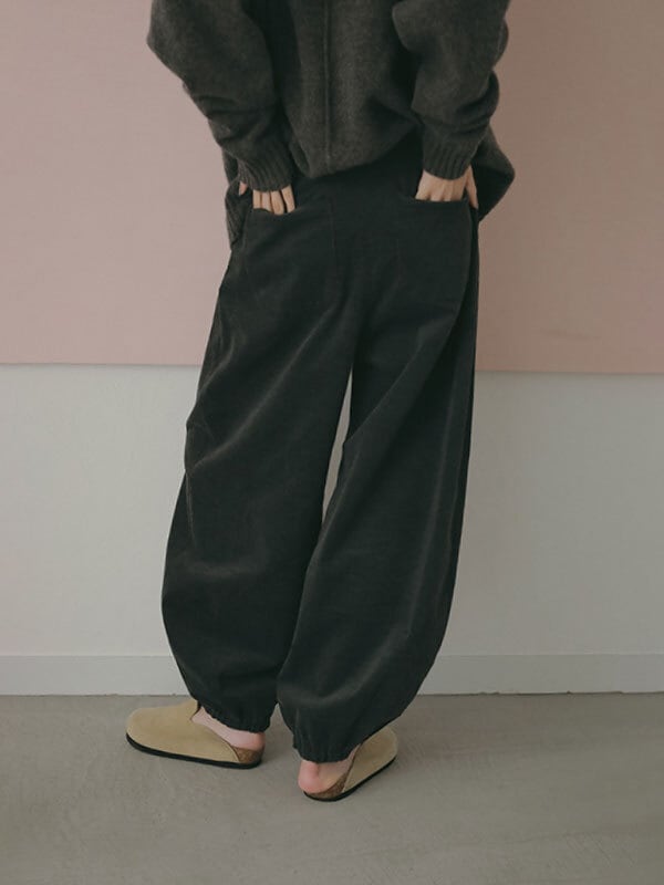 丸みのあるシルエットが女性らしい柔らかさを引き立てる、コーデュロイジョガーパンツ。ストレッチ性のあるコーデュロイ生地を使用、やわらかく、ほどよい厚みと温かみを兼ね備えています。滑らかな肌触りで、カジュアルな中にも品のある印象に。裾にかけて緩やかに広がるカーブシルエットが特徴で、ふんわりと丸みを帯びたフォルムが抜け感を演出。裾はゴム仕様でホールドされ、足元に自然なボリュームが生まれます。フロントはタック入りでウエスト周りにほどよいゆとりを持たせながら、もたつきなくすっきりと着用できる仕上がりに。存在感のあるシルエットながら、合わせるトップスを選ばず、ニットやカットソー、シャツ等とも好相性。ジャケットやコートを羽織れば、秋冬らしいニュアンスのあるスタイリングに。動きやすさとシルエットの美しさを両立した、デイリーに頼れる一本です。