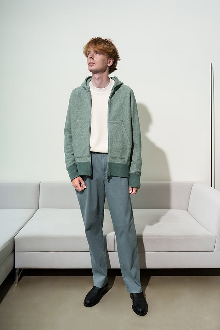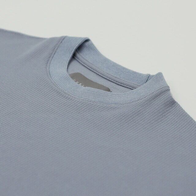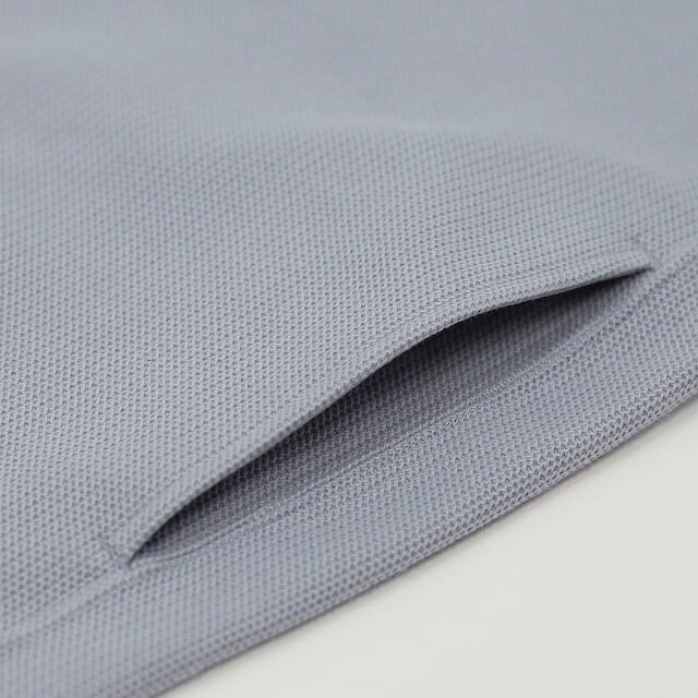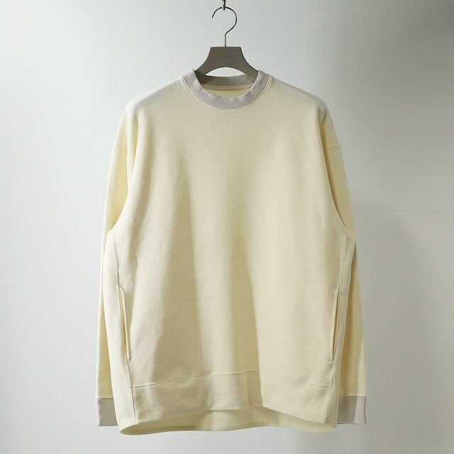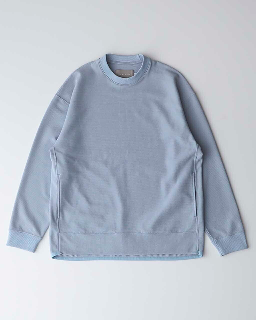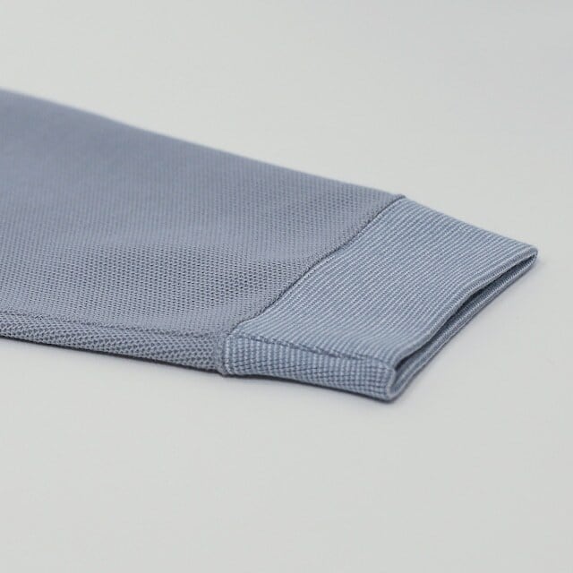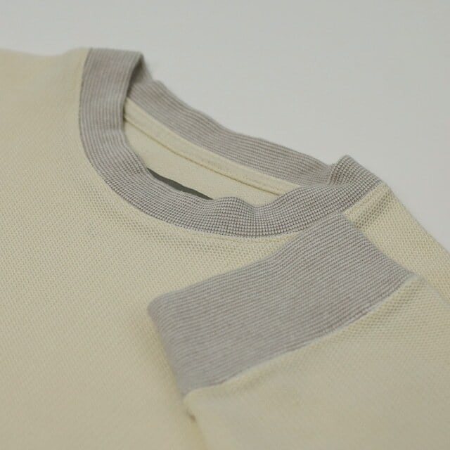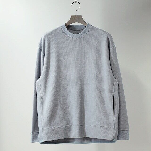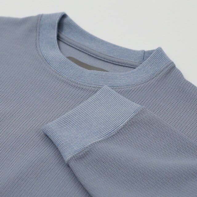 コットンにポリエステルをブレンドした鹿の子ジャージー素材を用いたプルオーバー。スプリングセーターをベースにしたニットソーはセーターよりも格段に取り扱い易いです。襟と袖口カフスにはオリジナルに編み立てたミジンボーダー柄をあしらい、シンプルなボディのちょっとしたアクセントになっています。立体的な鹿の子組織は適度な厚みがありながらも軽量であり、ドライタッチも相まって着心地は抜群。前身頃の裾は共地の切り替えに対して、後ろ身頃はバインダー仕様にすることでシルエットに若干の丸みを演出しています。シームポケット有り。