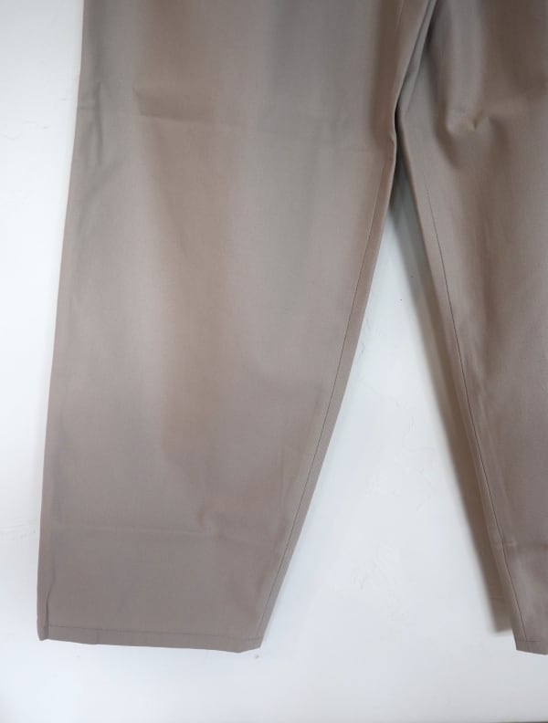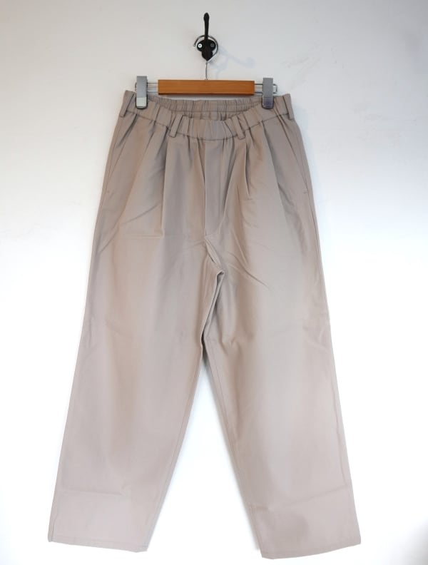 ハイツイストコットンワイドパンツ。適度なハリ感とシャリ感のあるオーガニックコットン強撚コンパクトツイル生地を使用。オールシーズンで着れる軽量中厚生地。2タックでワタリにゆとりをもたせたリラックスワイドシルエット。ウェストゴム仕様のイージーパンツタイプ。