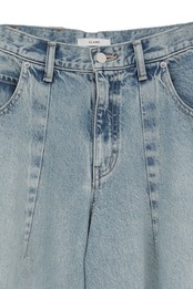 バルキーで立体的なコクーンシルエットが特徴のデニムパンツ。切り替えとダーツで生み出した丸みのあるフォルムが、抜け感と女性らしさを演出します。腰で履くゆるいシルエットながら、裾に向かって細くなるラインでボリュームが出すぎず、バランス良く着用いただけます。全体的にゆとりがあり、気になる部分を自然にカバーしてくれるのも魅力。カジュアルにもモダンにも合わせやすい一本で、程よいヴィンテージ加工を施したブルーです。