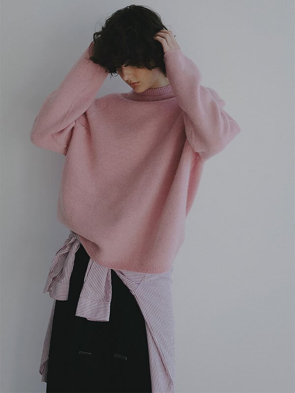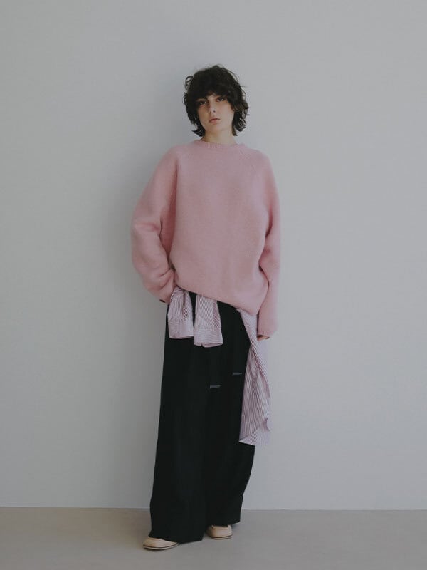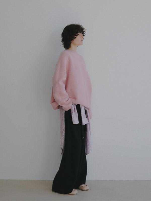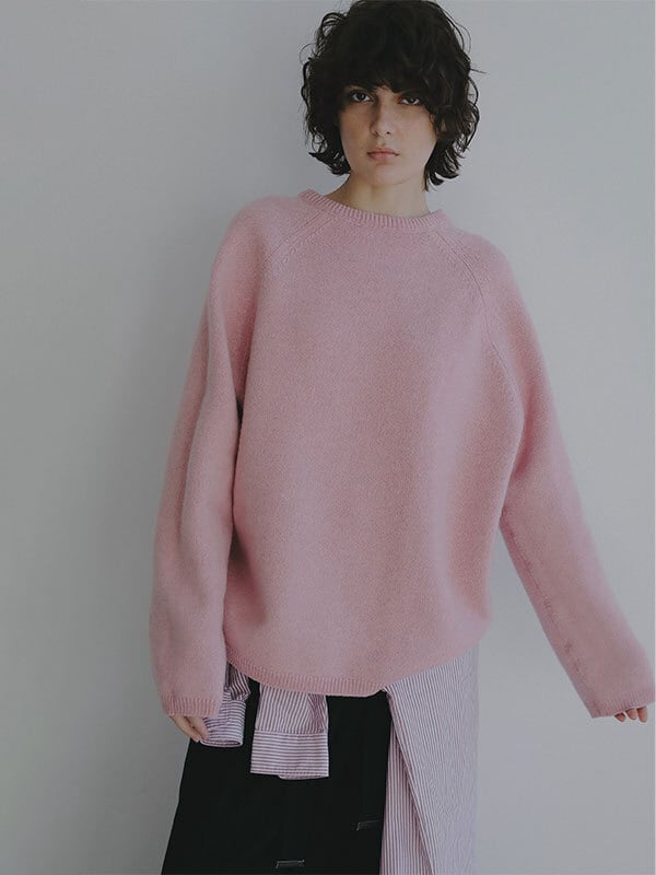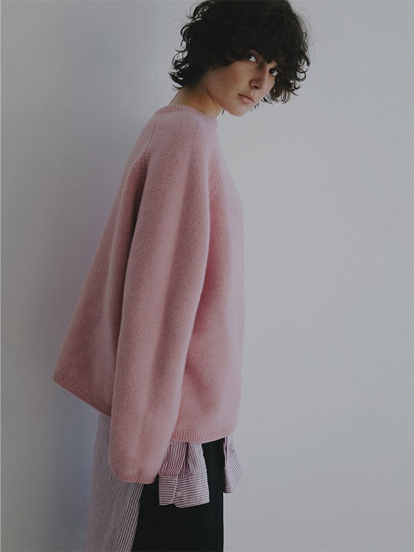 ウール100%ならではのやわらかな風合いが、肩の力を抜いた大人の佇まいを演出するリバーシブルニットプルオーバー。素材には上質なウール糸を使用、素肌に触れても心地よいなめらかさと軽やかな温もりを両立。天竺編みの表情豊かな表側と、異なる編み地を施した裏側で印象に変化をつけ、 気分やスタイリングに合わせて表情を選べる2way仕様に仕上げています。ウール特有のふっくらとした質感がありながらも厚みを抑え、ロンT感覚で取り入れやすい点も魅力。シルエットはほどよくゆとりを持たせたボックスラインを採用し、肩の落ちたラインが自然な抜け感をプラス。身体のラインを拾いすぎず、リラックス感がありながらもどこか洗練された印象を保ちます。ネックラインや裾、袖口はミニマルにまとめ、リバーシブルデザインでありながらもすっきりとした見え方に。編み地の切り替えによる立体感が、シンプルな中に奥行きを与えています。一枚でさらりと着るのはもちろん、シャツをレイヤードして裾や襟元にニュアンスを加えるスタイリングもおすすめ。ワイドパンツや落ち感のあるスラックスと合わせれば、肩の力を抜いた都会的なバランスに仕上がります。シーズンを通して着回しやすく、ワードローブに自然と馴染む一着です。