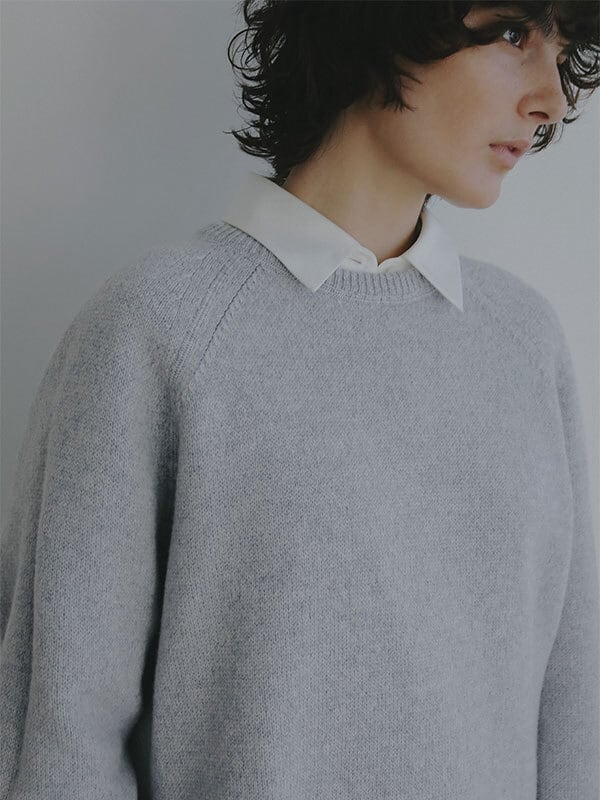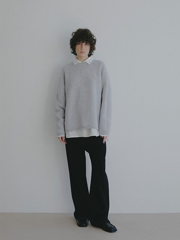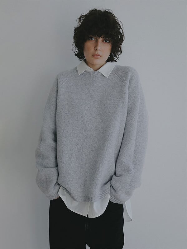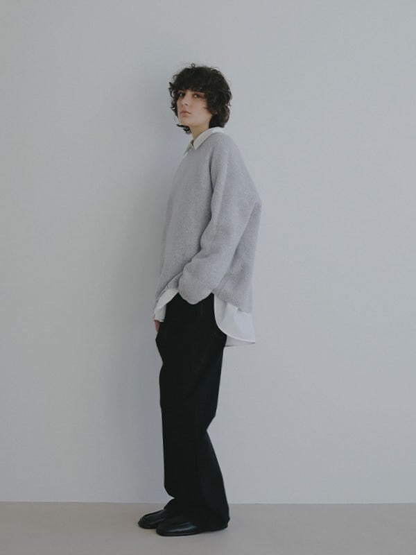 ウール100%ならではのやわらかな風合いが、肩の力を抜いた大人の佇まいを演出するリバーシブルニットプルオーバー。素材には上質なウール糸を使用、素肌に触れても心地よいなめらかさと軽やかな温もりを両立。天竺編みの表情豊かな表側と、異なる編み地を施した裏側で印象に変化をつけ、 気分やスタイリングに合わせて表情を選べる2way仕様に仕上げています。ウール特有のふっくらとした質感がありながらも厚みを抑え、ロンT感覚で取り入れやすい点も魅力。シルエットはほどよくゆとりを持たせたボックスラインを採用し、肩の落ちたラインが自然な抜け感をプラス。身体のラインを拾いすぎず、リラックス感がありながらもどこか洗練された印象を保ちます。ネックラインや裾、袖口はミニマルにまとめ、リバーシブルデザインでありながらもすっきりとした見え方に。編み地の切り替えによる立体感が、シンプルな中に奥行きを与えています。一枚でさらりと着るのはもちろん、シャツをレイヤードして裾や襟元にニュアンスを加えるスタイリングもおすすめ。ワイドパンツや落ち感のあるスラックスと合わせれば、肩の力を抜いた都会的なバランスに仕上がります。シーズンを通して着回しやすく、ワードローブに自然と馴染む一着です。