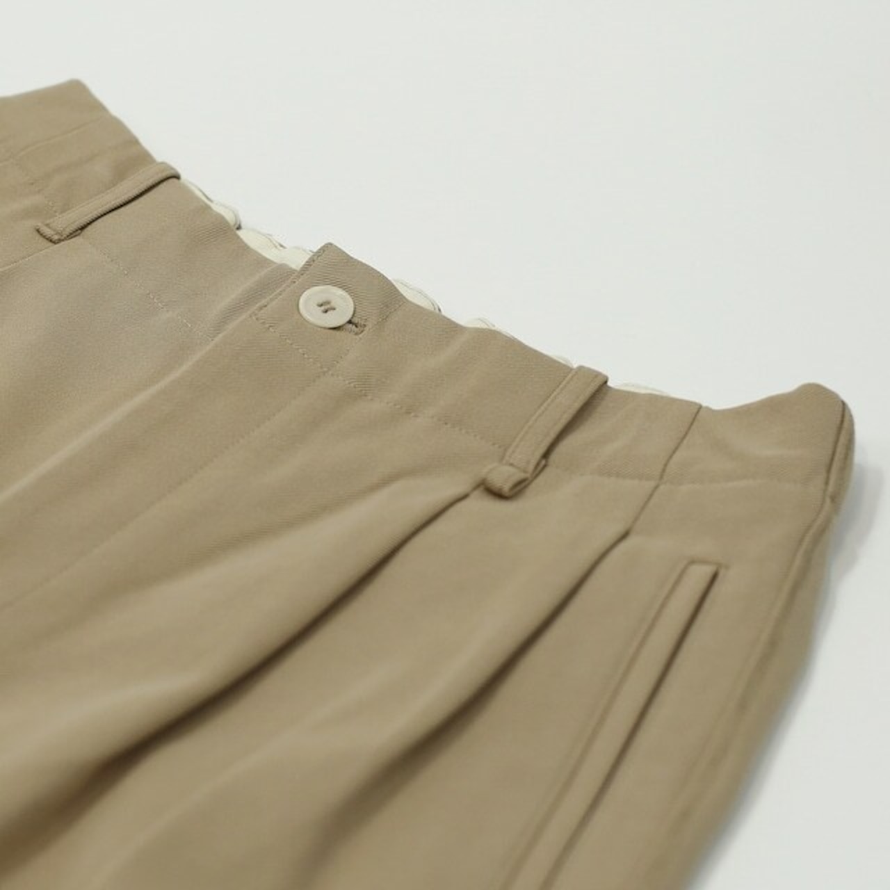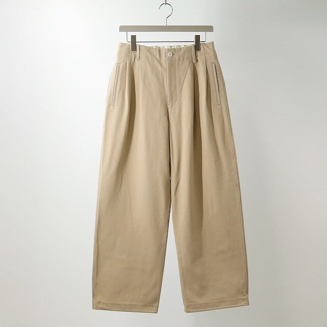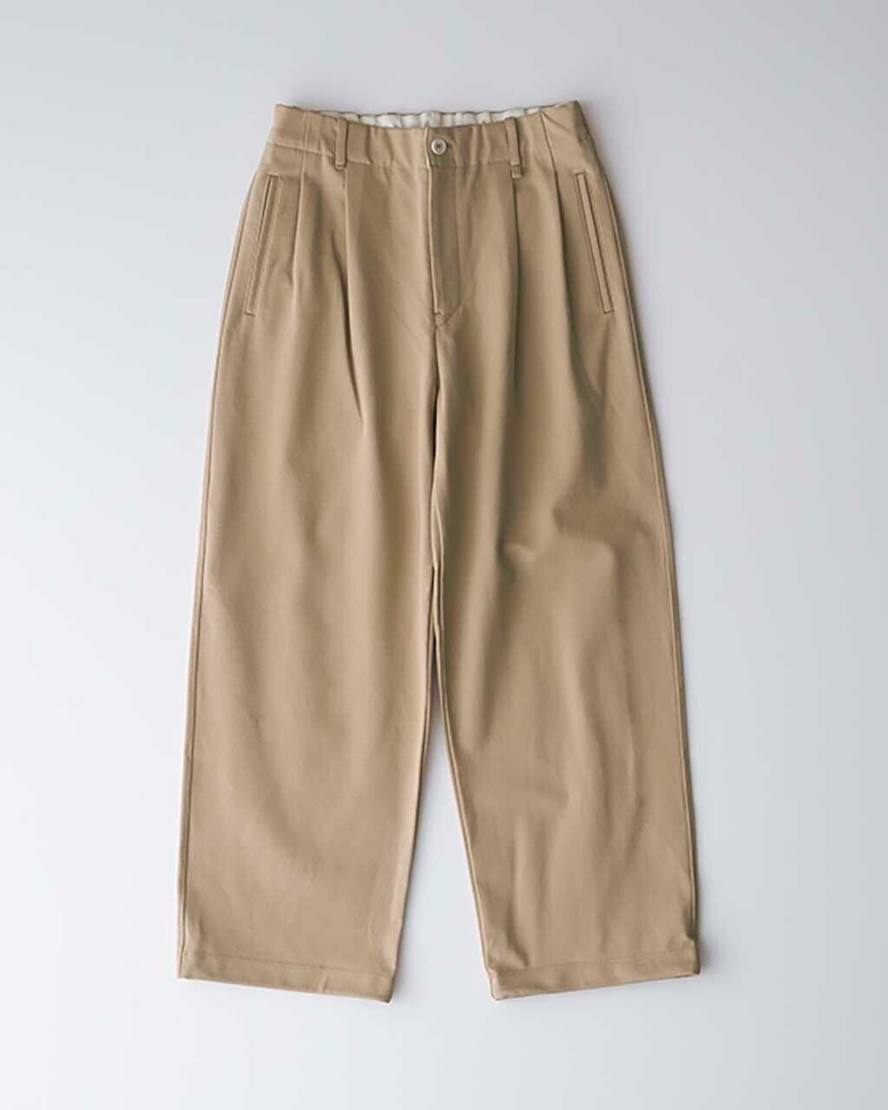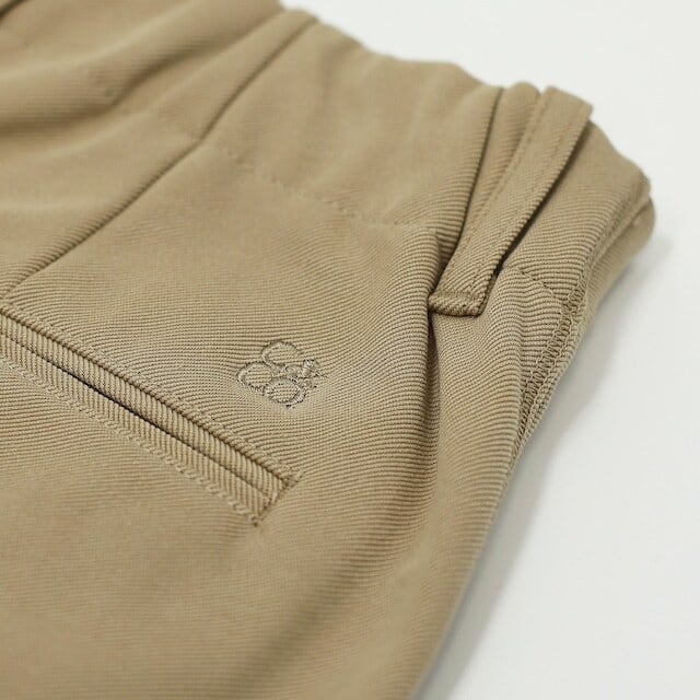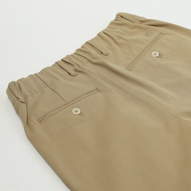 コットンにポリエステルをブレンドしたオリジナルのハイゲージダブルニット素材を用いたストレートシルエットのパンツ。いわゆるチノクロスと呼ばれるオーセンティックな生地を編み素材で再現することにより、軽量でシワになりにくく動き易い特性を持った新たな”ニットチノ”を開発しました。スーピマ混60/-と東レ(株)のPBT繊維、サモーラ、を交編し、番手適合ゲージ限界までハイゲージで編み立てました。2タックデザインで腰回りから全体的にゆとりのあるワイドシルエット。前ポケットは切り替えではなく片玉縁ポケット仕様、後ポケットは両玉縁仕様で左側のみ三角フラップ付き。ベルトはクラシックな裁ち出し仕様。裾のドローコードでシルエット変化を楽しめます。脇にはカットソー専用ミシンの象徴である飾り二本針のステッチを施しています。後ろベルトのみにエラスティックバンドを使用したバックイージー仕様。後ろポケット右側に刺繍有り。