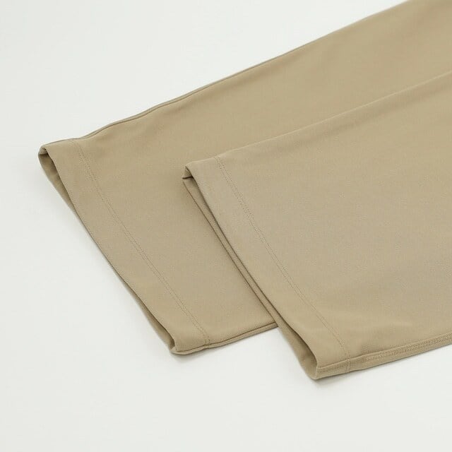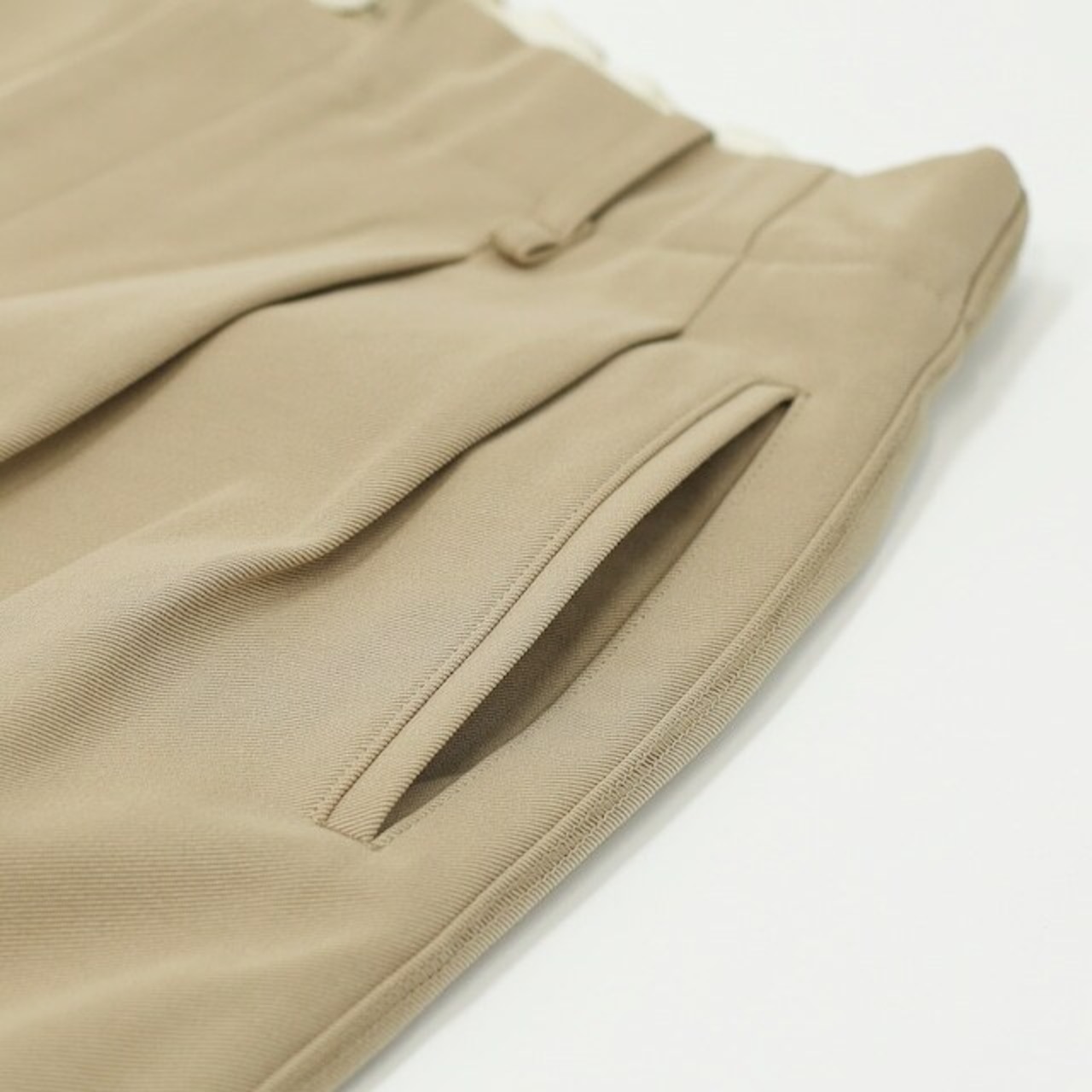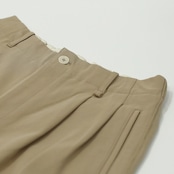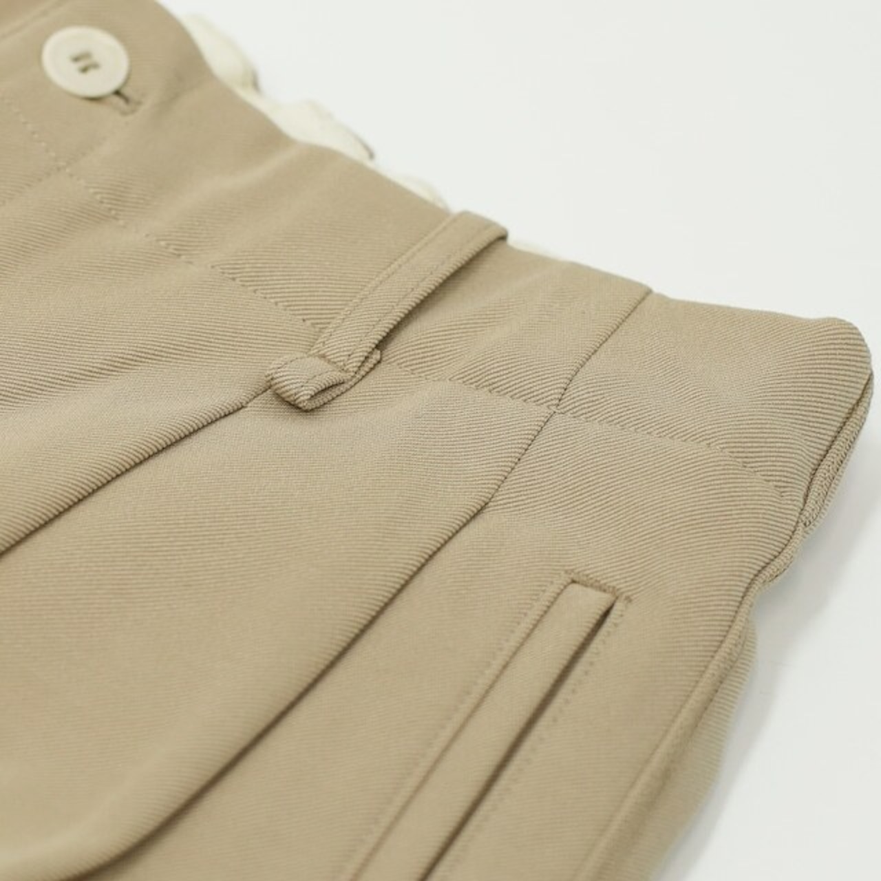 コットンにポリエステルをブレンドしたオリジナルのハイゲージダブルニット素材を用いたストレートシルエットのパンツ。いわゆるチノクロスと呼ばれるオーセンティックな生地を編み素材で再現することにより、軽量でシワになりにくく動き易い特性を持った新たな”ニットチノ”を開発しました。スーピマ混60/-と東レ(株)のPBT繊維、サモーラ、を交編し、番手適合ゲージ限界までハイゲージで編み立てました。2タックデザインで腰回りから全体的にゆとりのあるワイドシルエット。前ポケットは切り替えではなく片玉縁ポケット仕様、後ポケットは両玉縁仕様で左側のみ三角フラップ付き。ベルトはクラシックな裁ち出し仕様。裾のドローコードでシルエット変化を楽しめます。脇にはカットソー専用ミシンの象徴である飾り二本針のステッチを施しています。後ろベルトのみにエラスティックバンドを使用したバックイージー仕様。後ろポケット右側に刺繍有り。