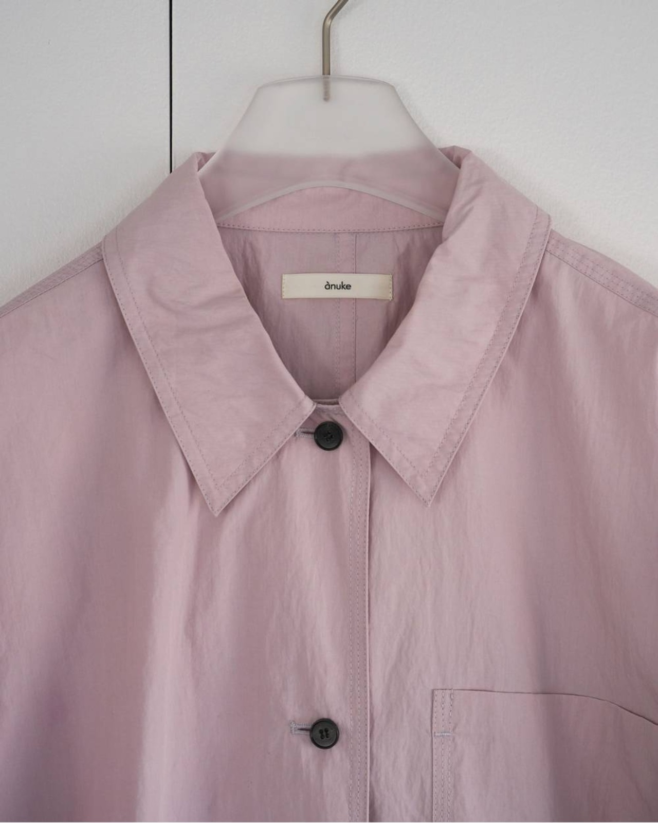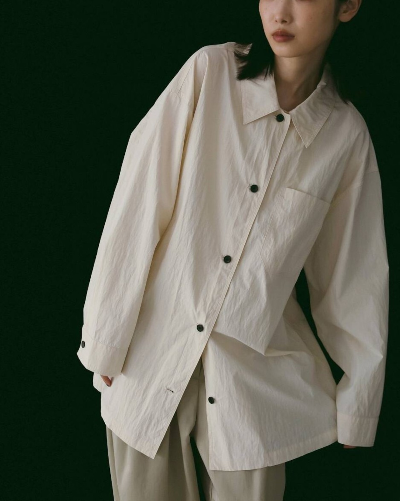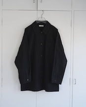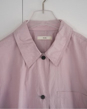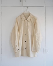 ステンカラーデザインで仕上げたオーバーシャツ。すっぽりと腰回りを覆ったラフなサイズで、軽めの羽織りとしても着回していただきやすい一枚。洗い晒したような自然なシワ感のある素材を使用し、ステッチを効かせカジュアルな仕上がりに。シーズン問わず使える万能なアイボリーとブラック、甘くなり過ぎない少し青みがかった絶妙なトーンで仕上げたピンクの3色展開。黒のボタンを使用し、淡色は配色がアクセントになり、全色モードな印象で着ていただけます。