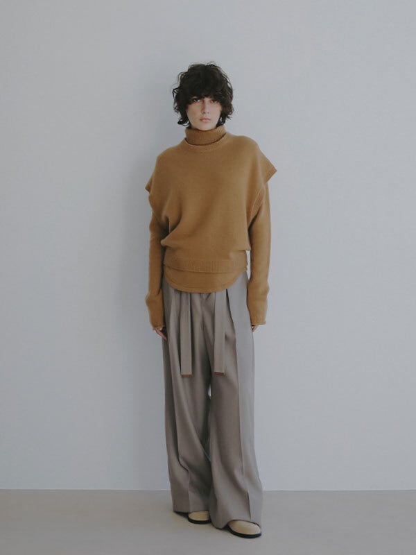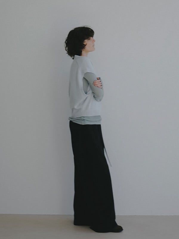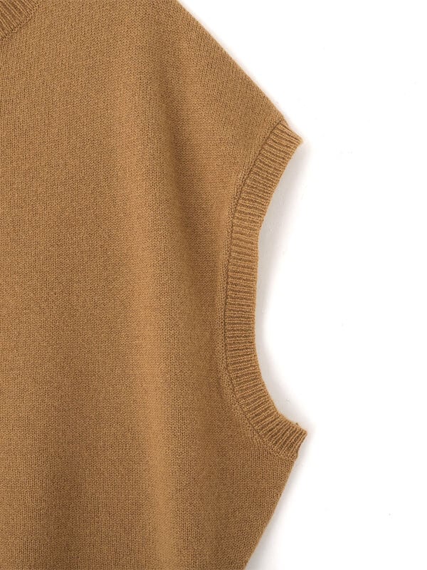 ウールカシミヤの上質な風合いが引き立つ、洗練された佇まいのスリーブレスニットプルオーバー。バソラン加工を施したメリノウールにカシミヤをブレンドし、縮みにくさとやさしい肌触りを両立。しっとりとなめらかで、肌に触れた瞬間からぬくもりを感じる素材感は、素肌の上にも心地良く毎日でも手に取りたくなる一枚です。肩まわりをすっきりと見せるスリーブレスデザインに、クルーネックのミニマルな表情を掛け合わせることで、 シンプルながらも端正な印象に。直線的なシルエットでレイヤード時にももたつかず、全体をバランスよくまとめてくれます。同素材のタートルネックニットとのレイヤードでは、襟元や裾からのぞくニュアンスが奥行きのあるスタイルを演出。シャツやシアートップスをインすれば、軽やかさと立体感が加わり、着こなしの幅が広がります。ジャケットのインナーとしても相性が良く、落ち着きのある佇まいと柔らかな素材感が調和した、 洗練されたスタイリングを楽しめるアイテムです。