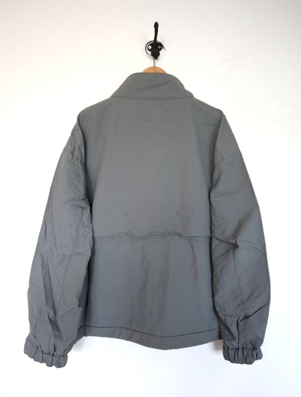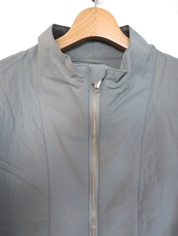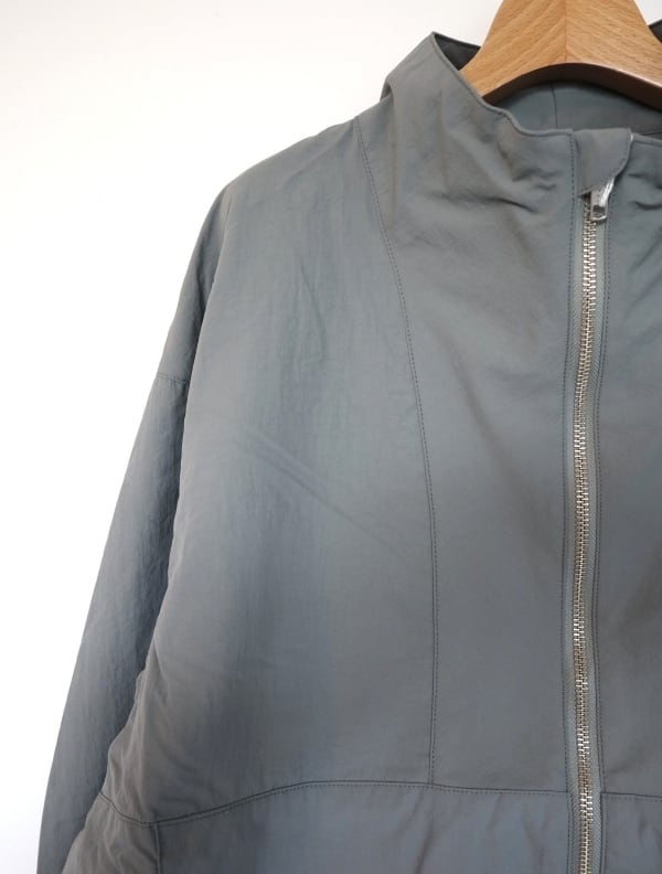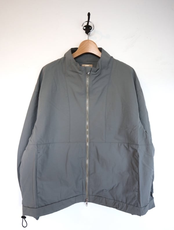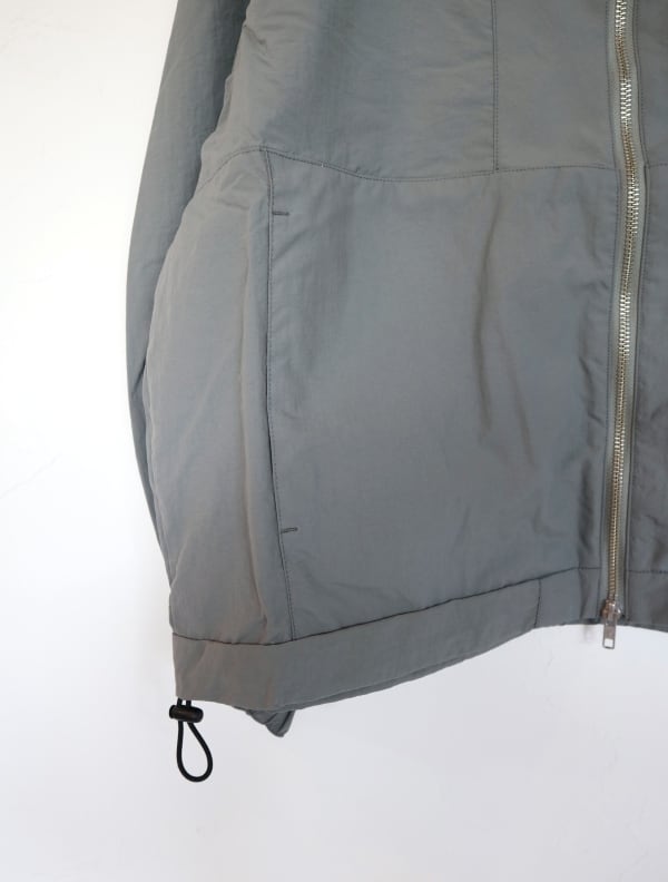 程よいハリとシボ感のあるシャカシャカとした質感の軽量ナイロン生地を使用。身幅にゆとりをもたせ肩を落としたリラックスシルエット。フロントはダブルジップ仕様。サイドにシームポケット付き。ネックは浅く広いスタンドネック。裾内側両サイドにドローコードが付きシルエットの調節ができます。春に活躍するライトウェイトブルソンです。