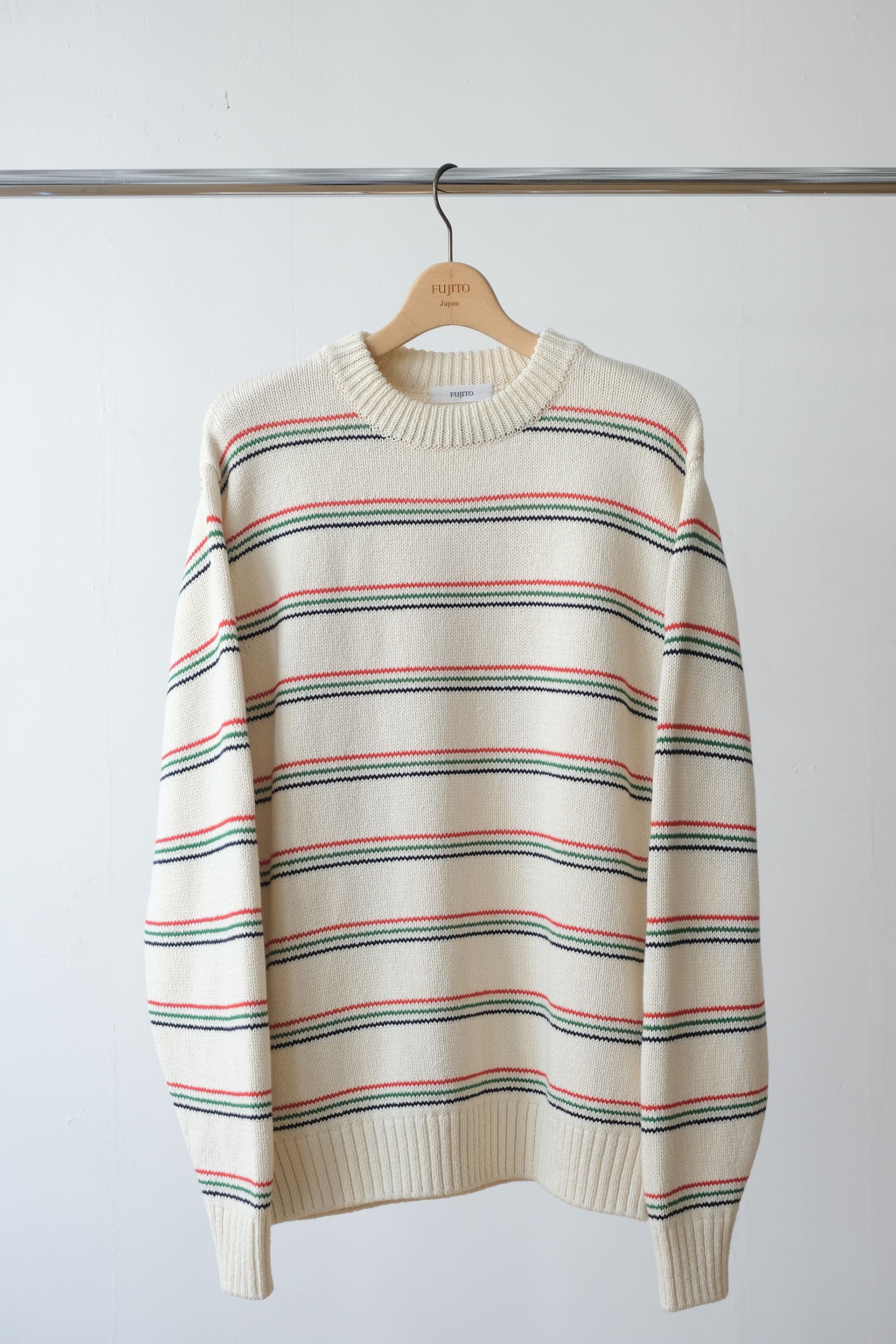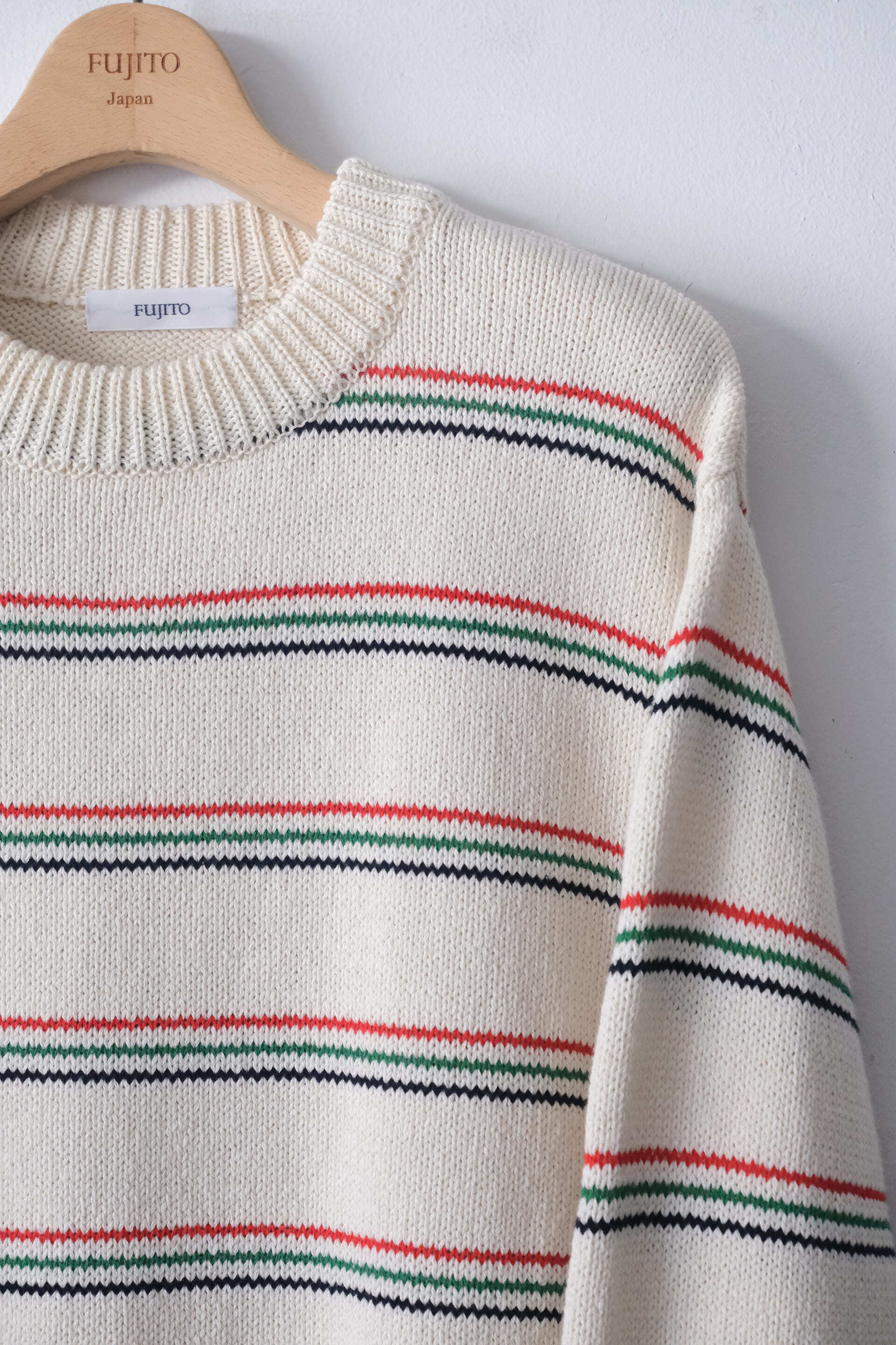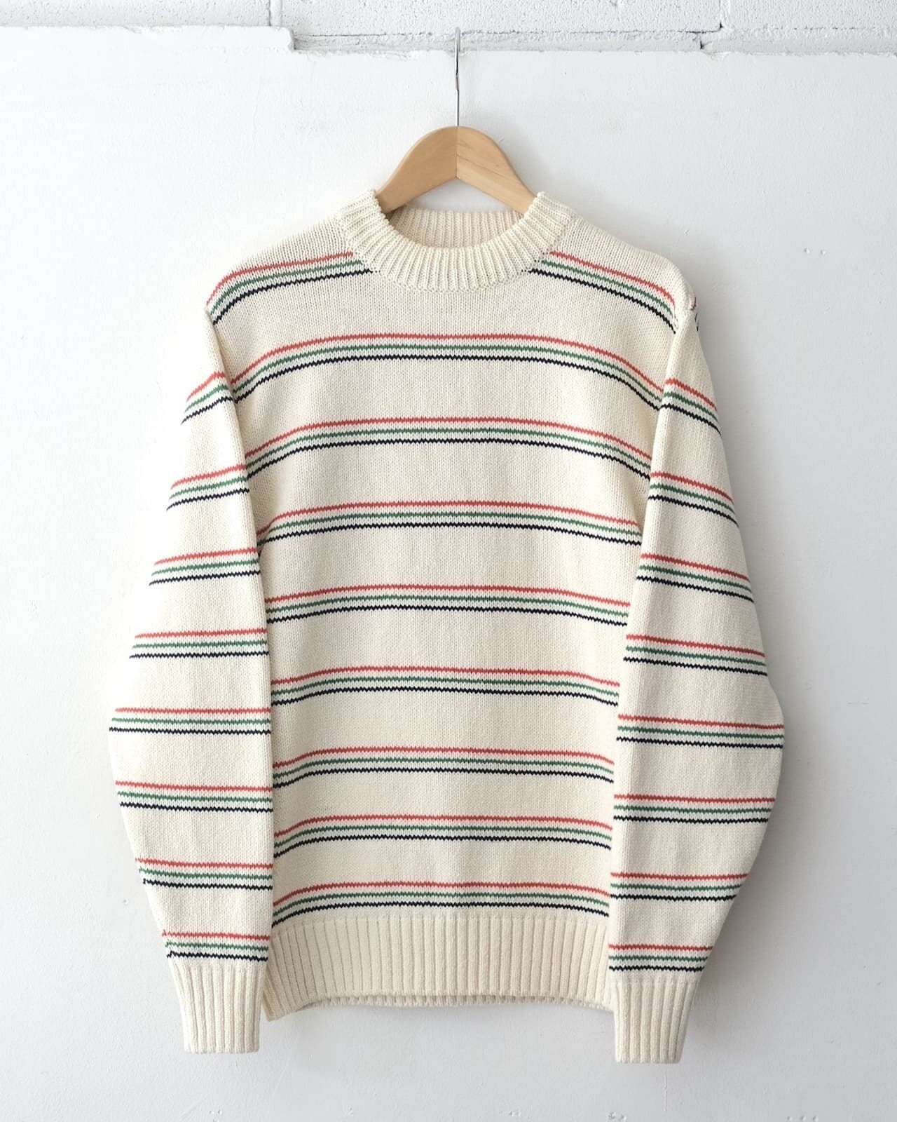 このセーターは、ローゲージのオーガニックコットンで編まれたざっくりとした風合いが特徴です。程よくゆったりとしたシルエットで、ネック部分の太めのリブもポイントです。コットン素材なのでストレス無く着ていただけ、それぞれ違った3色ラインのボーダー柄が着こなしのアクセントになりオススメです。