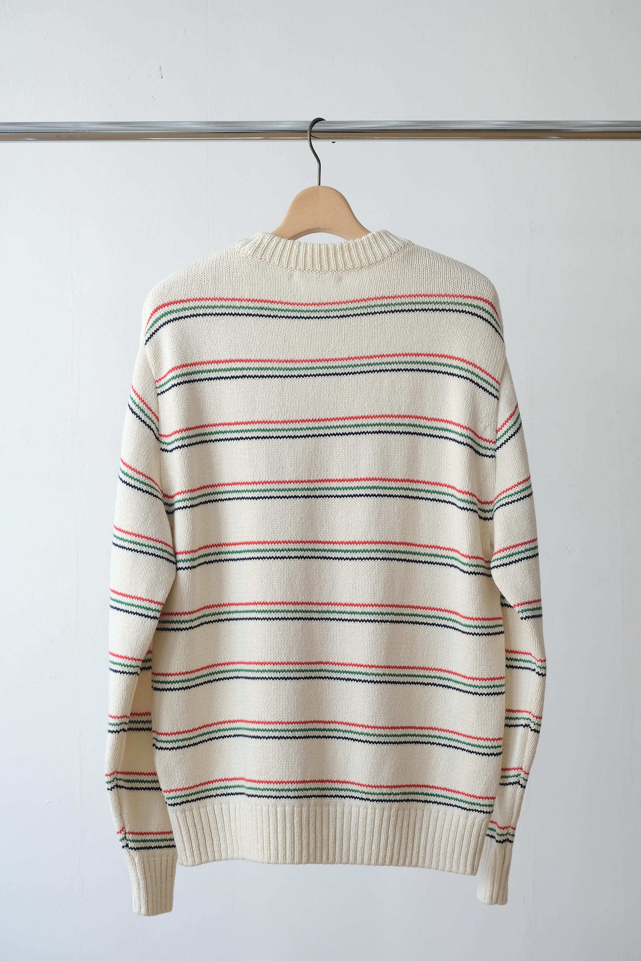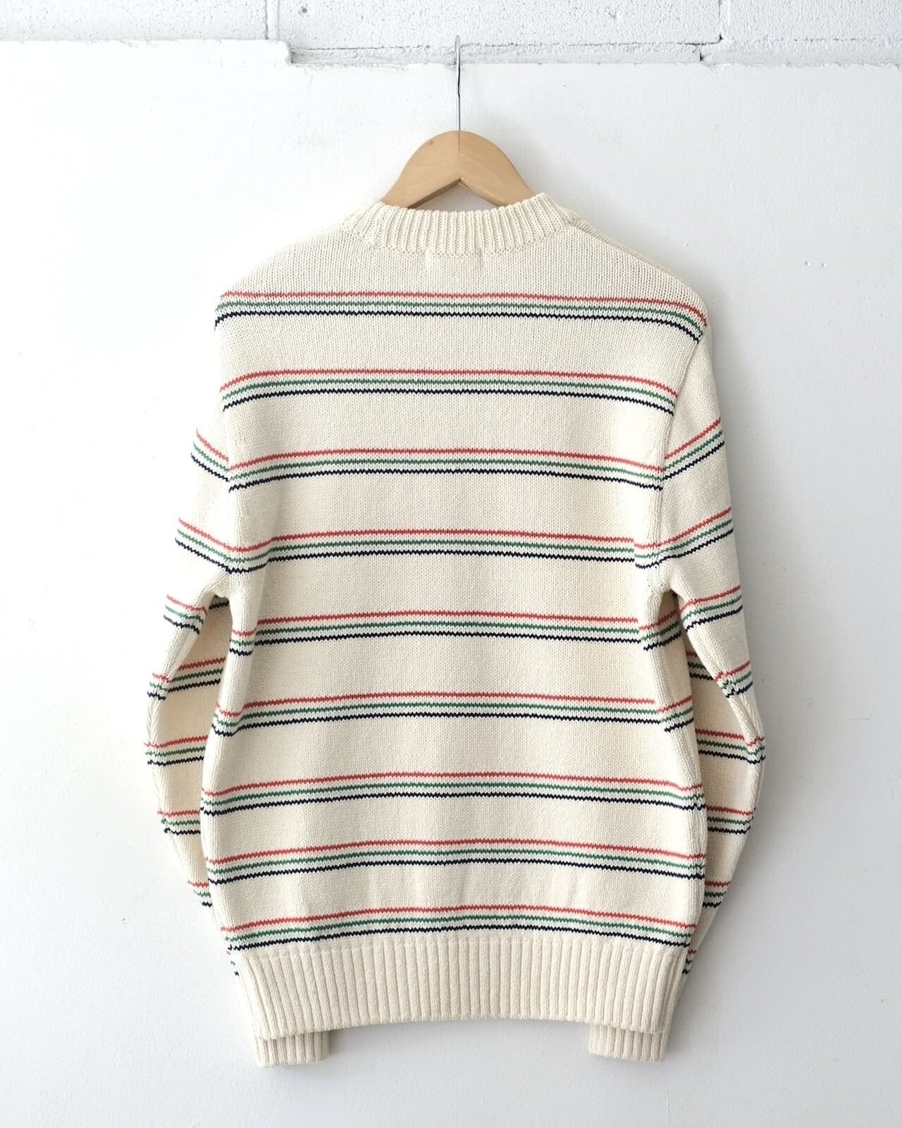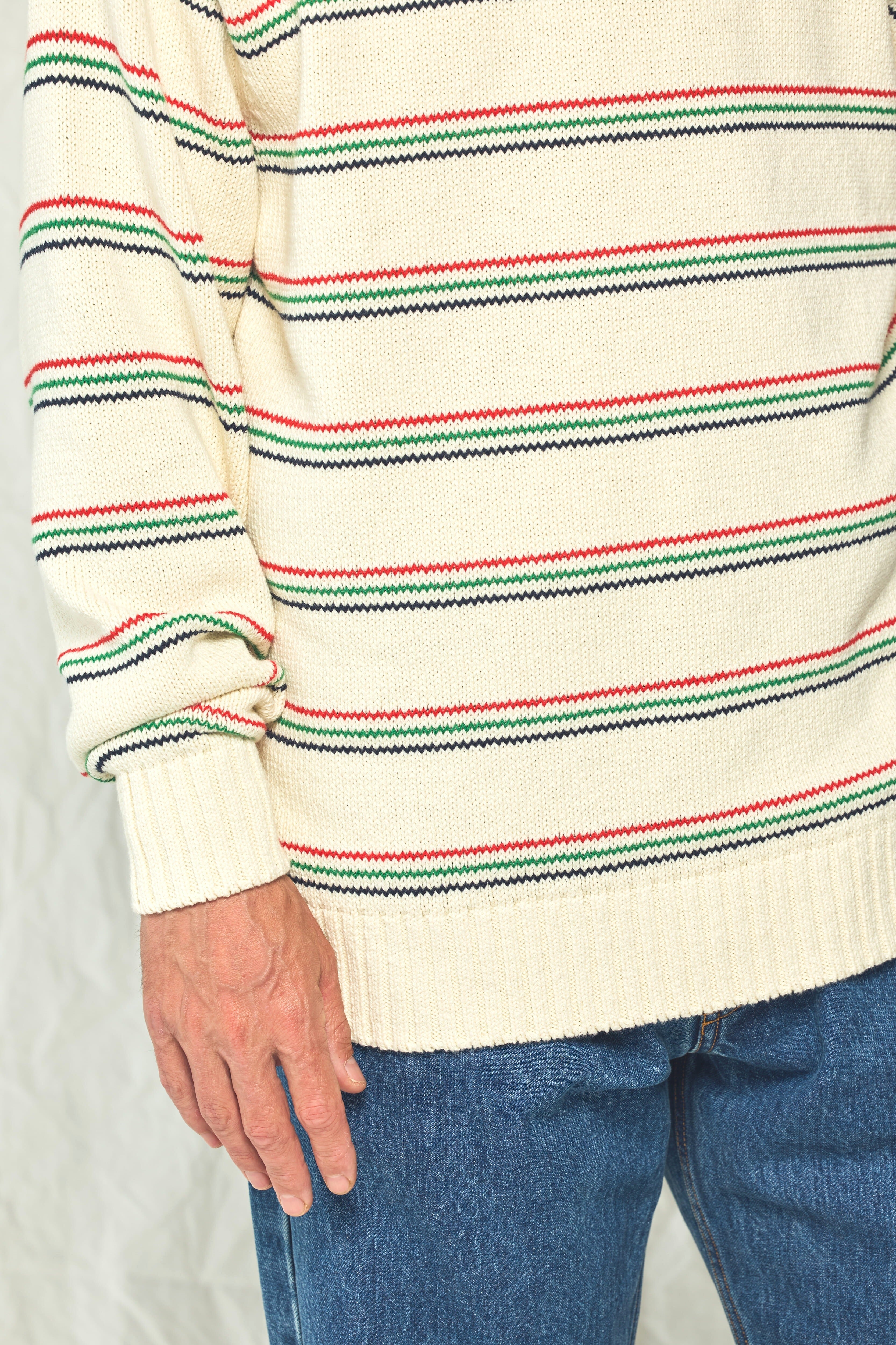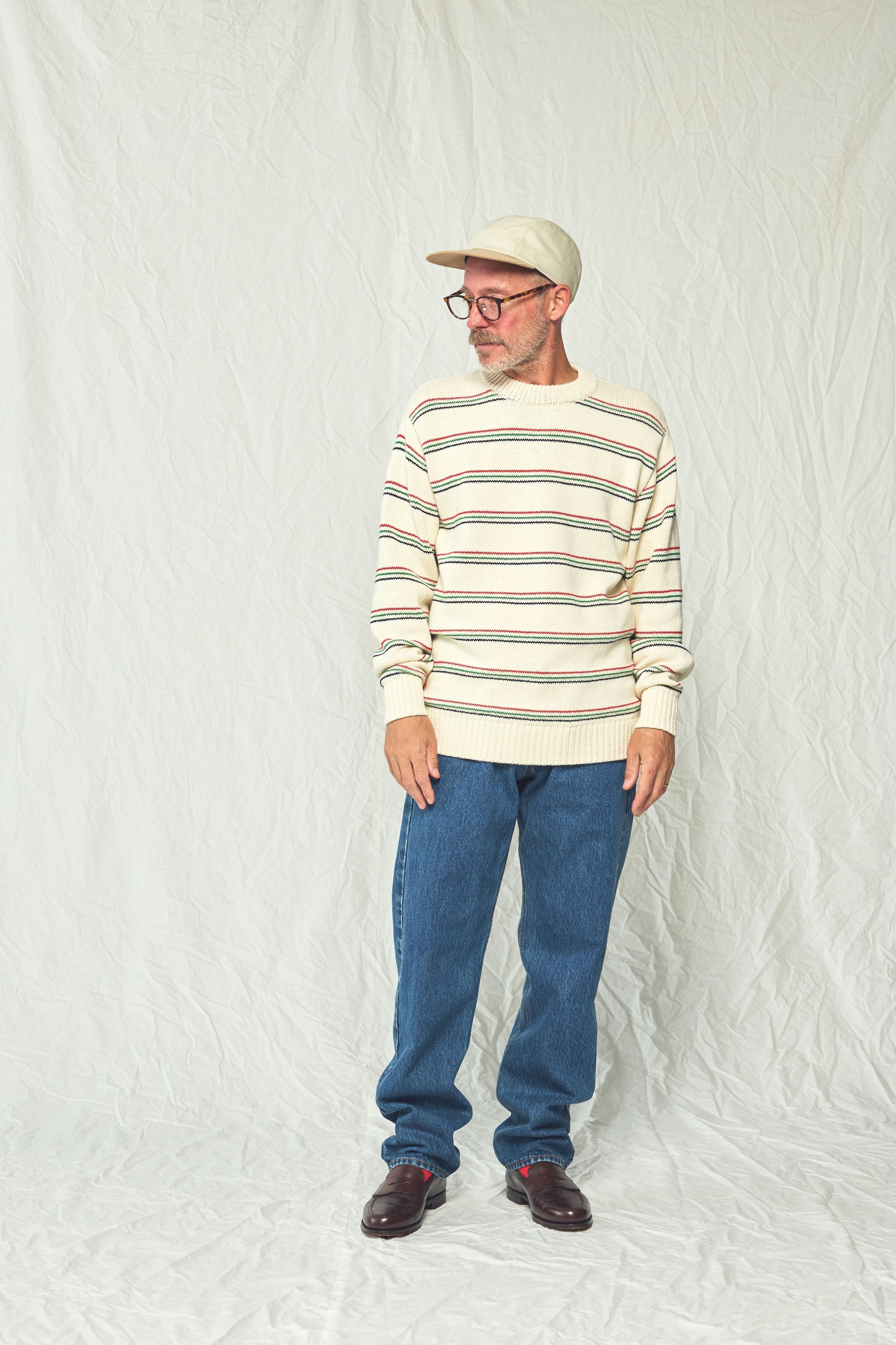 このセーターは、ローゲージのオーガニックコットンで編まれたざっくりとした風合いが特徴です。程よくゆったりとしたシルエットで、ネック部分の太めのリブもポイントです。コットン素材なのでストレス無く着ていただけ、それぞれ違った3色ラインのボーダー柄が着こなしのアクセントになりオススメです。