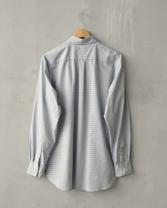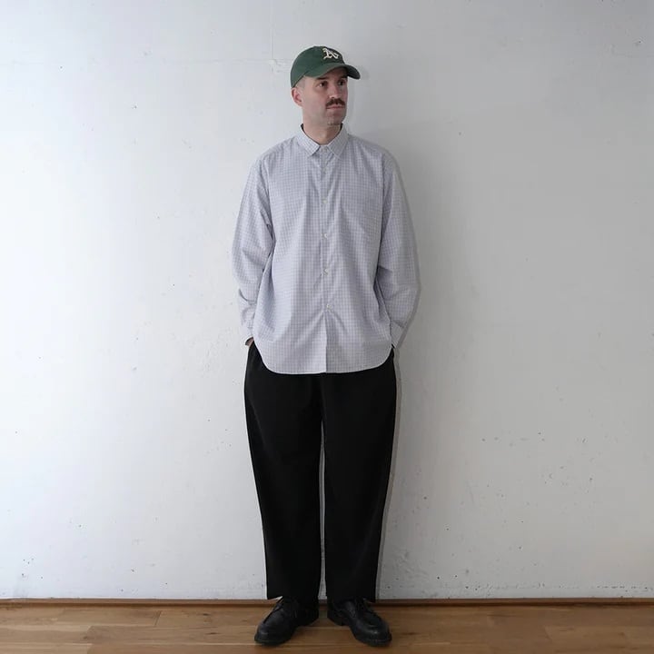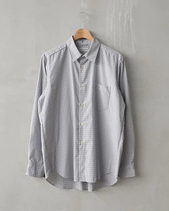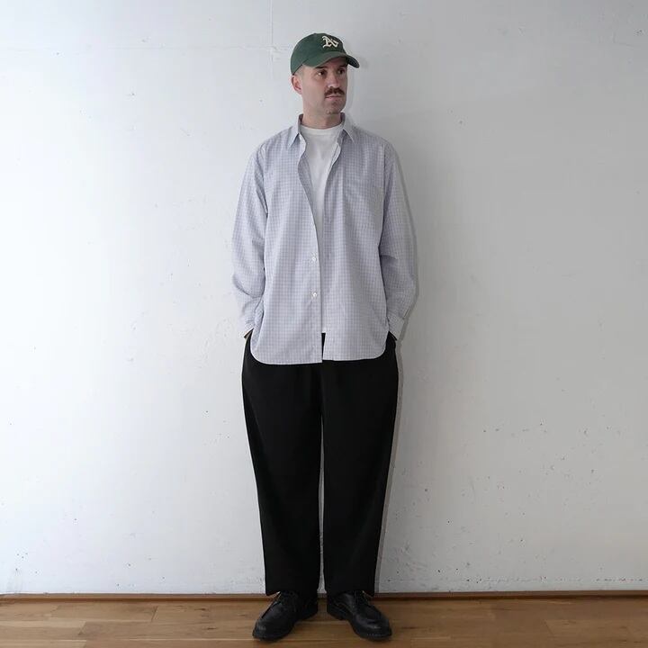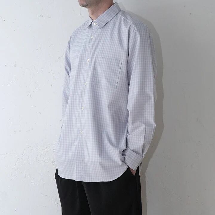 レーヨンの落ち感と滑らかさに、ポリエステルのハリと耐久性を融合させたハイブリッド素材を使用したレギュラーカラーシャツ。それぞれの素材の弱点を補い合いながら、快適な着用感と扱いやすさを両立しています。アウトドアブランドの古着を思わせるフェード感のあるチェックを採用。ややノスタルジックな印象のあるチェックに対し、端正でミニマルなパターン設計を組み合わせることで、現代的なバランスに仕上げました。シルエットは、程よくリラックスしたLOOSE FITパターン。脇下から自然に広がるAラインと、ステッチを極力省いたクリーンな表情が特徴の定番シャツです。