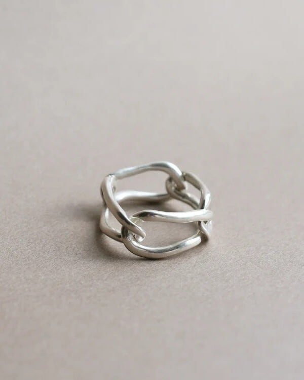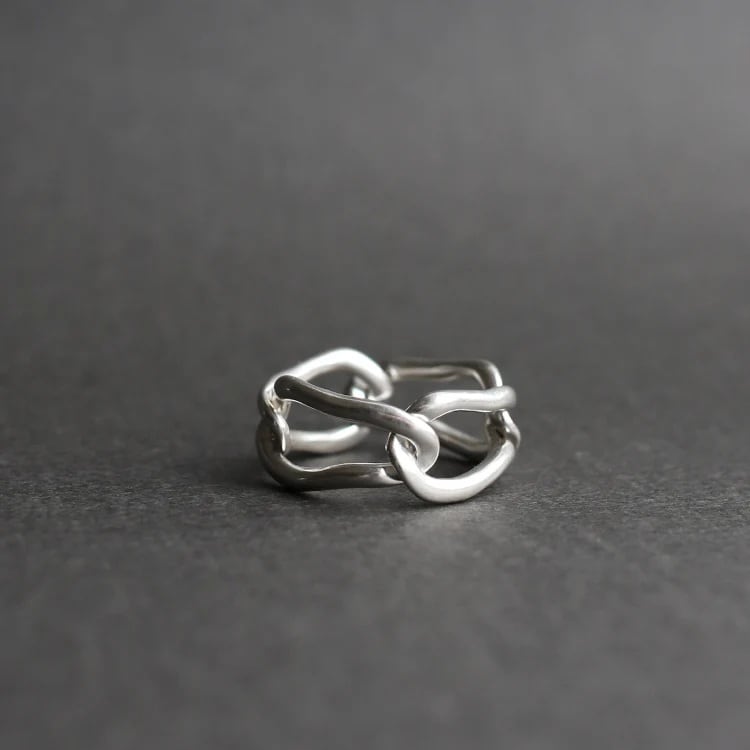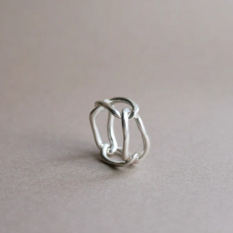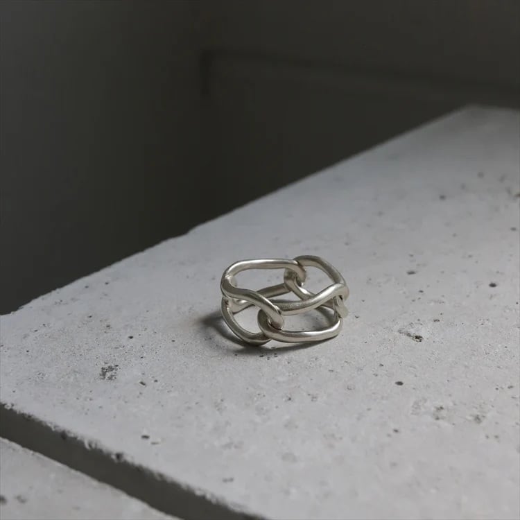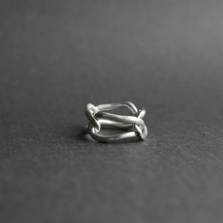不要な箇所を削ぎ落し、肌当たりの良いチェーンリングを作ることで、スタイリングにスパイスを与えられるようなリングに仕上がりました。