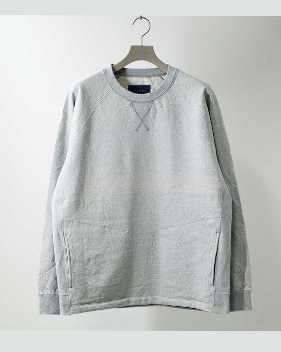 リサイクルデニムコットン裏毛を用いたクルーネックのプルオーバー。全国で回収されたデニムとリサイクルコットンを反毛し、更にオーガニックコットンをブレンドした環境配慮型の素材なので、1点1点の見え方が異なります。クルーネック、ラグランスリーブ、汗止め付きのオーセンティックな”トレーナー”型をベースに、ストレートシルエットで抜け感を出しています。前身頃は折り返し仕様、後ろのみリブ切り替えで前後の印象に変化を出しています。洗濯後の縮みをなくすために丁寧に製品洗いをしているので購入した時から直ぐに肌に馴染みます。シームポケット有り。