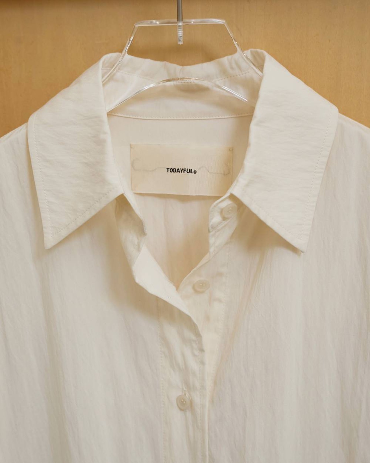 シルクのような光沢と軽やかな着心地が魅力のシャツ。シボ感のある生地と両サイドのタックがシャープな立体感をうみだし、ボトムスとのバランスも取りやすい丈感がスタイルアップ見えする一枚です。