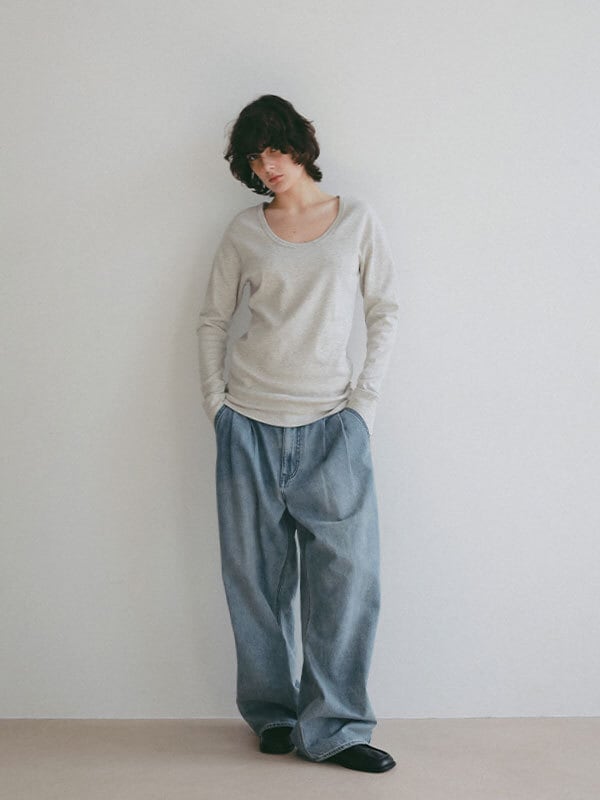 ライトオンスならではの軽やかな穿き心地と、タックが生み出す立体的なシルエットが魅力のデニムワイドパンツ。綿100のデニム素材を使用、デニム特有のカジュアルさを残しながらも、軽さとやわらかさを兼ね備えた風合いに仕上げています。ほどよくラフな表情がありながら、春の装いに取り入れやすい軽快さがあり、長時間の着用でもストレスを感じにくい快適な穿き心地を実現。ハイウエスト設定でスタイルアップを叶えつつ、ウエストはベルトレス仕様にすることでミニマルな印象に。デニムでありながらフロントにタックを取り入れることで、立体感のあるワイドシルエットを表現しています。内側にはサイズ調整が可能な紐を配しているため、リラクシングなフィット感で着用できるのもポイント。腰まわりはすっきりと見せながら、脚のラインを拾わないゆとりのあるフォルムで、抜け感のあるバランスに仕上げました。コンパクトなトップスやフィット感のあるカットソーと合わせてウエストまわりのデザインを活かした着こなしはもちろん、 オーバーサイズのニットやスウェットをラフに合わせてもサマになる一着。シャツやカーディガンを合わせたきれいめカジュアルなスタイリングにも馴染み、季節を問わず幅広いコーディネートで活躍します。