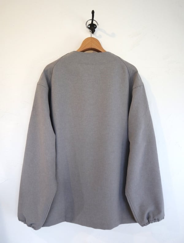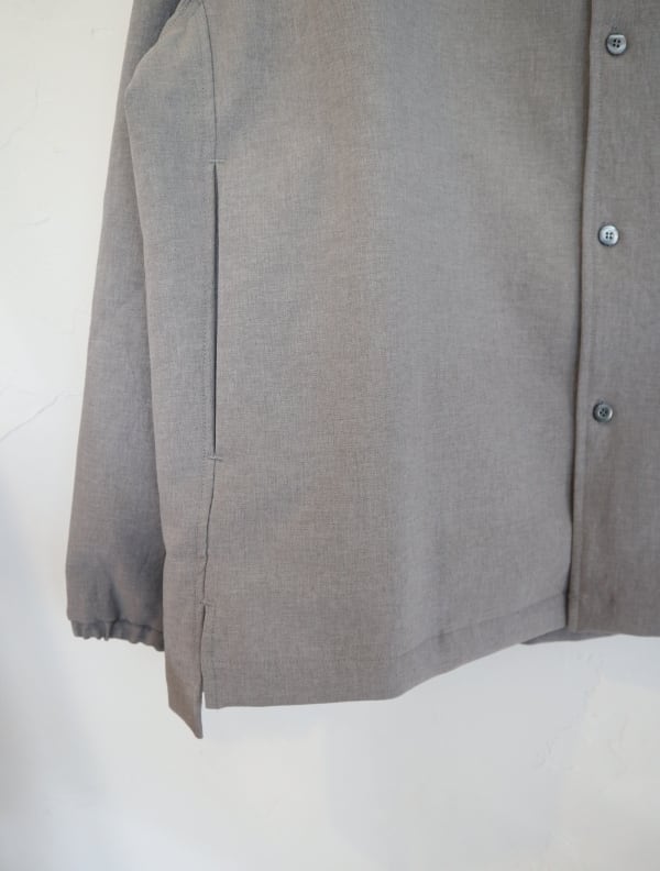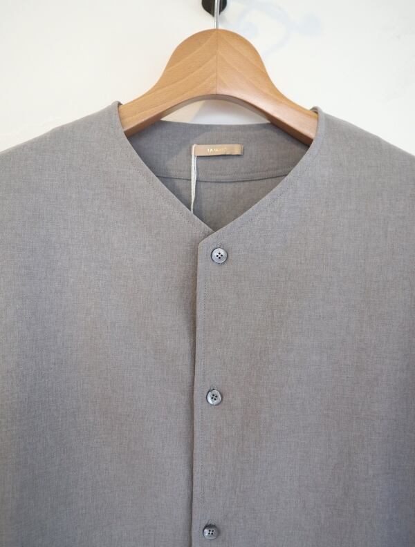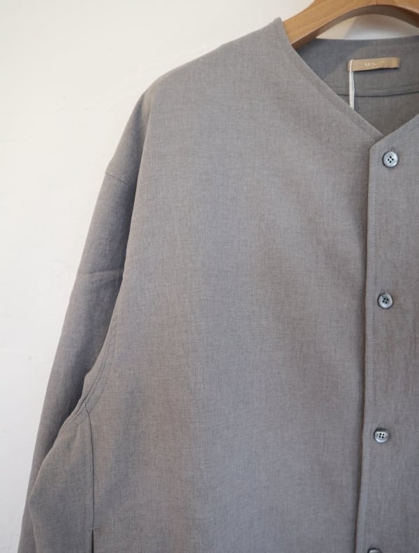 春手前の寒い時期はインナーとして、春から秋は、ボタンを止めずに前を開けて着るとジャケットとして使えます。シワになりにくく、ガシガシ洗えるポリエステル素材。ポリエステル特有の、糸の光沢感を抑える加工をし、膨らみと、麻っぽいナチュラル感を出すためにワッシャー加工を施しています。ラフに使えるリネン風ジャケットといった感じです。シワになりにくくバッグに入れておいたりもでき、夏の涼しい時間帯や冷房対策としても使えるアイテムです。