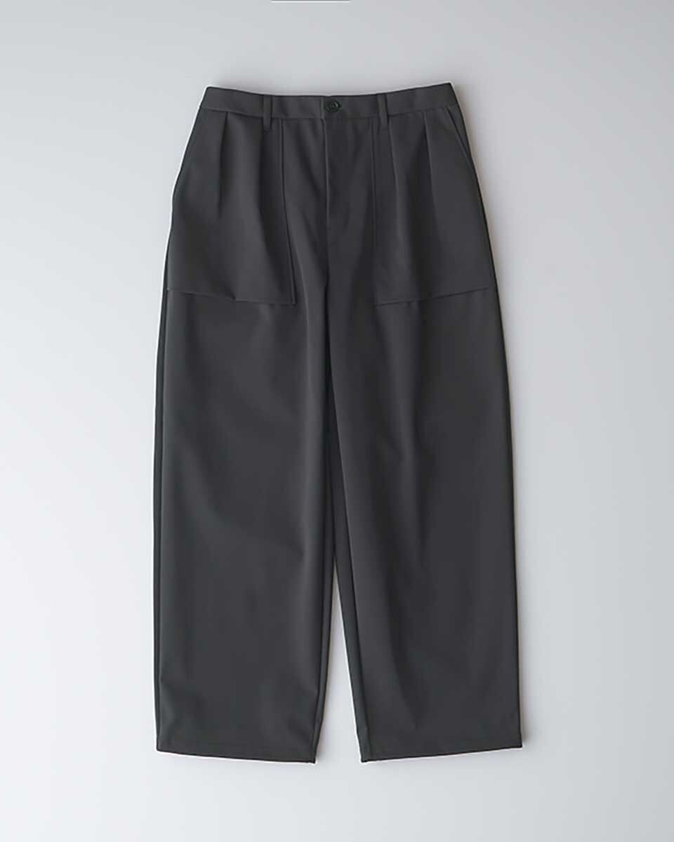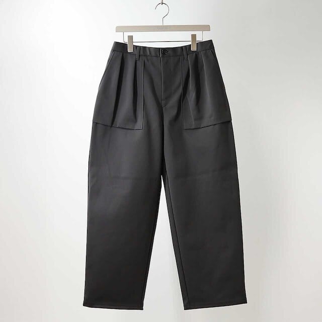 蝶理(株)の高伸縮機能糸TEXBRID®をハイゲージで編み立てたダンボールニット素材を用いたワイドパンツ。軽量、伸縮性に優れながらも、形状記憶的な張り感とコシを併せ持つことで、シルエットがしっかり出る特徴があります。前身頃に底マチ付きのパッチポケットをあしらいカジュアルな雰囲気ではありますが、素材の特性上すっきりと上品に仕立て映えしています。数シーズン継続しているアイテムですが、今シーズンは極力ステッチをなくす事で、よりミニマルに仕上げました。後ろベルトのみにエラスティックバンドを使用したバックイージー仕様。