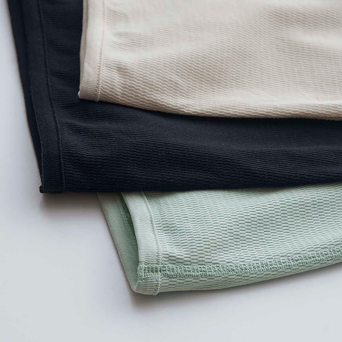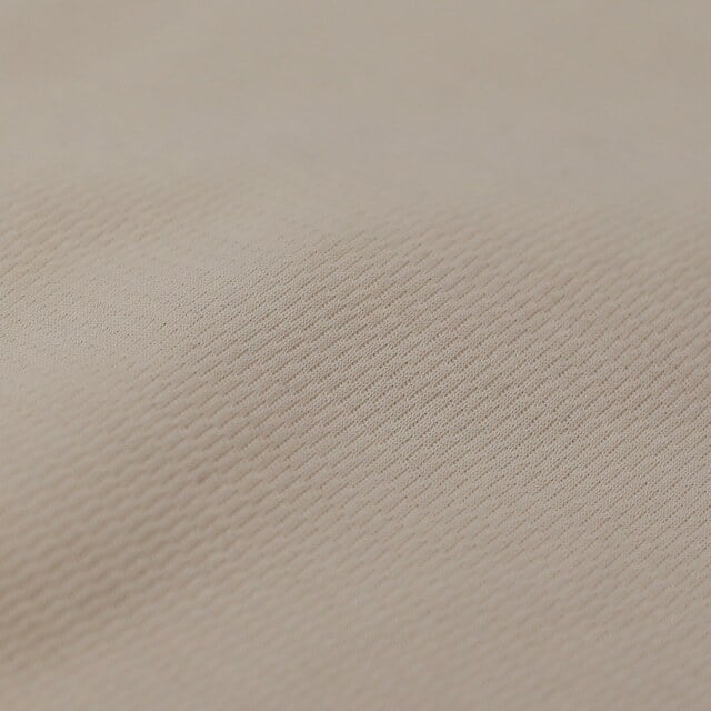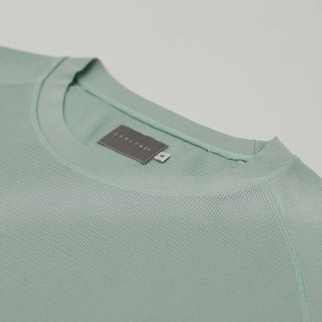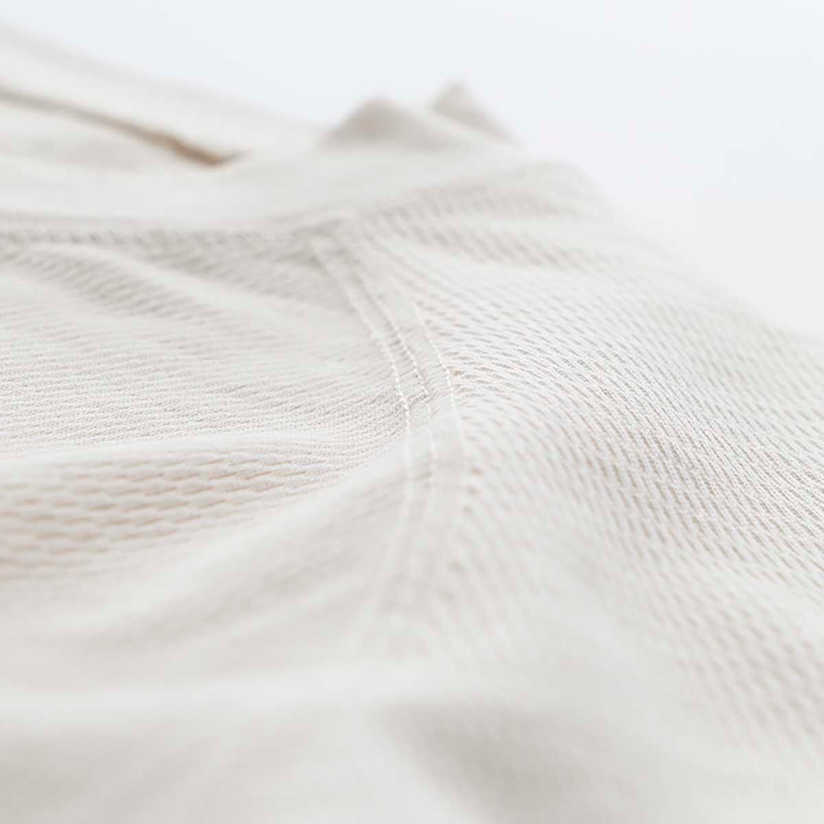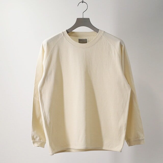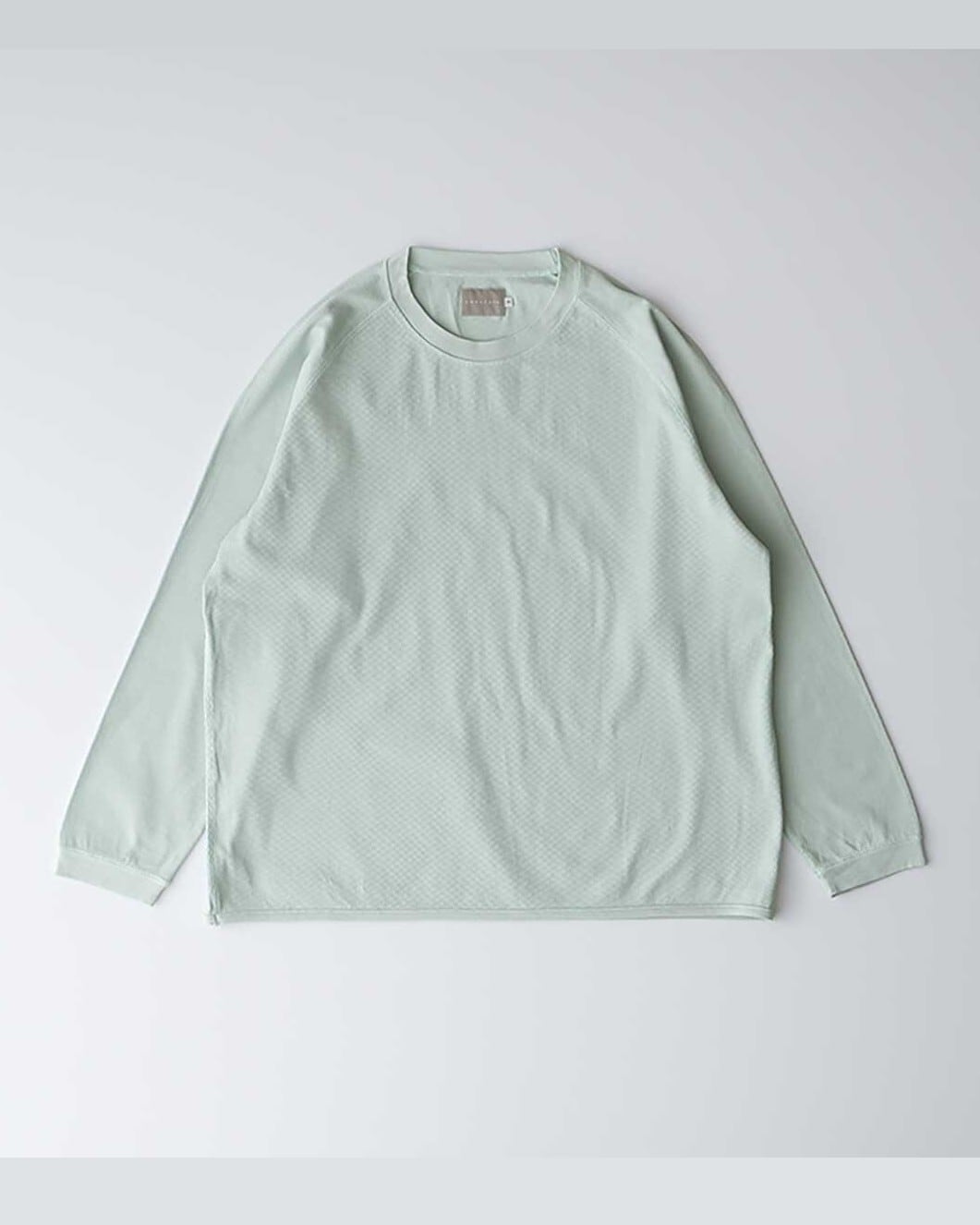 ハニカム組織で編まれたジャージー素材を用いたシンプルなプルオーバー。いわゆるサーマルと呼ばれるベーシックアイテムですが、コンパクトヤーンという特殊な紡績技術を使用して作られる糸を用いる事で、通常よりも毛羽立ちも少なく、糸の太さも均一なため自然な光沢感もあり、カジュアル過ぎない仕上がりになっています。裾始末は通常オーバーロックでラフにされがちですが、フライスのバインダー仕立てにしているので1枚での着用もお薦めです。ロンT以上スウェット未満的なアイテムです。