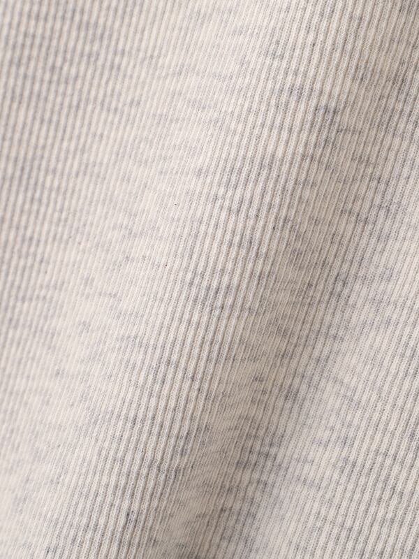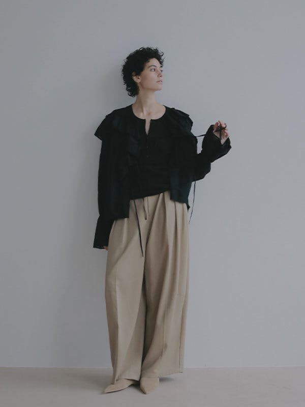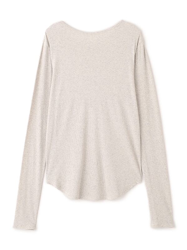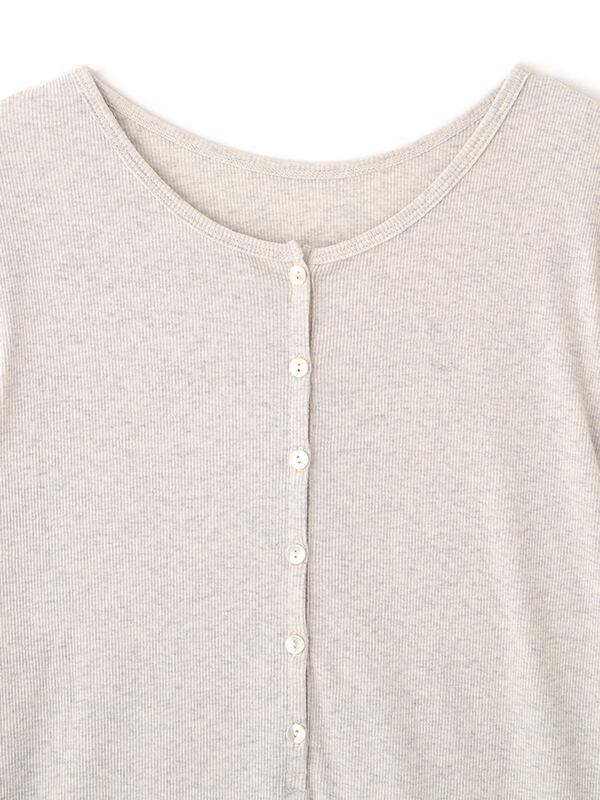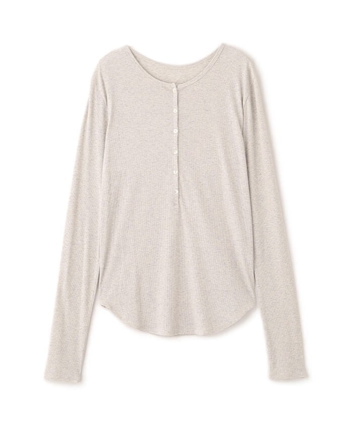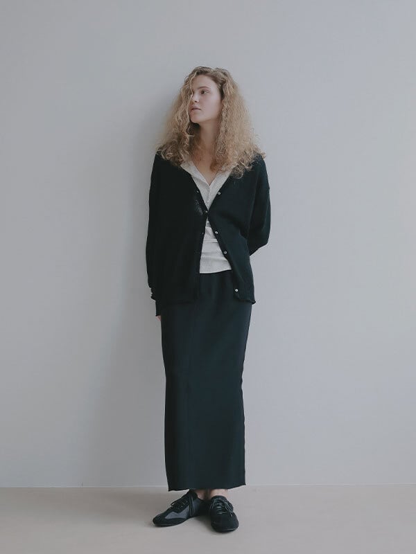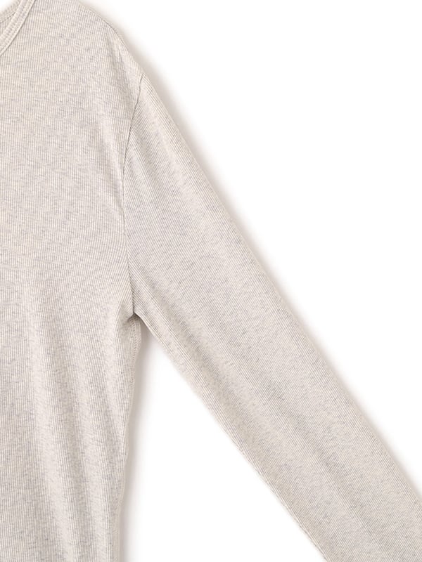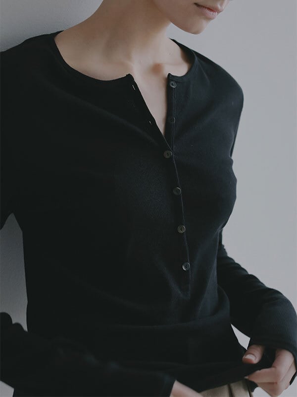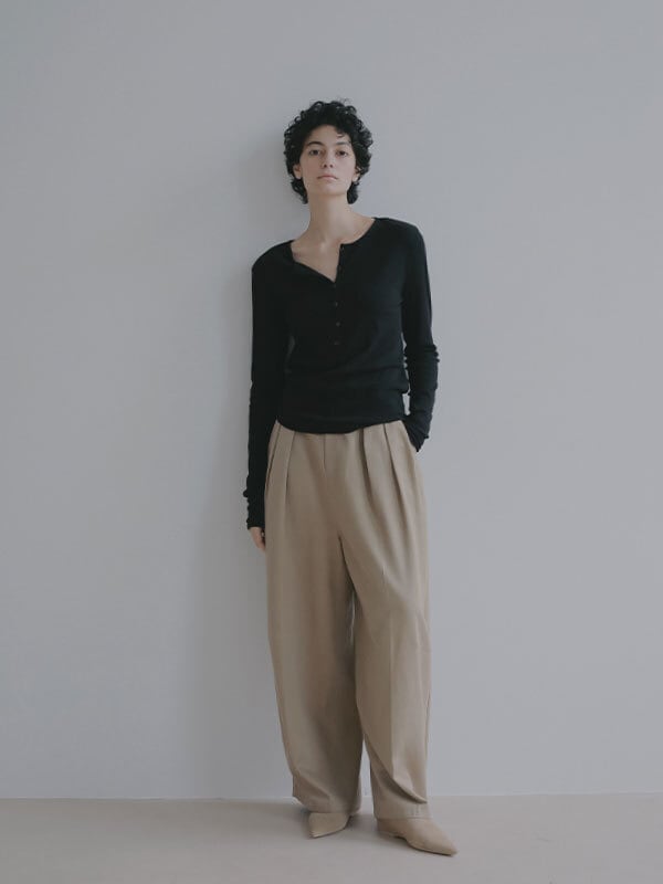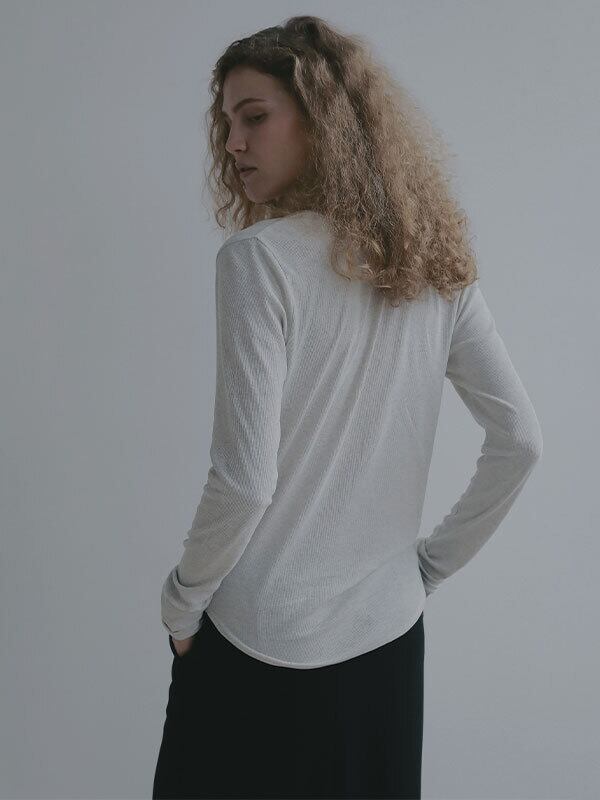 軽やかな空気をまとったような、春らしい透け感が魅力のヘンリーネックトップス。コットンにポリウレタンをわずかにブレンドしたテレコ素材は、シャリっとしたドライタッチが心地よく、 シアー特有の繊細さと日常に馴染む扱いやすさを両立しています。やわらかく伸びる生地が身体に寄り添いながらも、肌に張りつきすぎない絶妙なフィット感。ネックラインや身幅、袖幅など細かな分量を丁寧に整えることで、シンプルな一枚でも立体的なニュアンスが生まれ、 エフォートレスなムードが漂います。フロントのボタンを少し開けて抜け感を出したり、留めてクリーンに見せたりと、着こなしの幅も自在。素材の透けを楽しむスタイリングはもちろん、レイヤードスタイルにも活躍します。一枚で着ても、重ねても美しく決まるトップスは、季節の変わり目にそっと寄り添ってくれる存在です。