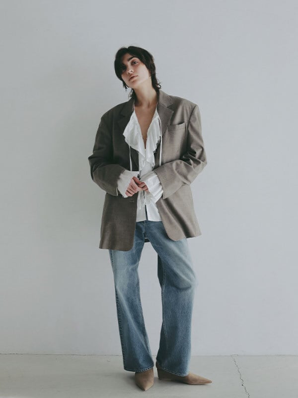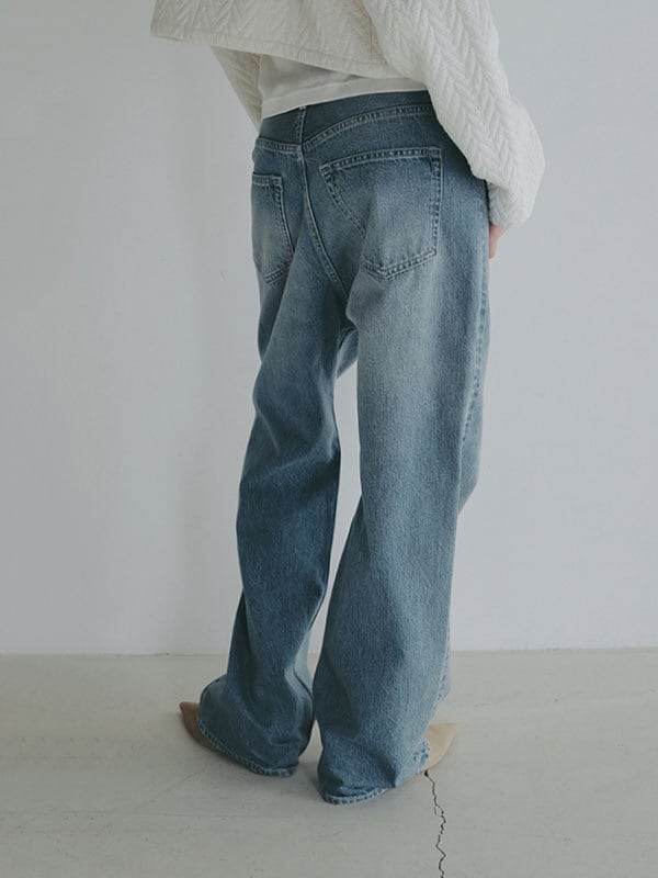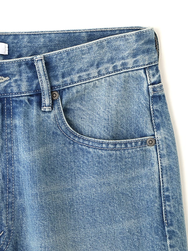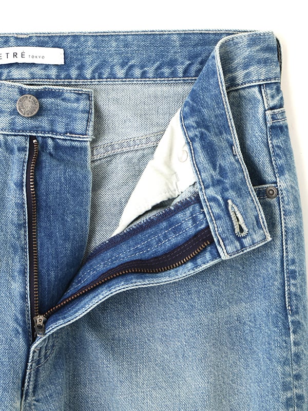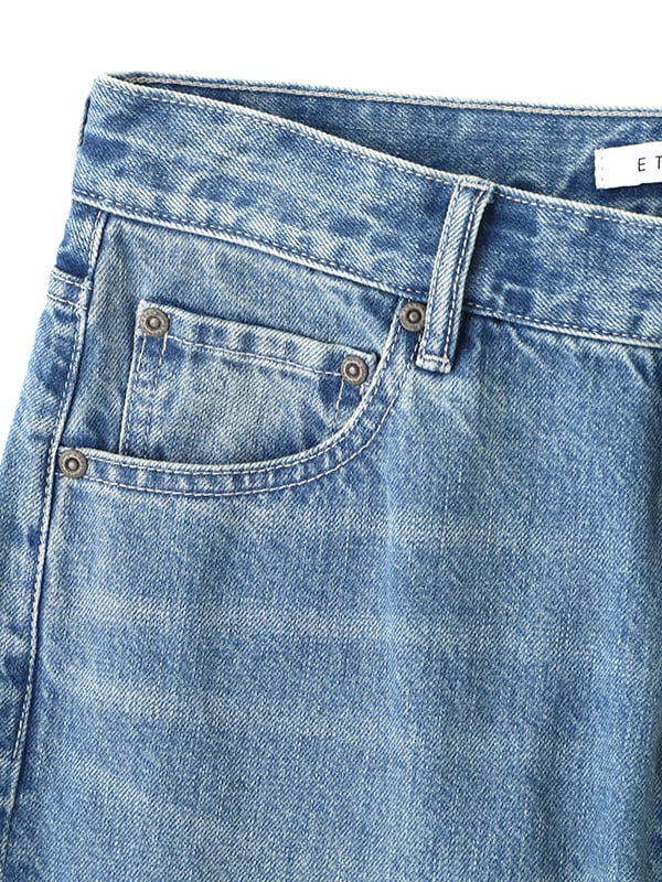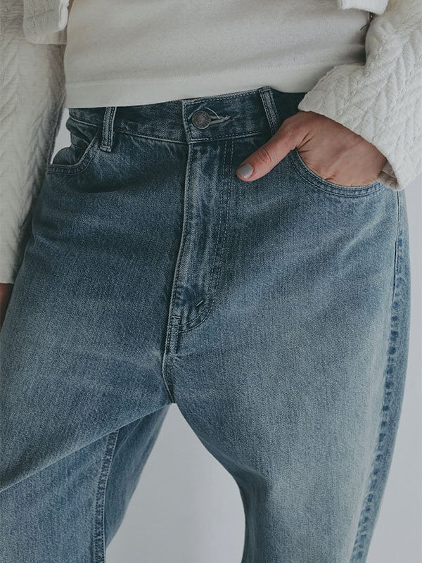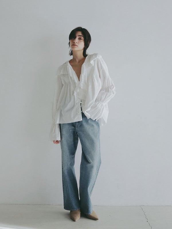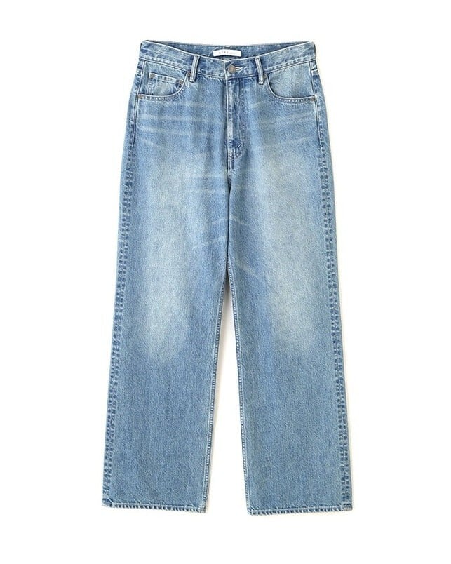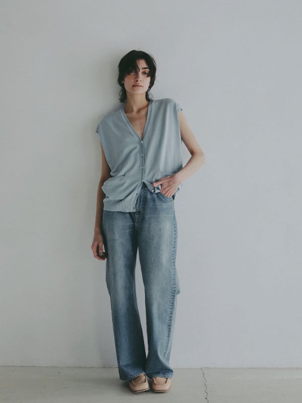ほどよいヴィンテージ感をまとった、絶妙な加工が魅力のハイライズストレートデニム。綿100%のデニム生地を使用、ほど良い重さと自然な落ち感を兼ね備えた風合いが特徴。しっかりとした肉感がありながらも硬すぎず、穿き込むほどに身体に馴染んでいく素材感です。春らしい強めのブリーチカラーは奥行きのある色落ちを表現し、ブラックはシックで洗練された印象に仕上げる等、それぞれ異なる表情を楽しめるのも魅力。さりげなく存在感を放つオリジナルのタックボタンなど、細部にまでこだわりを詰め込んだ一本です。深めに設定したライズと長めの股下が、腰位置を高く見せながら縦のラインを強調し、すっきりとしたストレートシルエットを構築。ヒップから裾にかけてはほどよくゆとりを持たせることで、脚のラインを拾いすぎず、抜け感のあるバランスに仕上げています。トップスをタックインした際にもウエスト周りが美しく決まり、フロントやバックスタイルまで計算されたデザイン。ベーシックでありながらも、加工感やシルエットでさりげない個性を感じさせる一着です。フェミニンなフリルブラウスや軽やかなトップスと合わせたカジュアルなスタイルはもちろん、 コンパクトなカットソーやジャケットを合わせたクリーンな着こなしにも好相性。着こなし次第で幅広いスタイリングを楽しめるデニムパンツです。